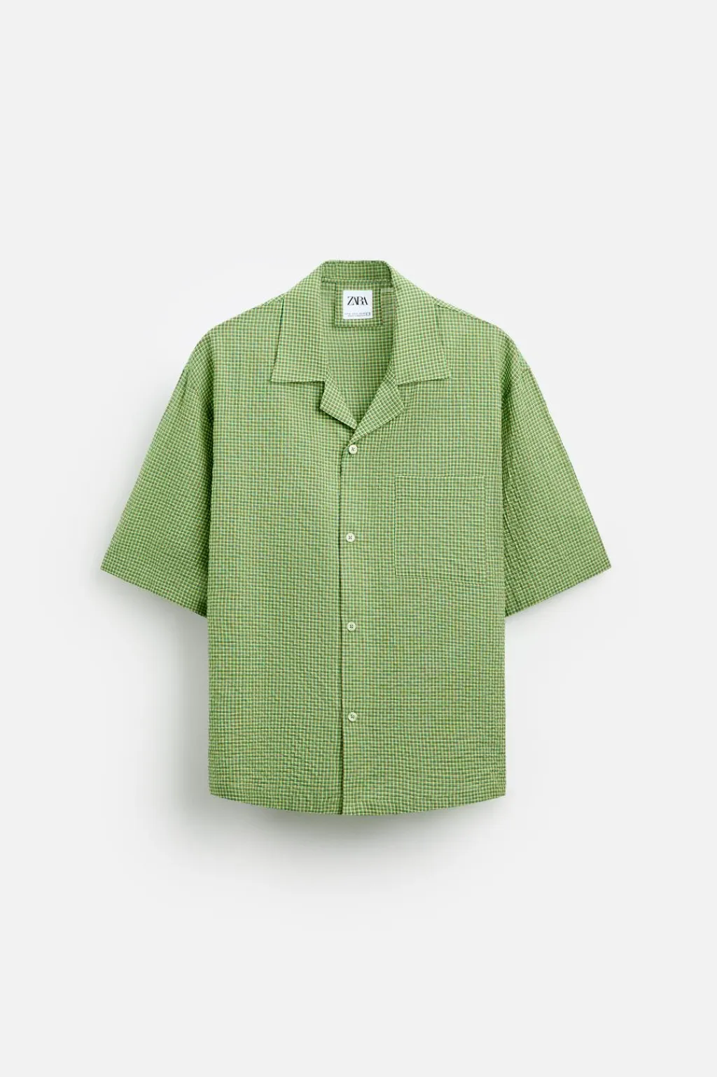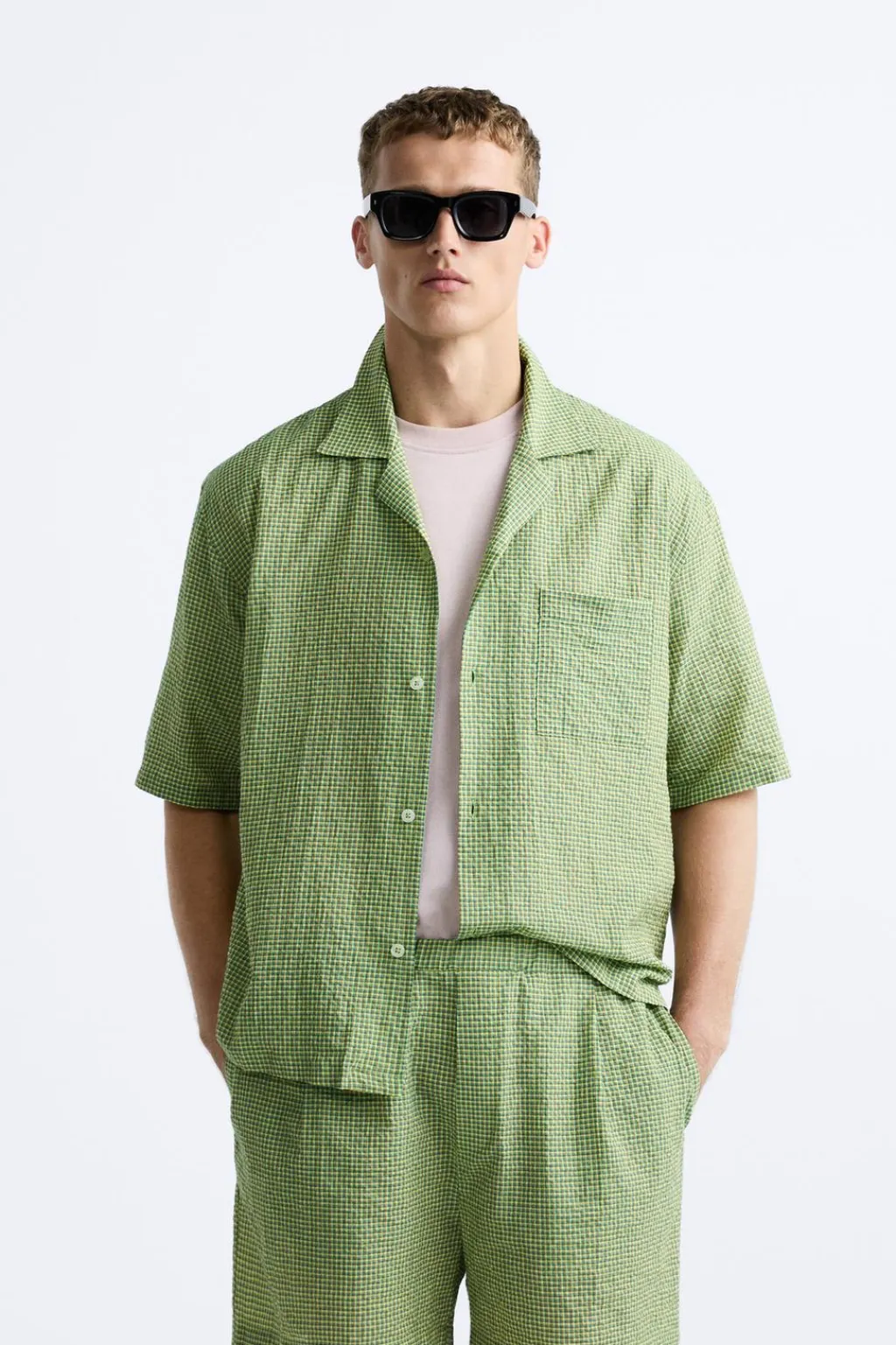 Camisa relaxed fit confeccionada en tejido ligero. Cuello bowling y manga corta. Bajo con aberturas laterales. Cierre frontal de botonadura.