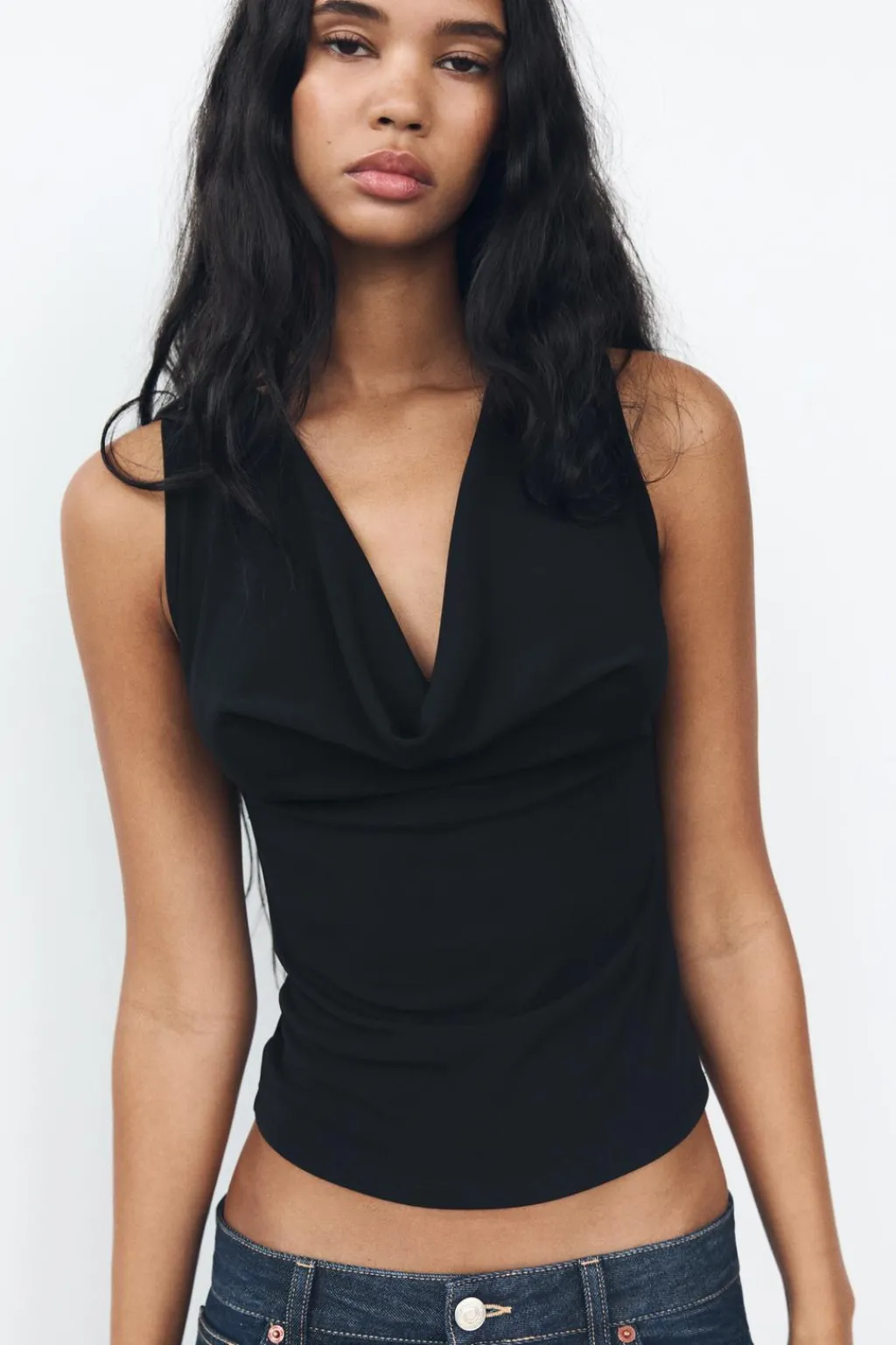 Camiseta de escote drapeado fluido y manga sisa.