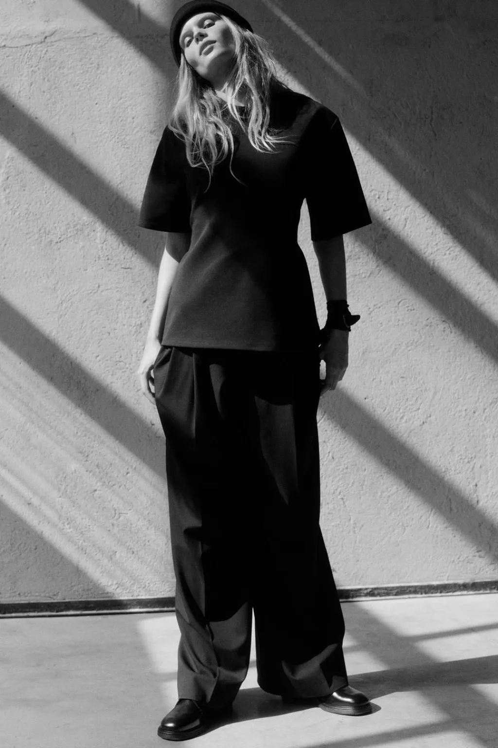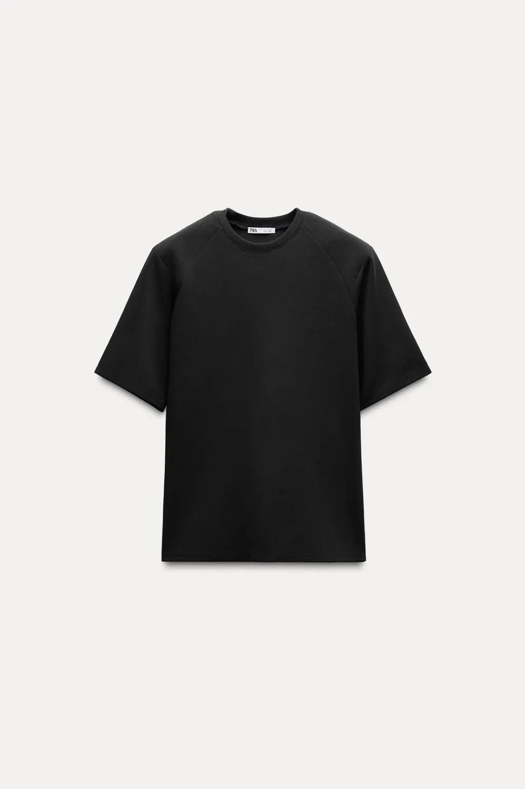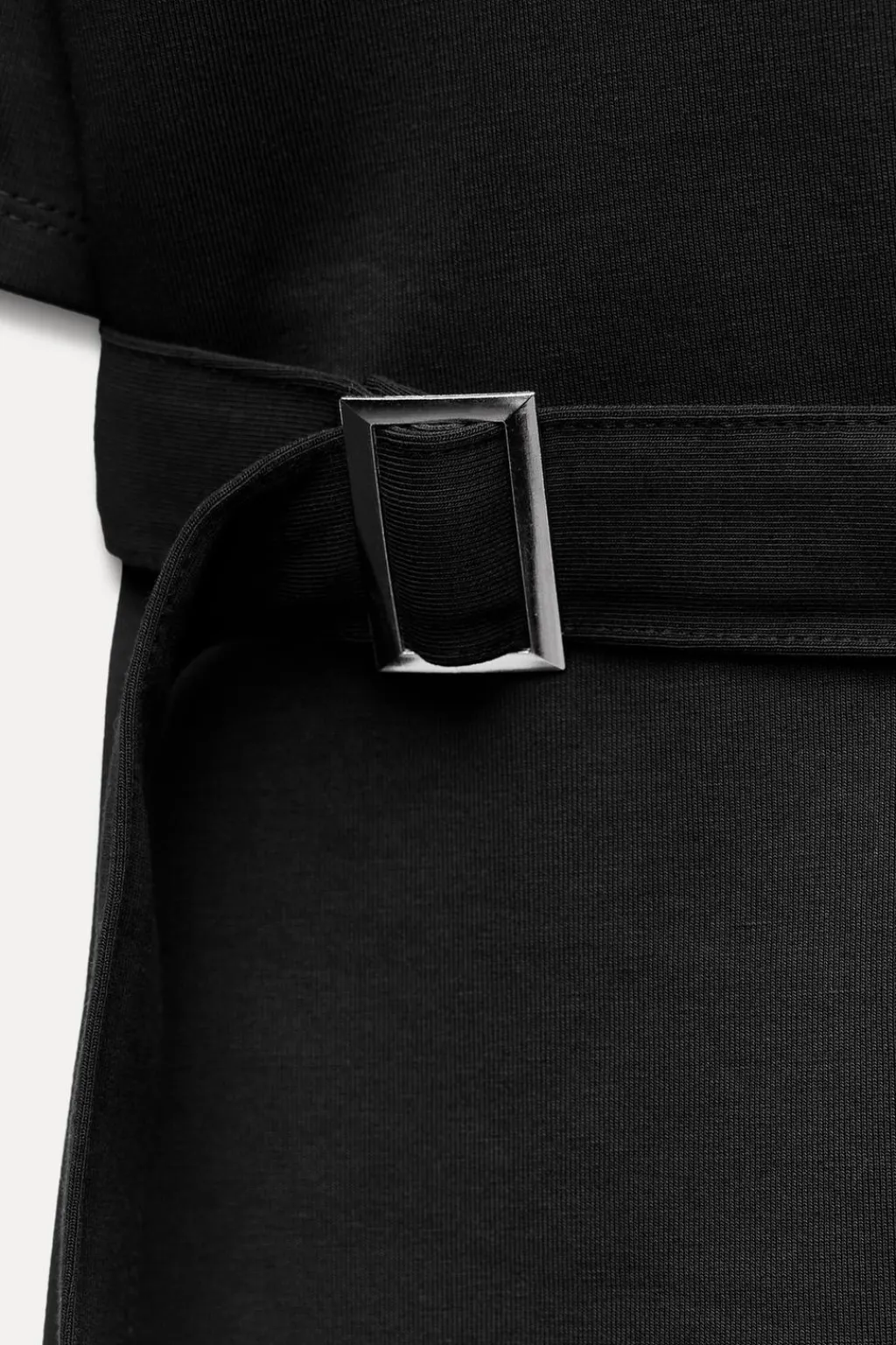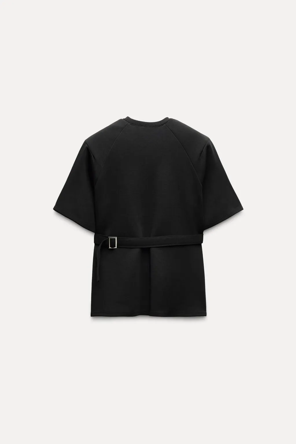 Camiseta de cuello redondo y manga corta con hombreras. Detalle de cinta en mismo tejido ajustable con hebilla metálica.