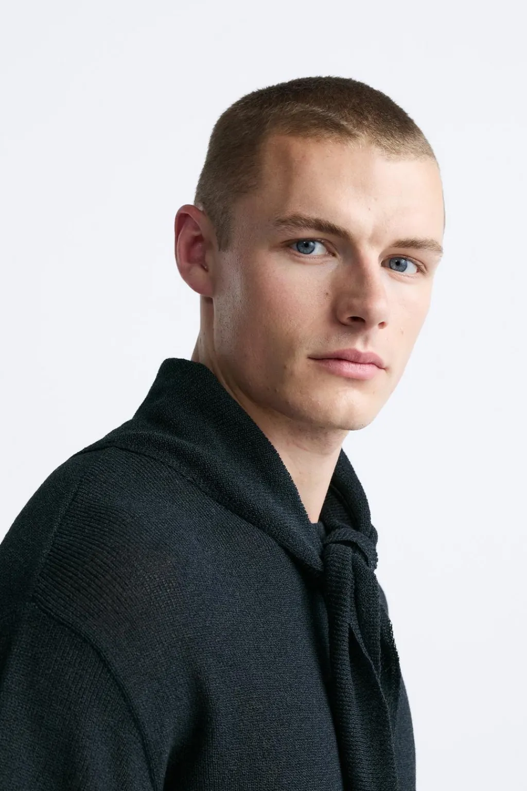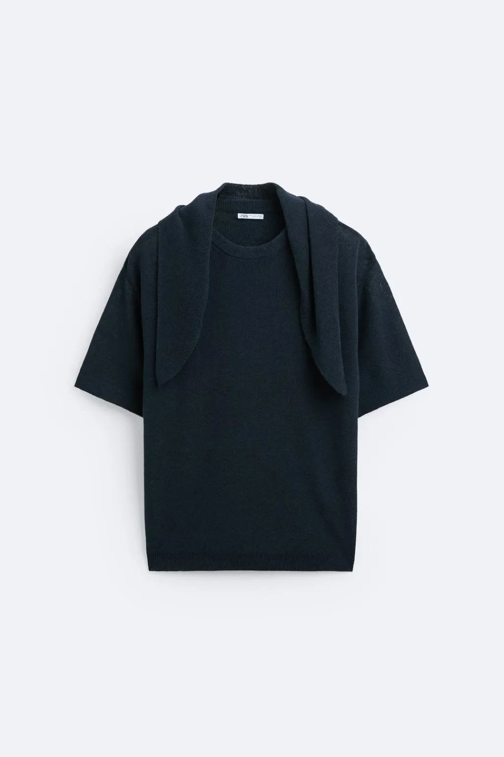 Camiseta de punto tejida en hilatura con mezcla de algodón. Cuello redondo con detalle de aplicación de pañoleta en el mismo tejido. Manga corta. Acabados en rib.