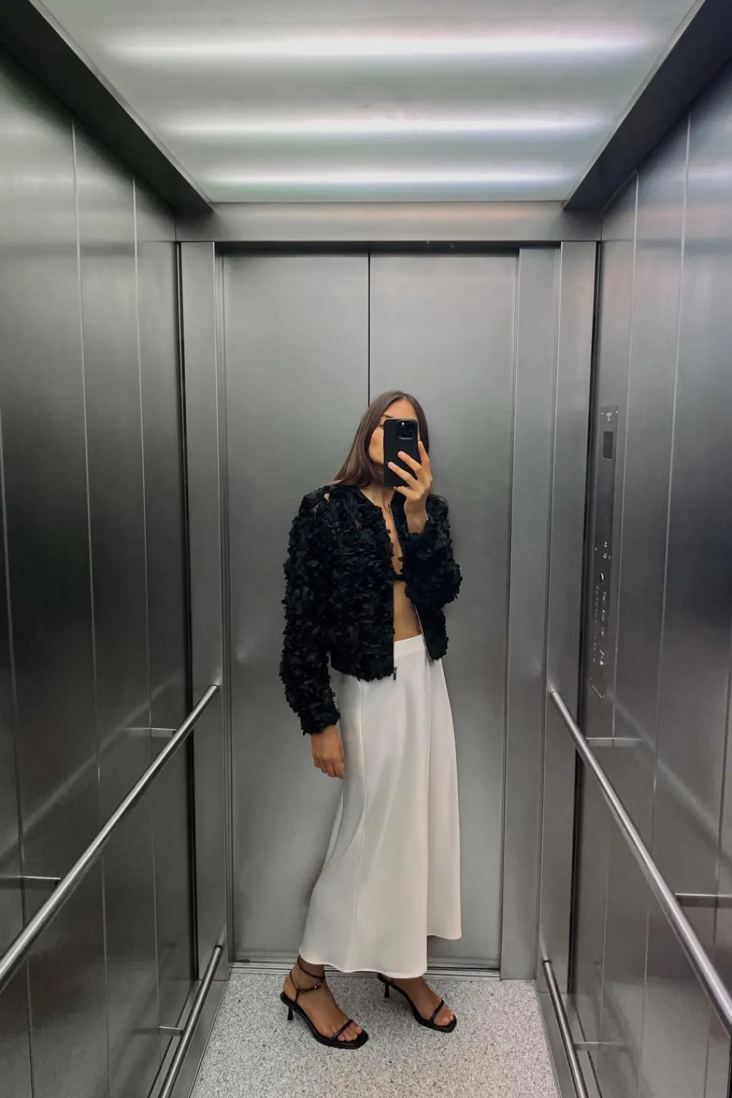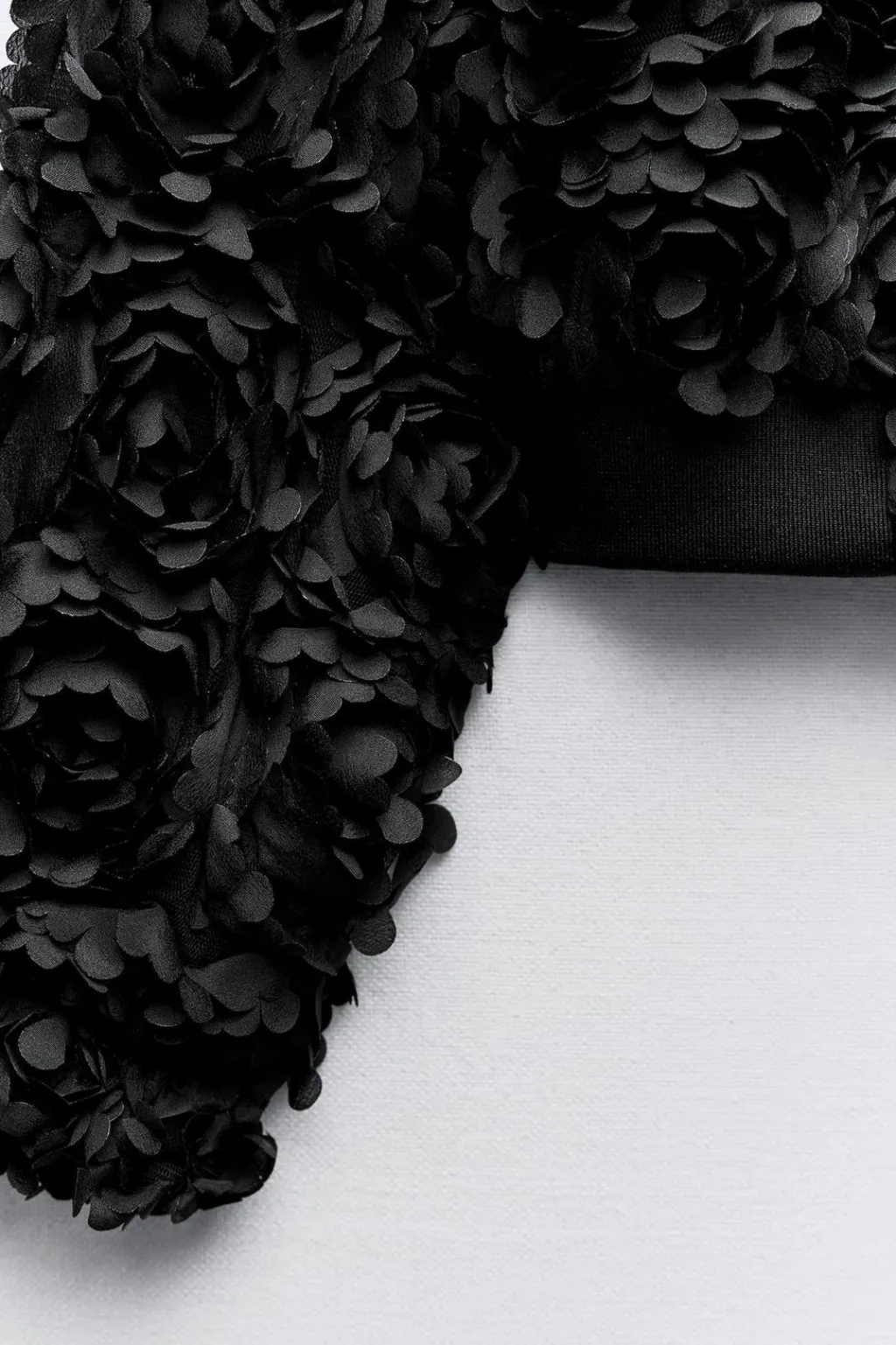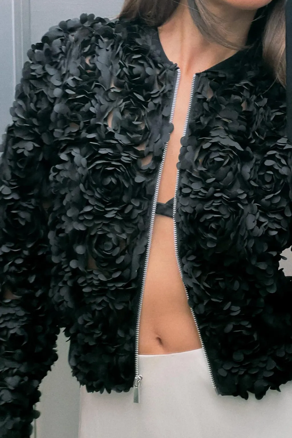 Cazadora de cuello redondo y manga larga. Detalle de tejido en estructura en forma de flor. Cierre frontal con cremallera metálica.