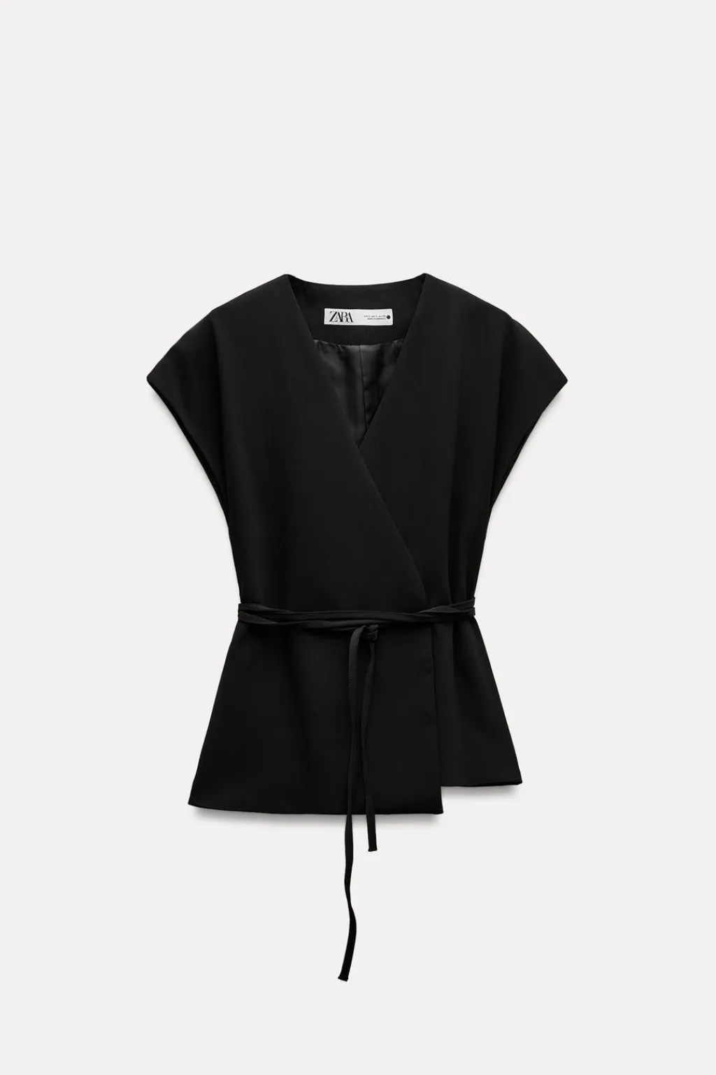 Chaleco de escote pico cruzado y manga corta. Cinturón en mismo tejido ajustable con lazadas. Forro interior a tono. Cierre frontal con botones.