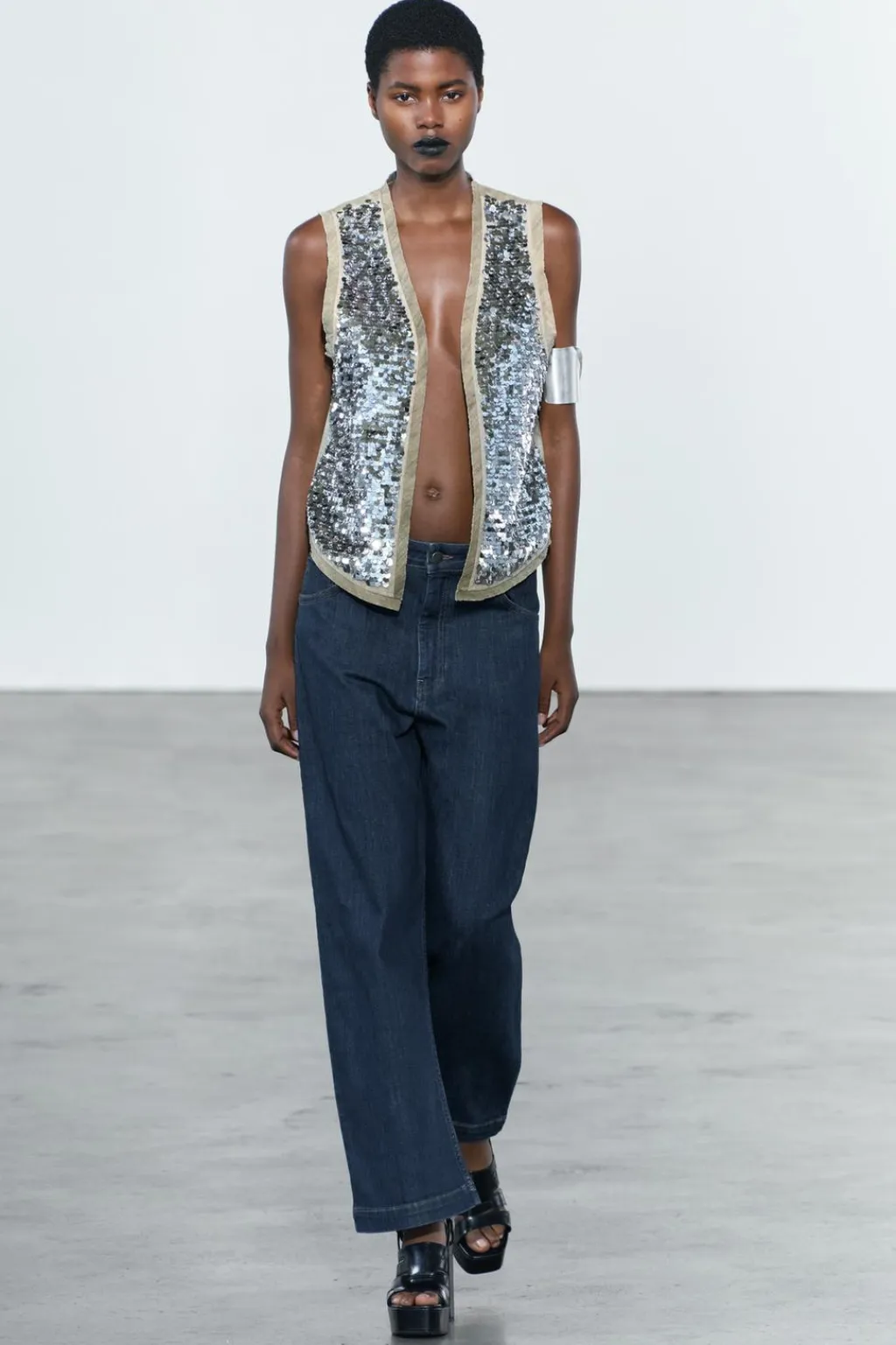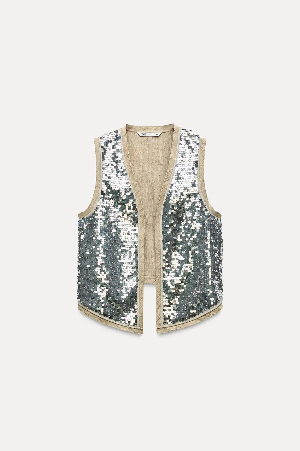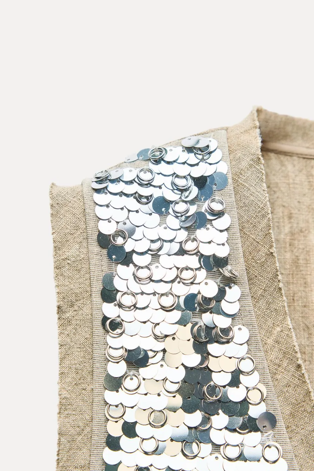 Chaleco abierto confeccionado en hilatura con mezcla de ramio y con algodón 25%. Manga sisa. Detalle de aplicación de lentejuelas. Bajo asimétrico.