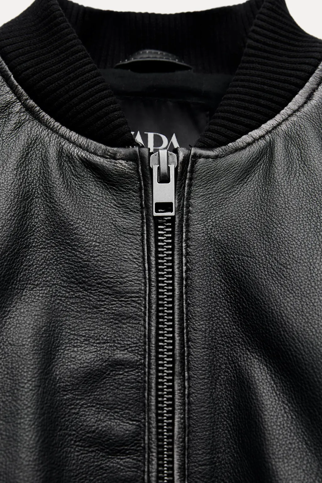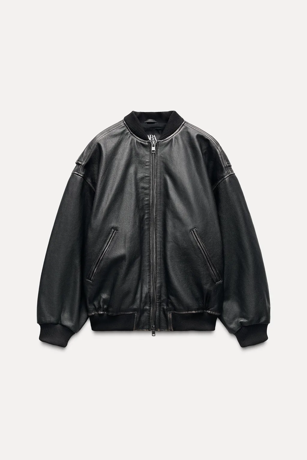 Chaqueta bomber confeccionada en piel 100 % con efecto desgastado. Cuello redondo y manga larga acabada en puño. Bolsillos delanteros de vivo. Cierre frontal con cremallera metálica.