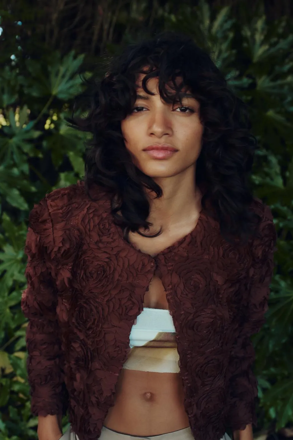 Chaqueta de cuello redondo y manga larga. Detalle de tejido en estructura en forma de flor. Cierre frontal con botón a presión.