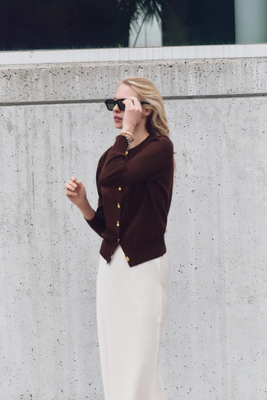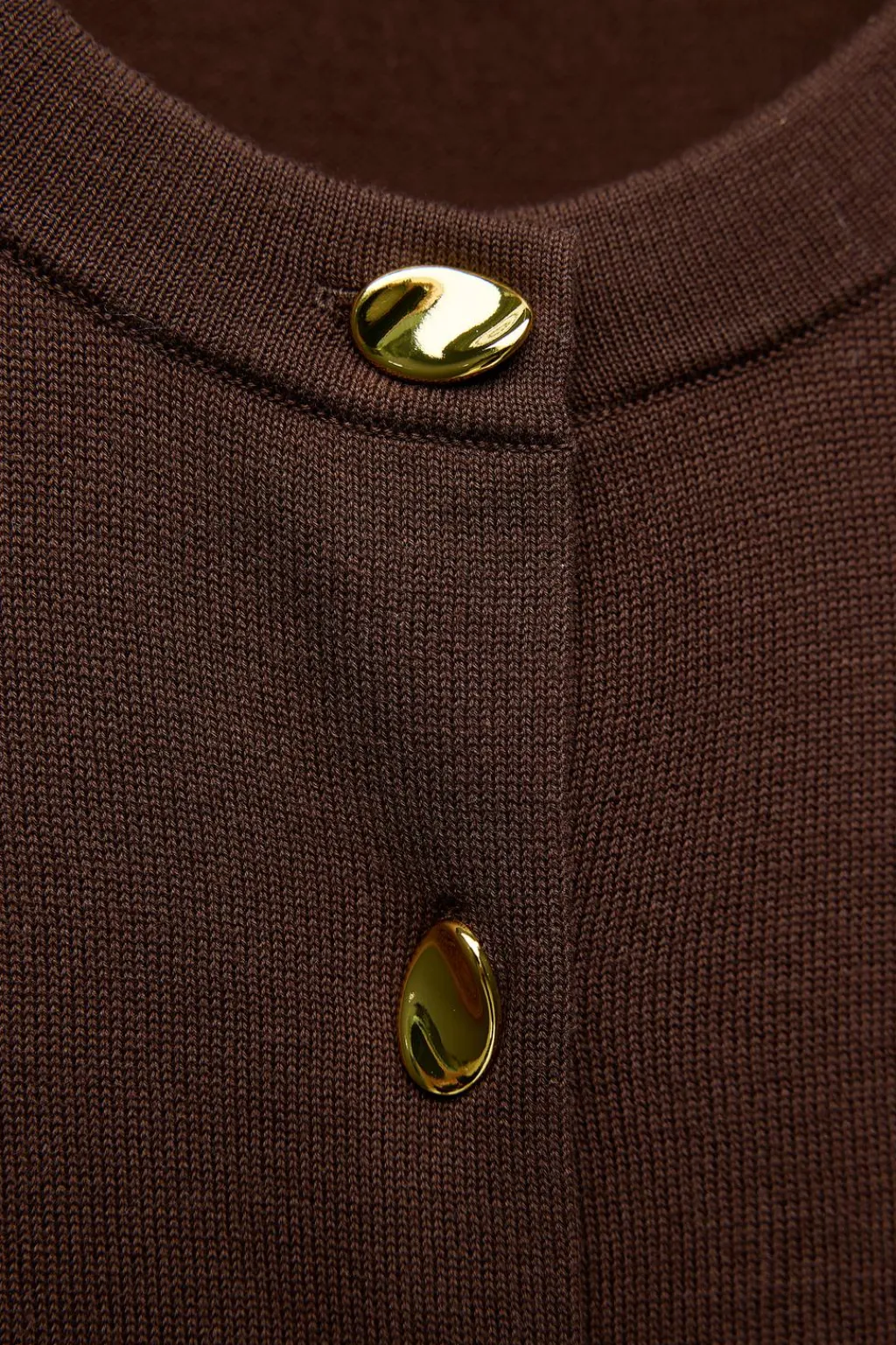 Chaqueta de cuello redondo y manga larga. Cierre frontal con botones dorados.