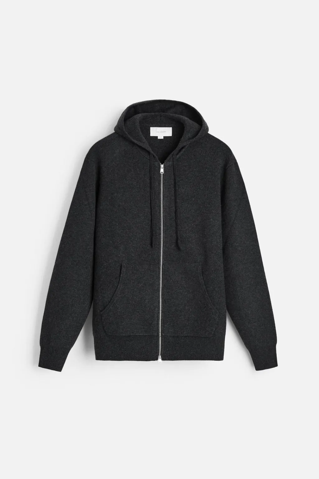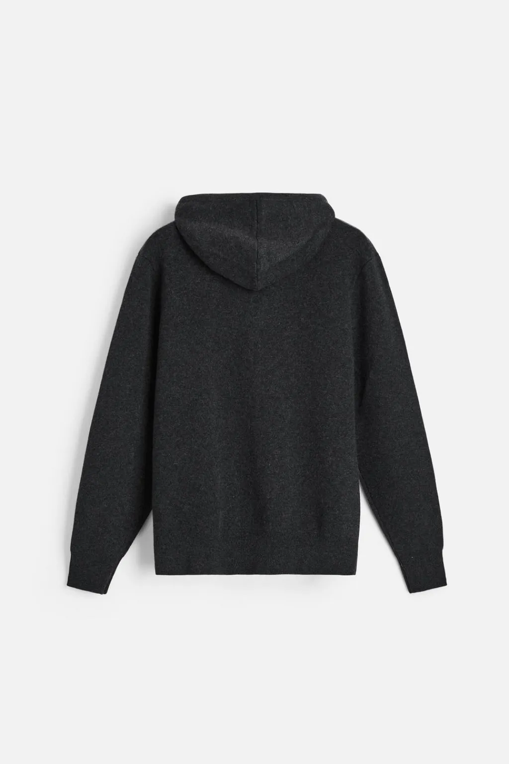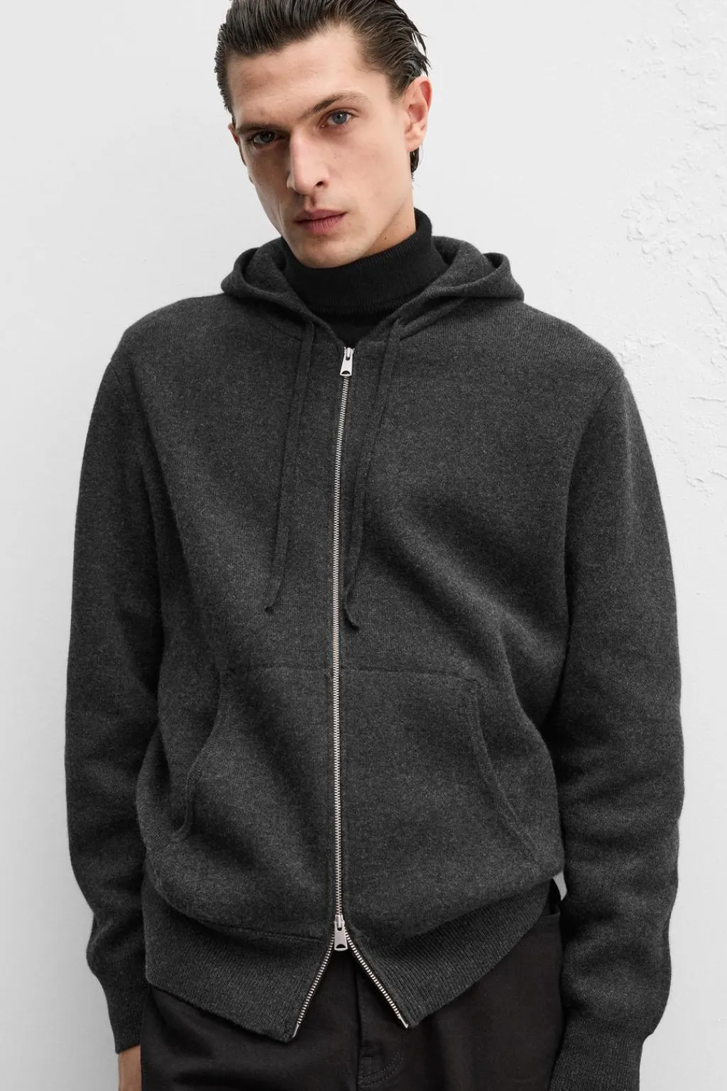 Chaqueta hoodie de punto tejida en hilatura con mezcla de cashmere. Cuello con capucha ajustable y manga larga. Bolsillos frontales tipo canguro. Acabados en rib. Cierre frontal con cremallera.