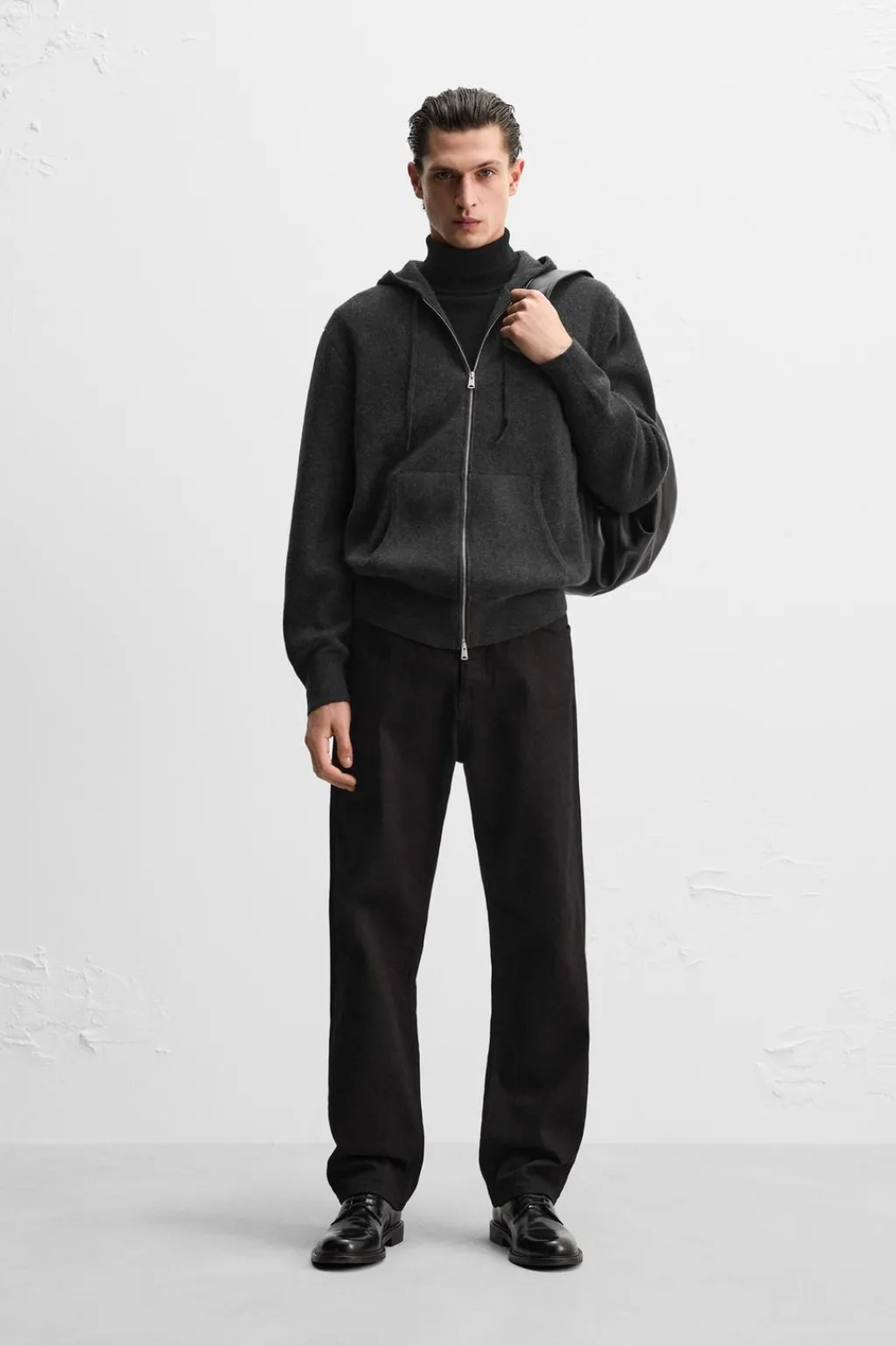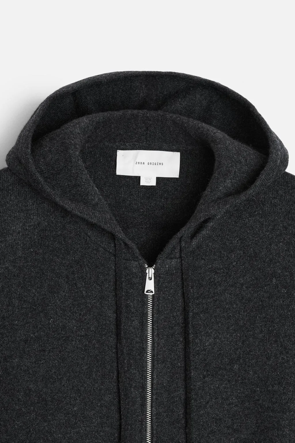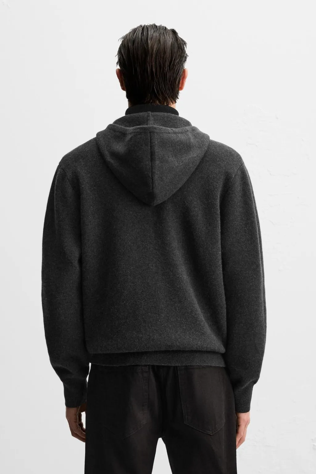 Chaqueta hoodie de punto tejida en hilatura con mezcla de cashmere. Cuello con capucha ajustable y manga larga. Bolsillos frontales tipo canguro. Acabados en rib. Cierre frontal con cremallera.