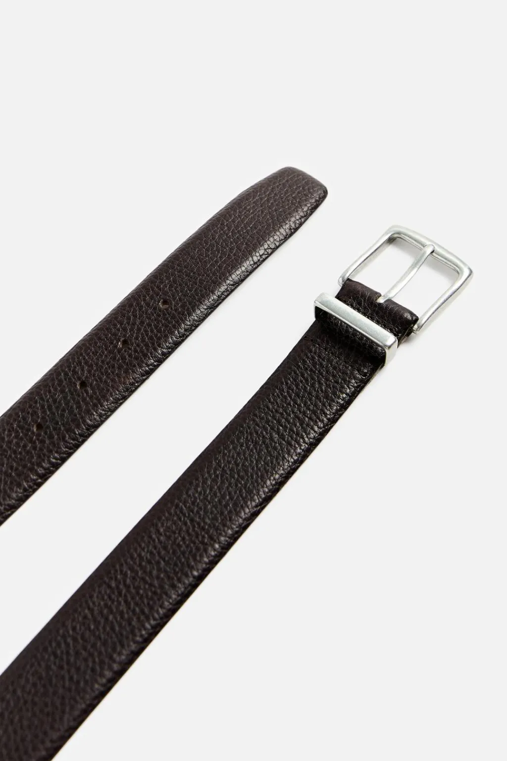 Cinturón confeccionado en piel de vaqueta, flexible y resistente. Interior acabado nobuck combinado a contraste. Cantos acabado mate. Cierre con hebilla metálica y pasador.