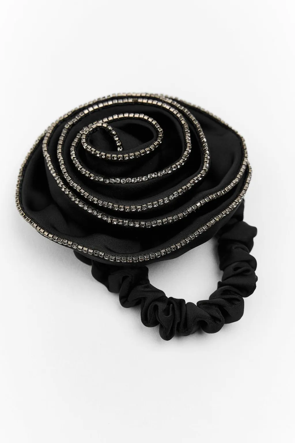 Coletero con goma elástica. Detalle de flor en relieve confeccionada en tejido satinado y aplicación de brillos a contraste.