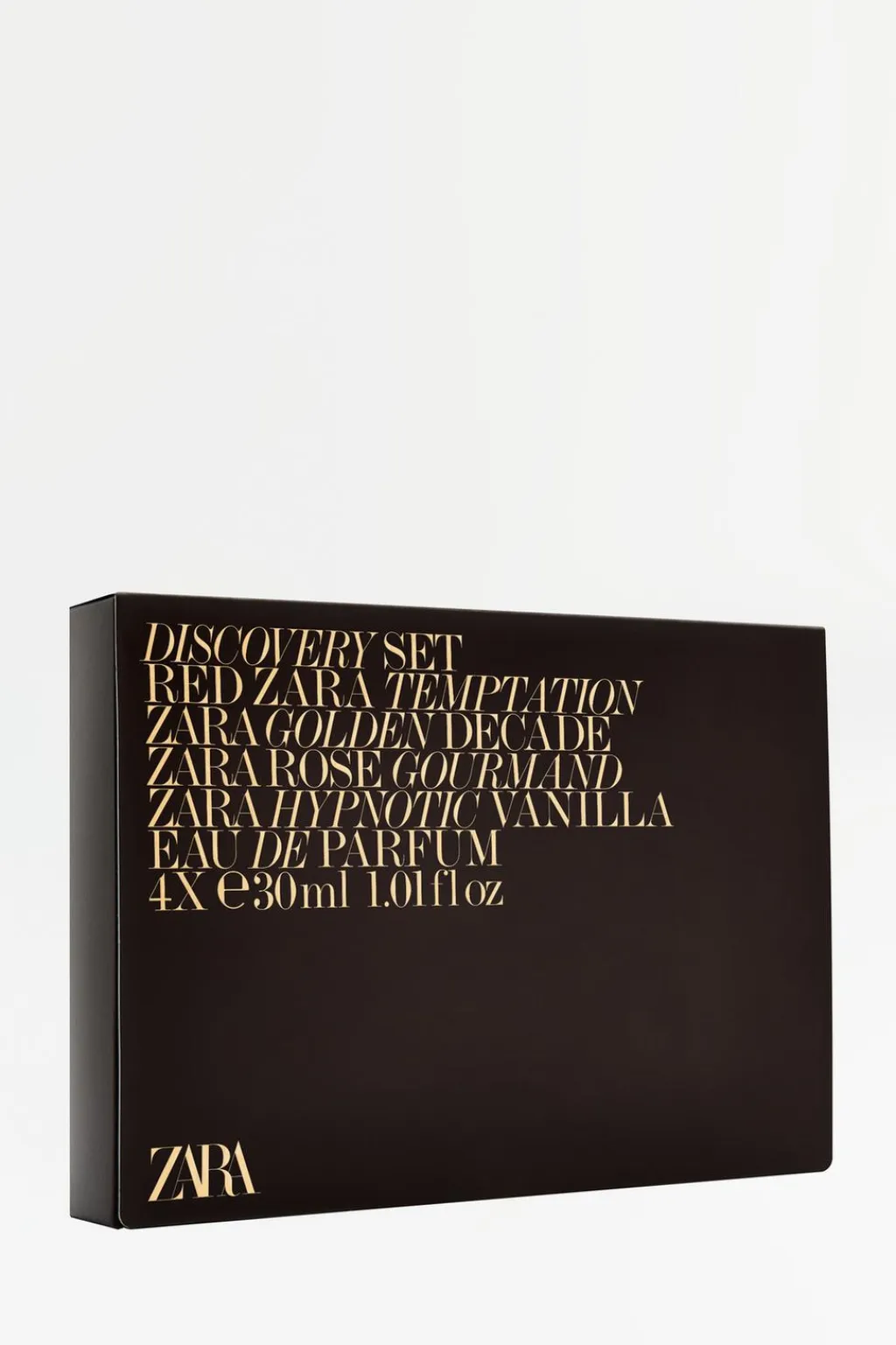Eau de parfum set. Uno de nuestros bestsellers en edición Navidad, perfectas para regalar. Disfruta de la colección Chapters de Zara en un formato de 30 ml, diseñado para quienes desean prolongar la experiencia de cada aroma. Incluye: Red Temptation con ámbar y frutos dulces, Golden Decade con maderas y especias florales, Rose Gourmand con rosas delicadas y notas dulces, e Hypnotic Vanilla con vainilla cremosa y almizcle. Una selección sofisticada y cautivadora