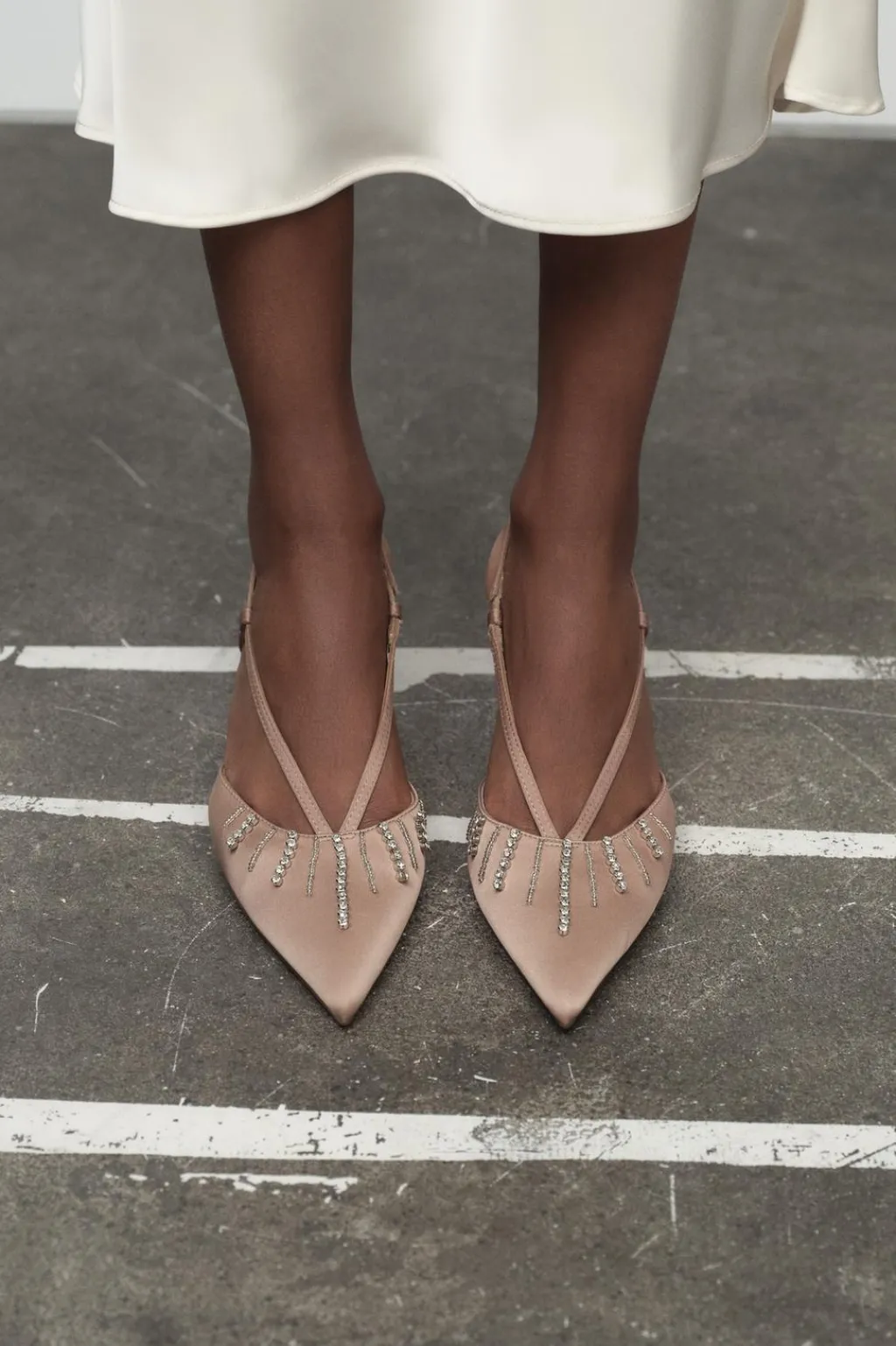 Zapato tipo destalonado tacón. Detalle de pedrería en la parte delantera. Tira trasera ajustable. Acabado en punta.