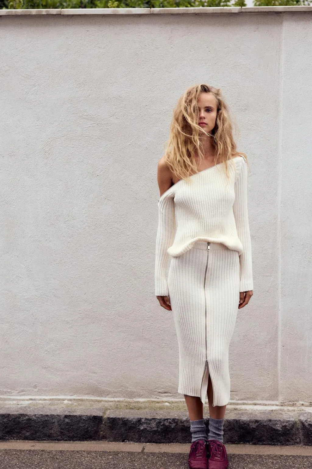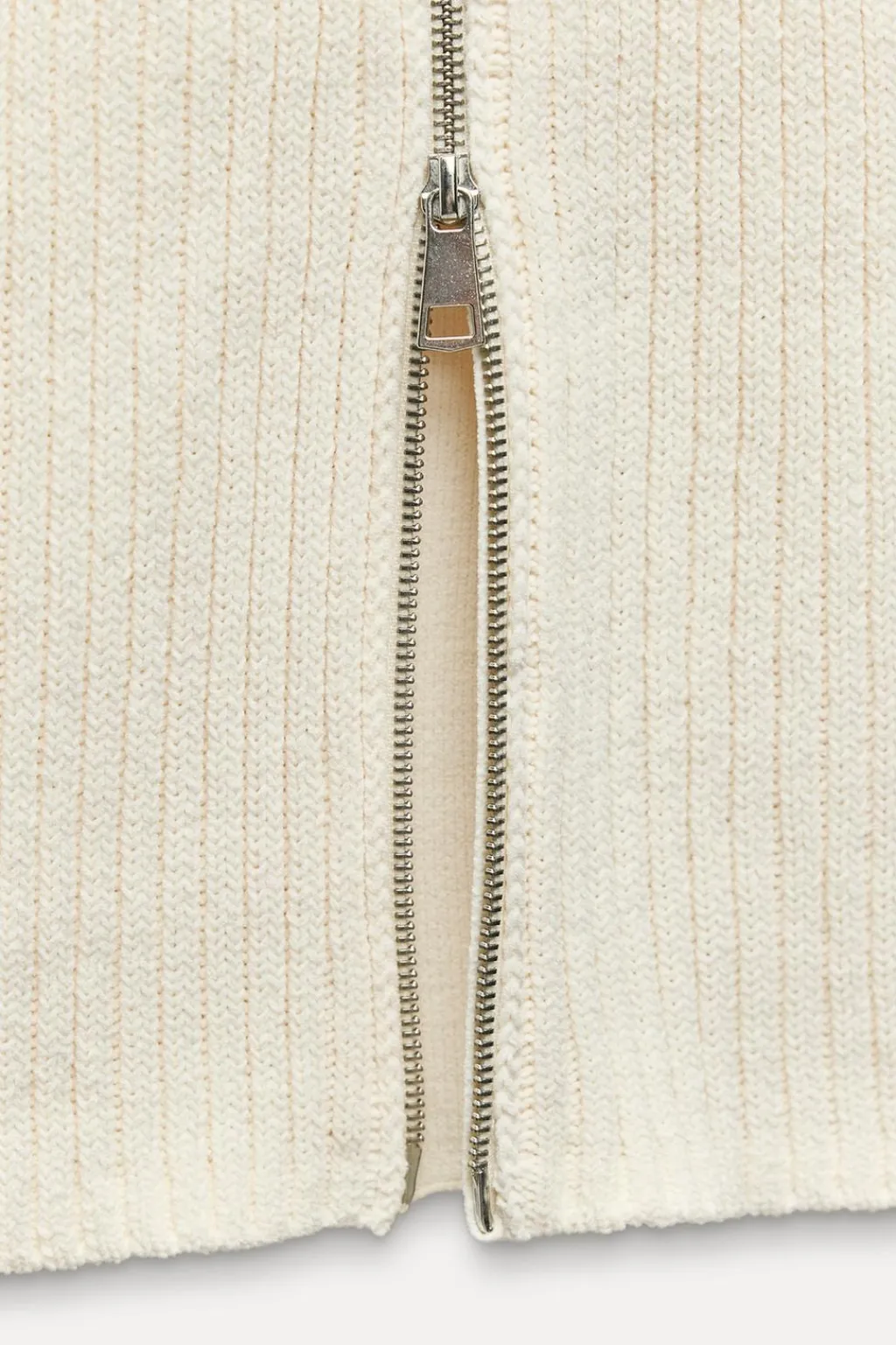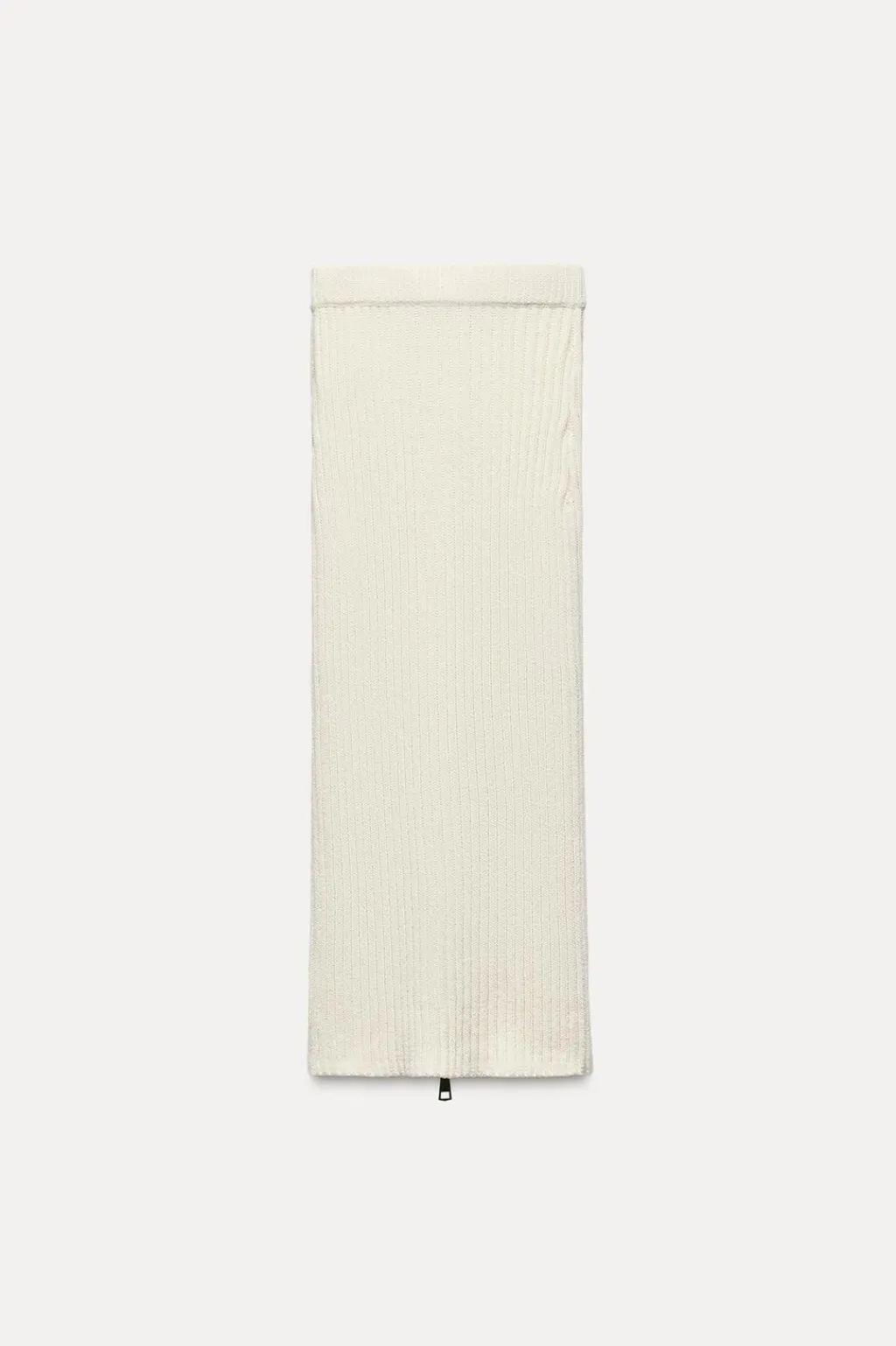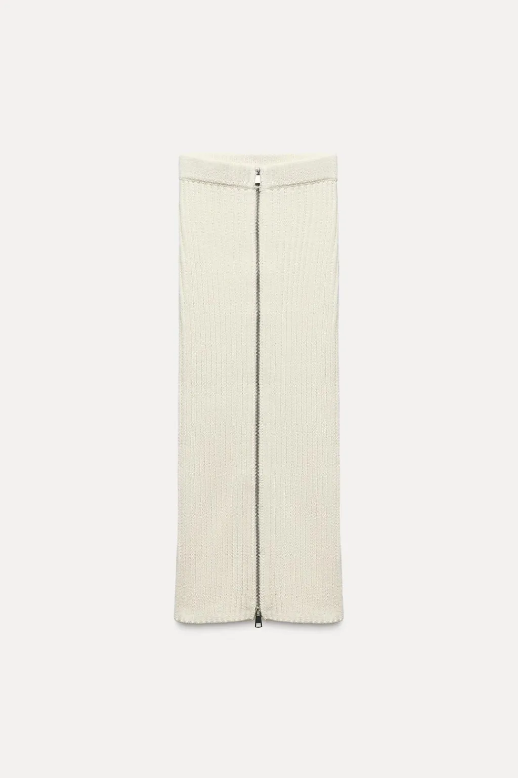 Falda midi de tiro alto con cintura elástica. Cierre frontal con cremallera metálica.