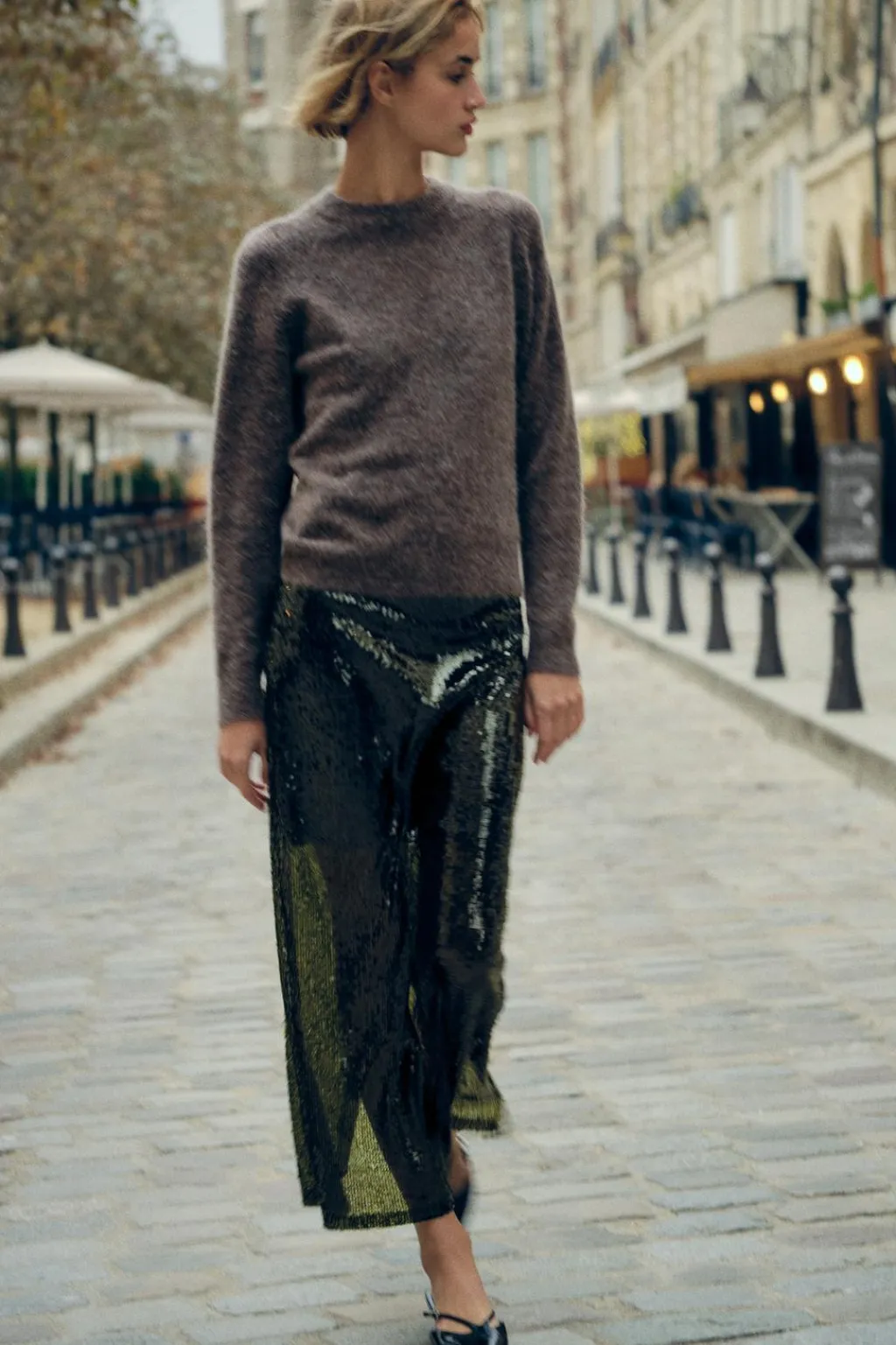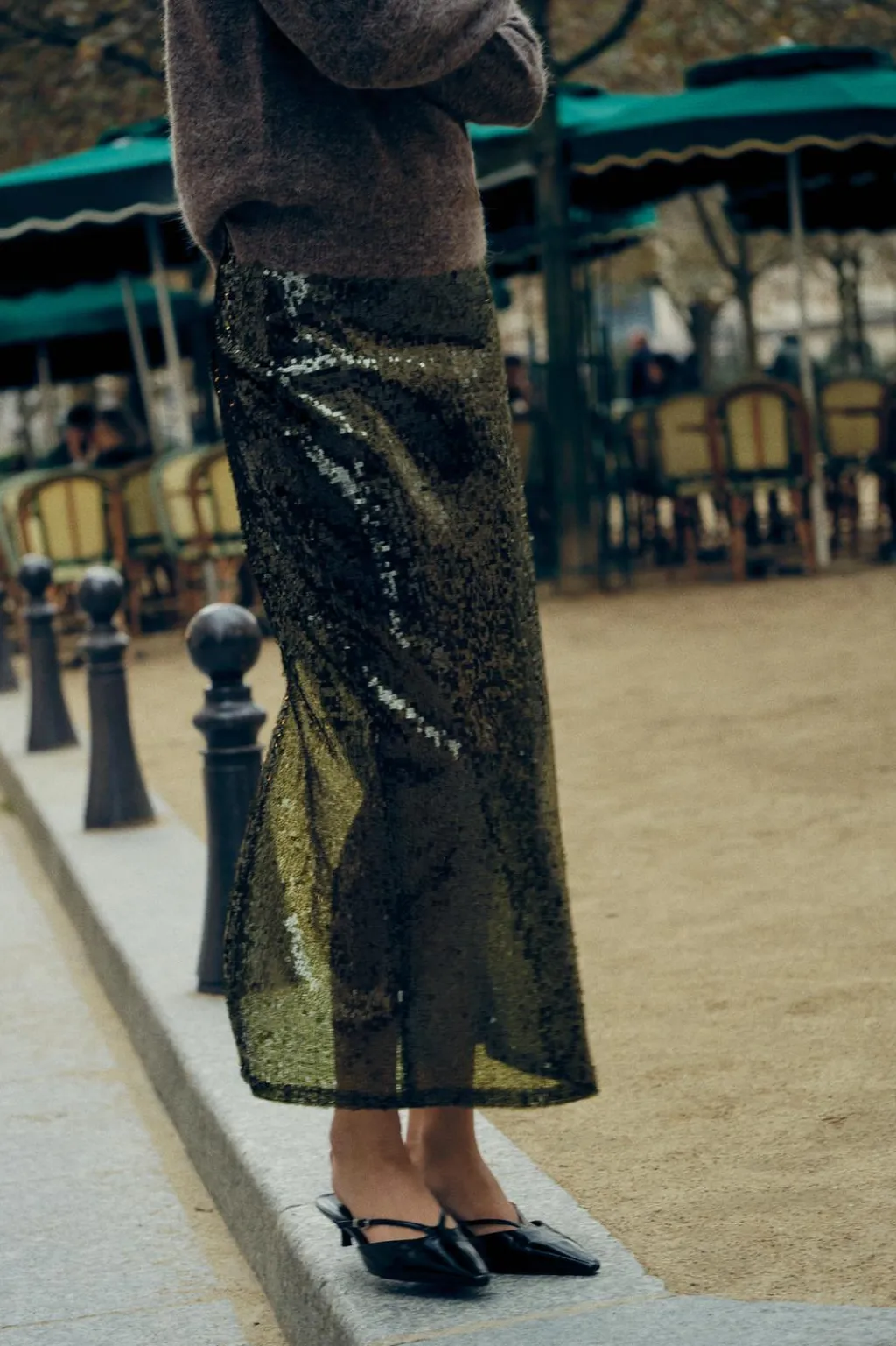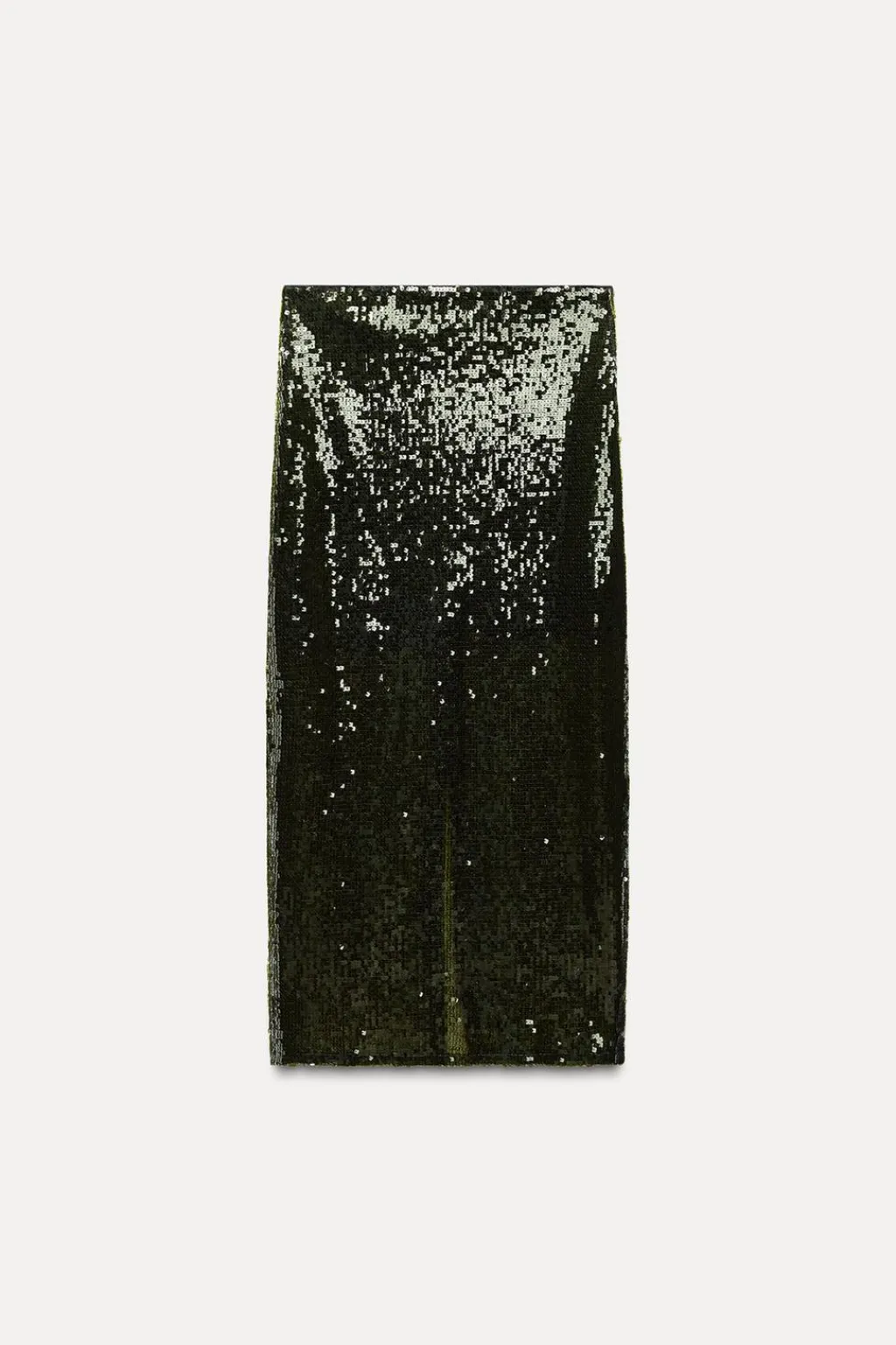 Falda de tiro alto con lentejuelas. Forro interior. Bajo con abertura en espalda. Cierre trasero con cremallera oculta.