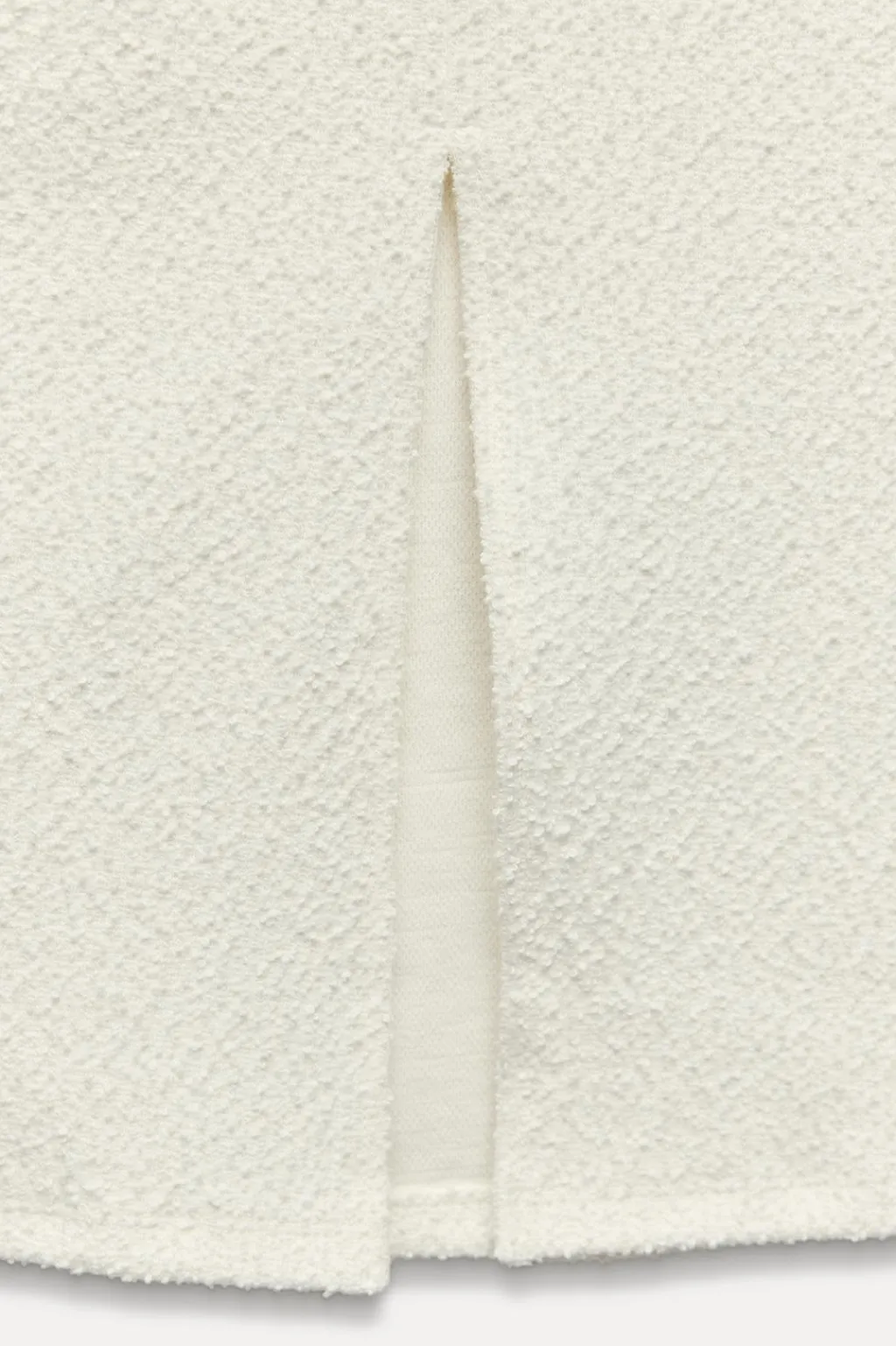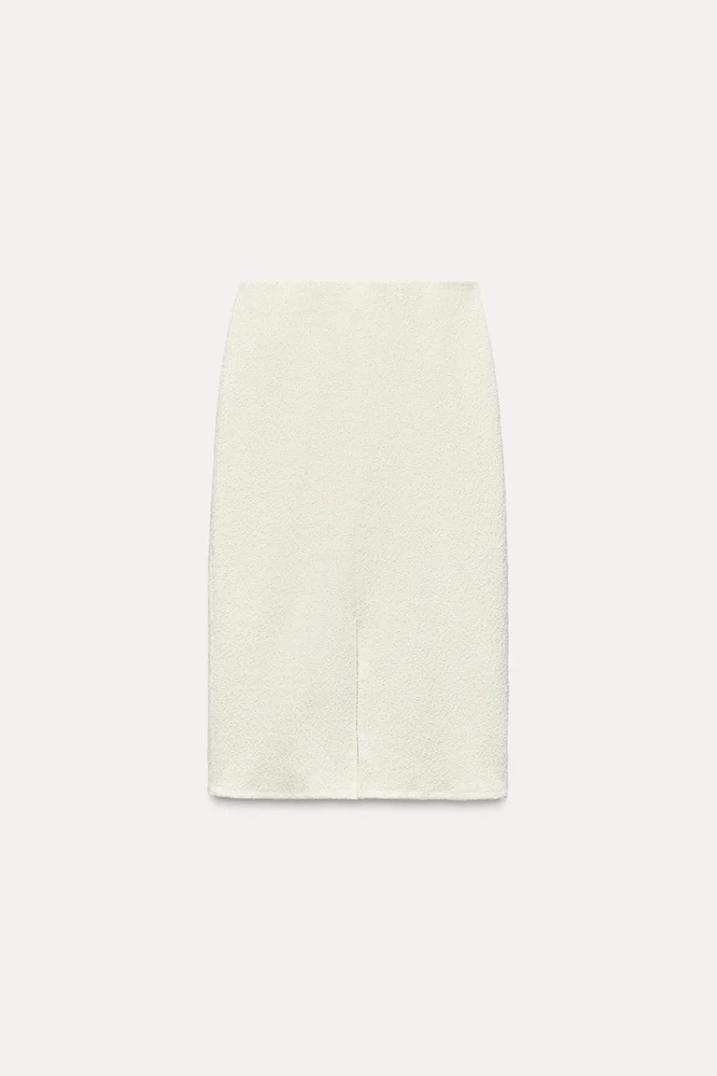 Falda midi confeccionada en hilatura con mezcla de algodón. Tiro medio y cintura con elástico. Falsos bolsillos de vivo en delantero.