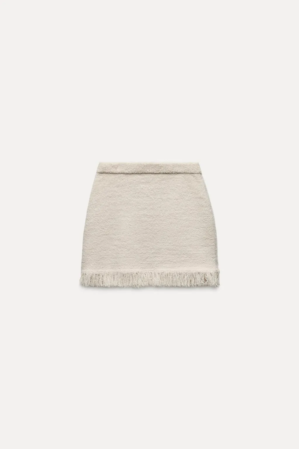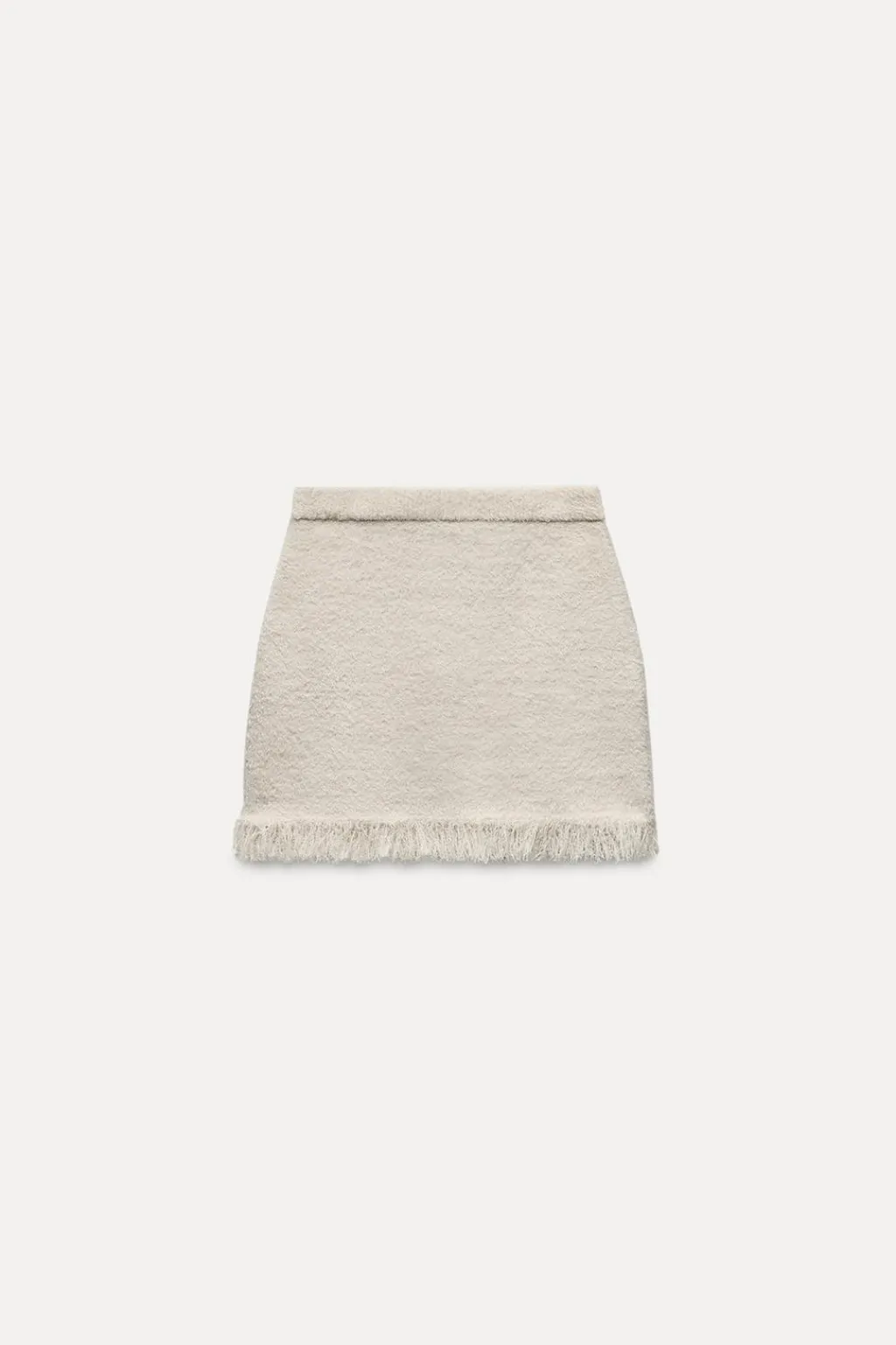 Falda de tiro alto con cintura elástica. Detalle de bajo con acabado desflecado.