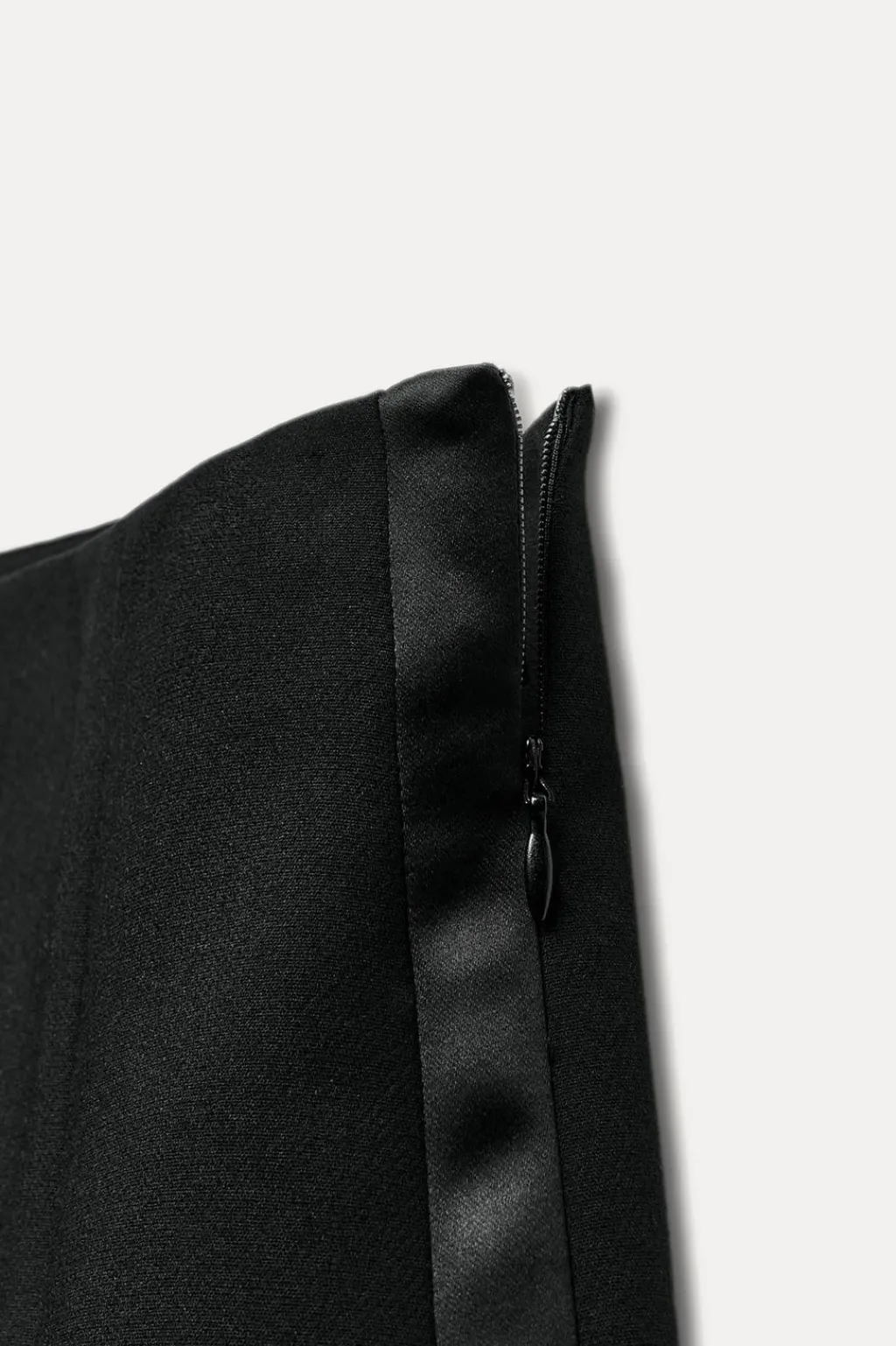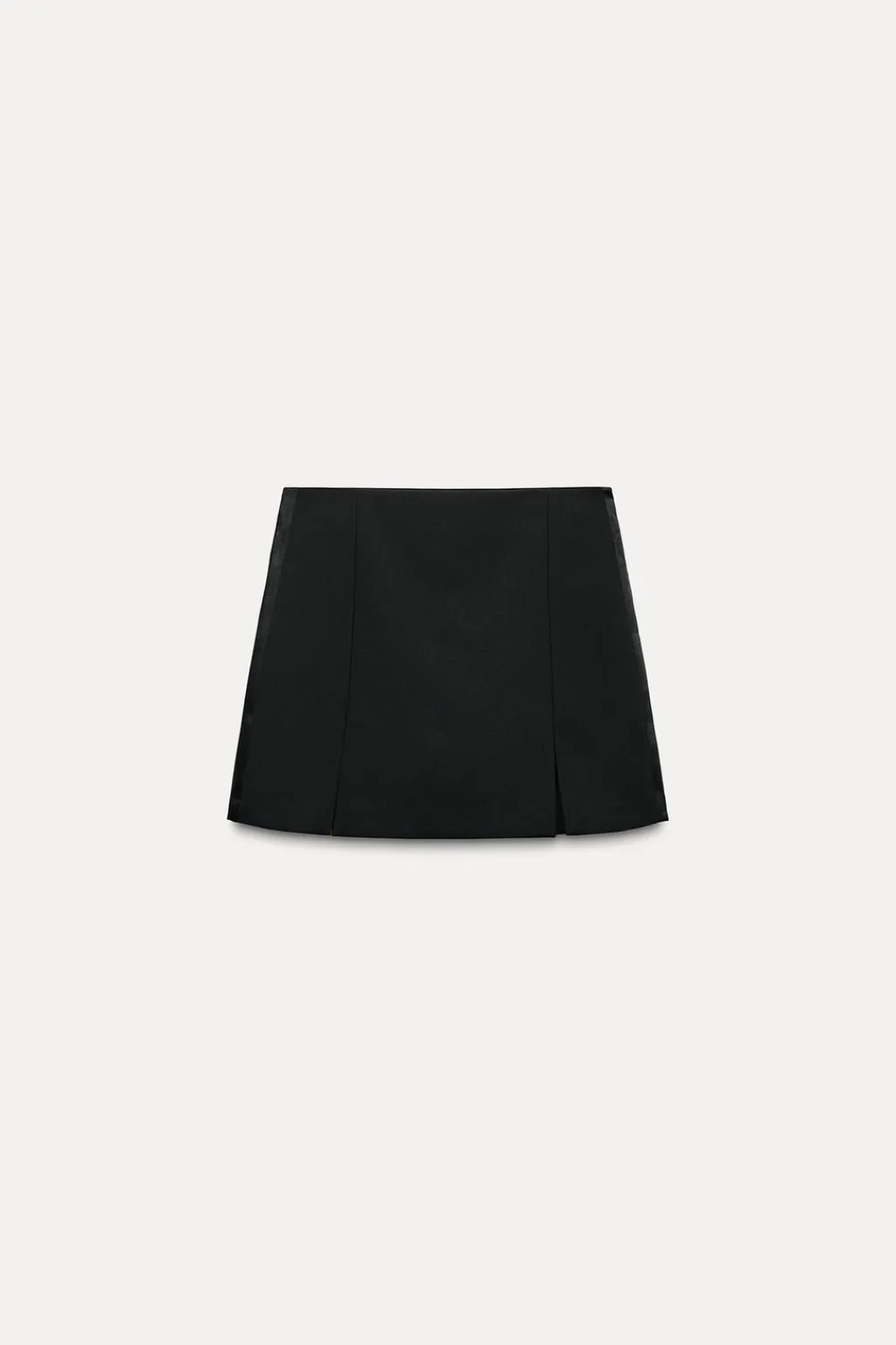 Falda pantalón de tiro alto con bandas laterales satinadas. Bajo con aberturas frontales. Cierre lateral con cremallera oculta en costura.
