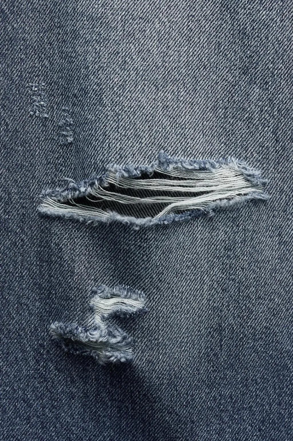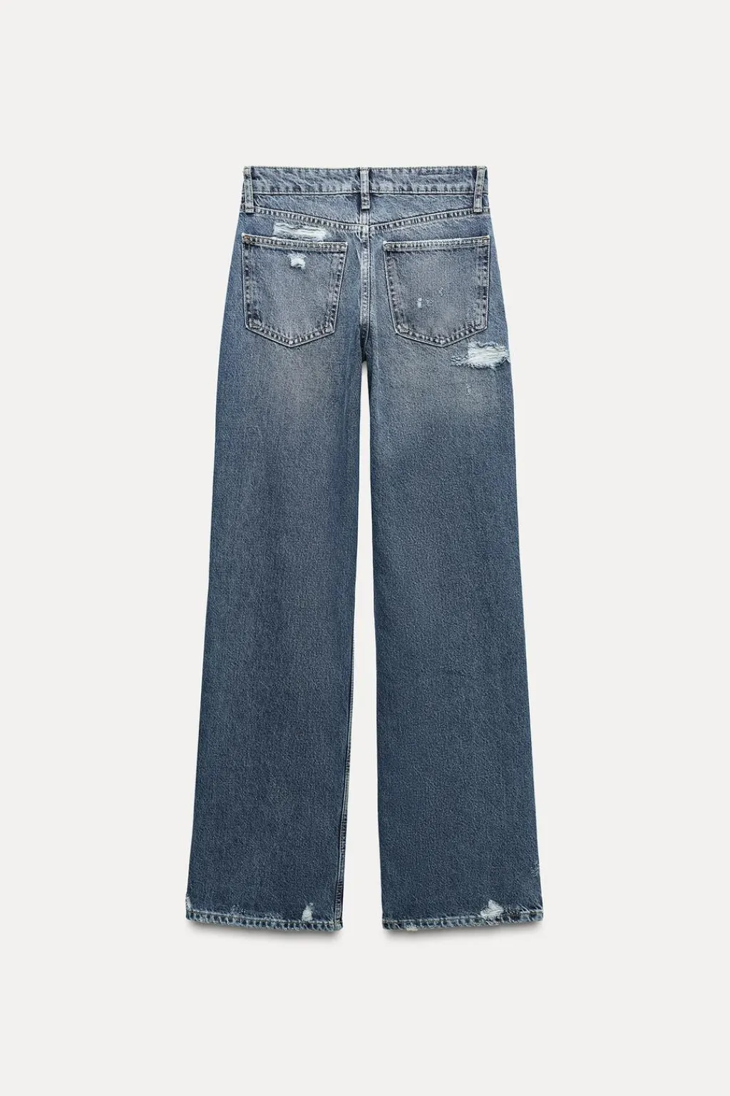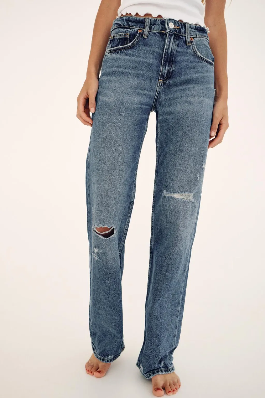 Jeans de tejido rígido con tiro medio y cinco bolsillos. Cintura con trabillas. Pierna ancha larga. Detalle de rotos. Cierre con cremallera y botón metálico.