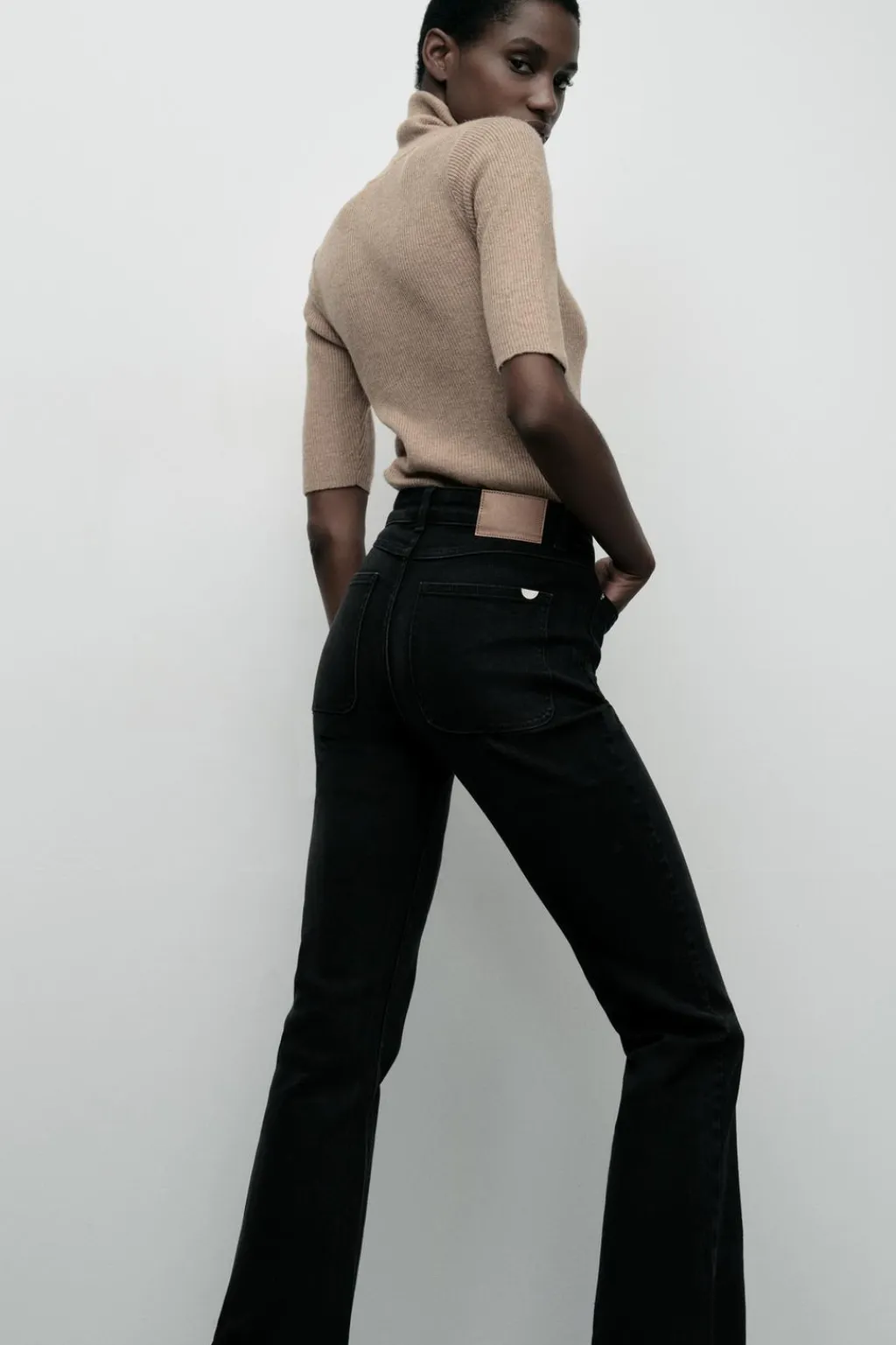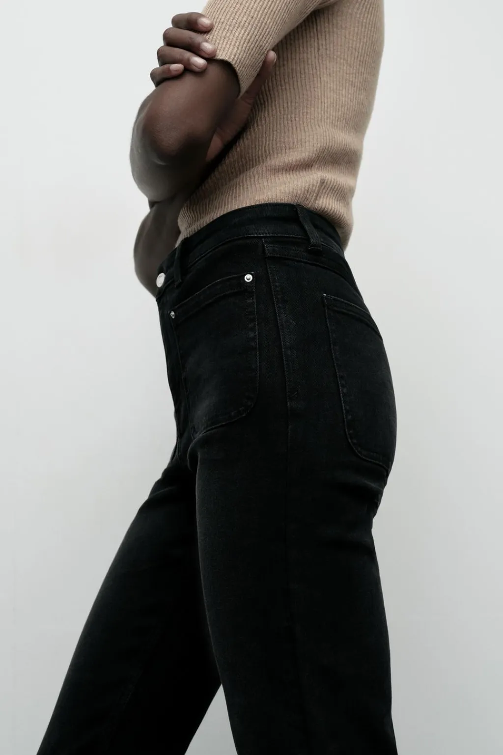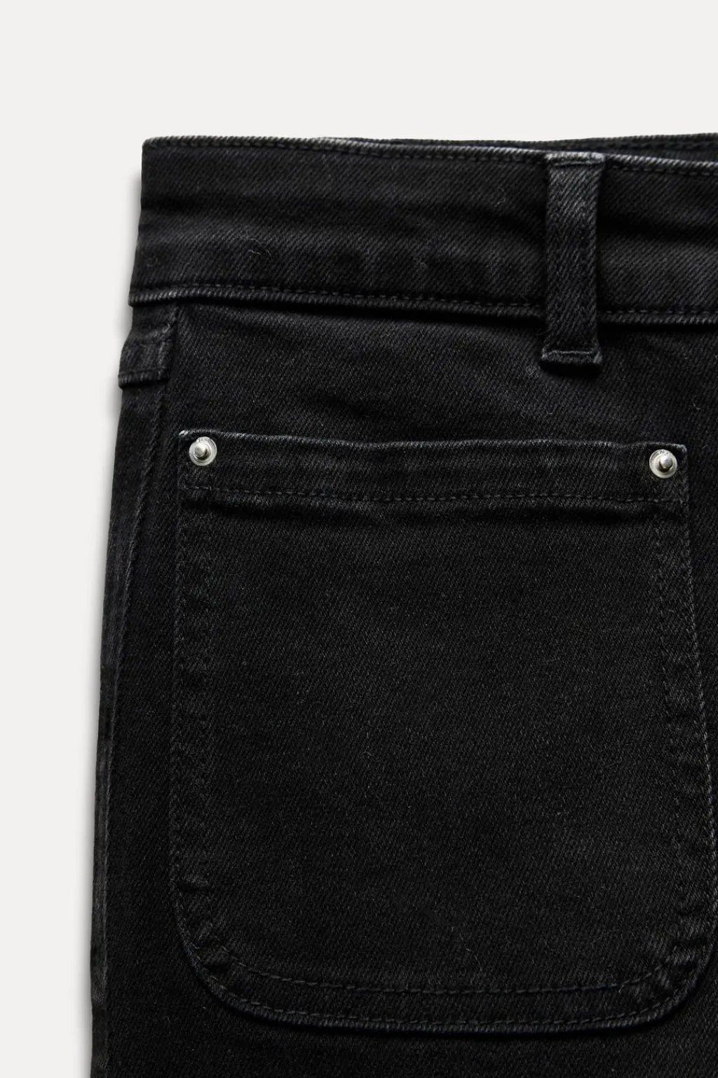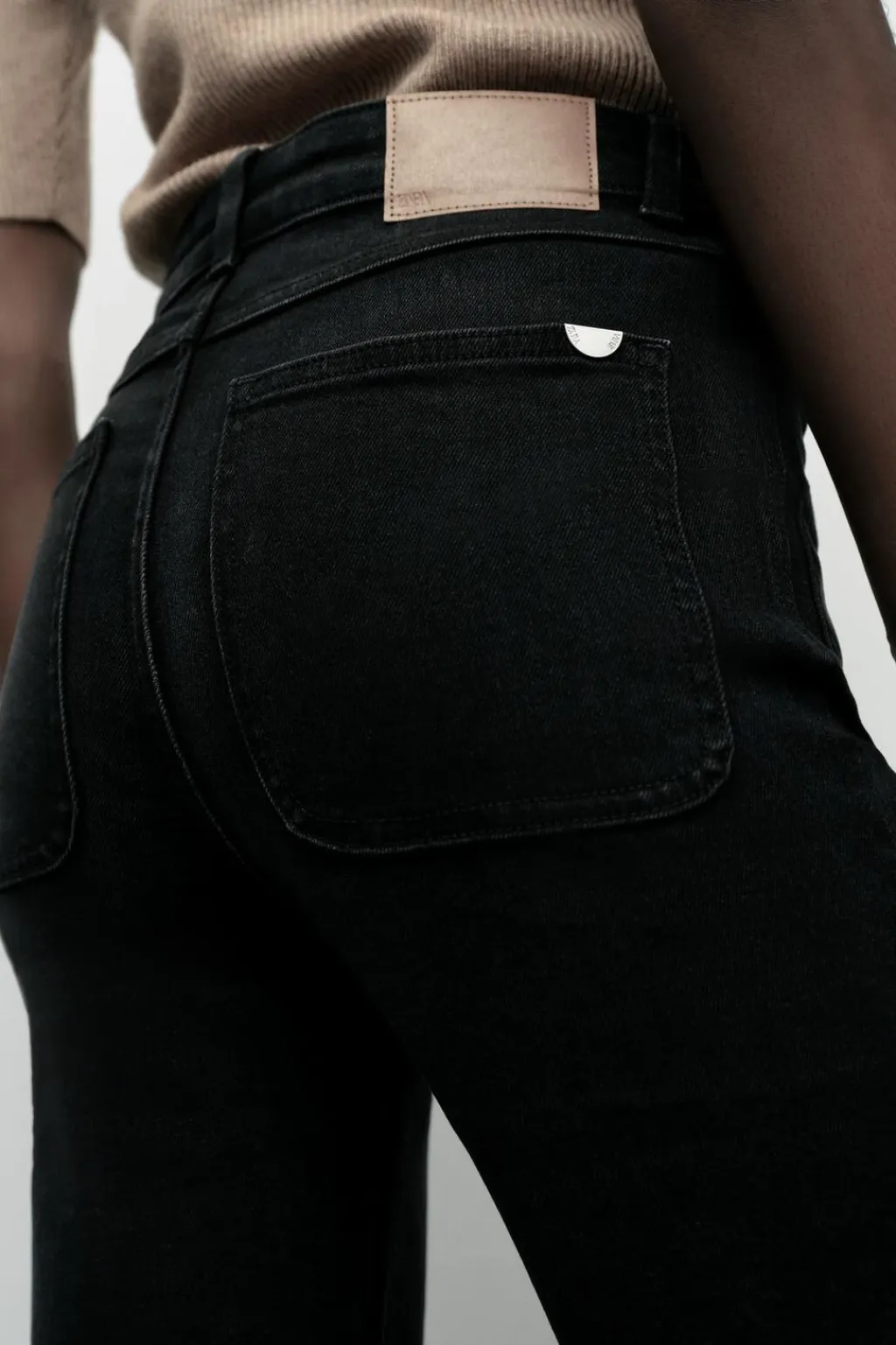 Jeans tobilleros de tiro alto con bolsillos de plastrón en delantero y espalda. Efecto lavado. Bajo en evasé con acabado sin costura. Cierre frontal con cremallera y botón.