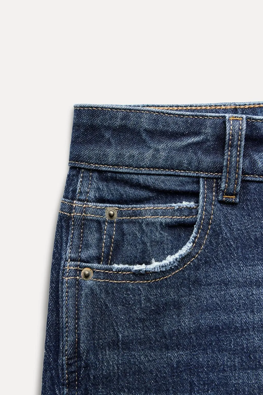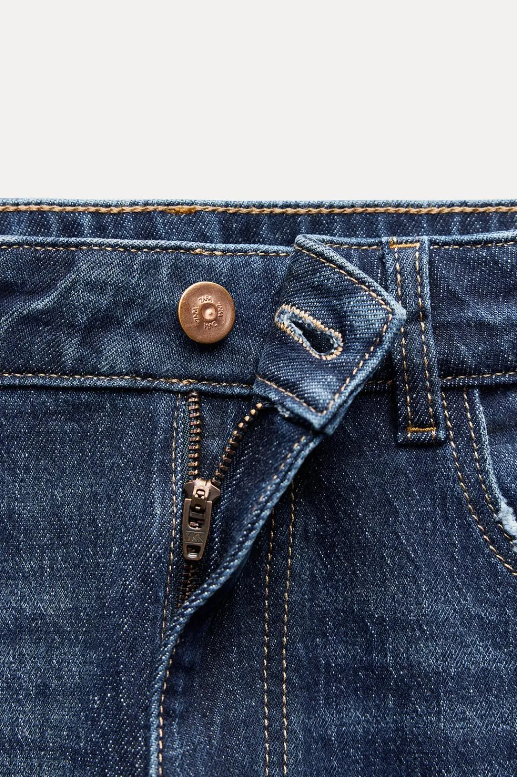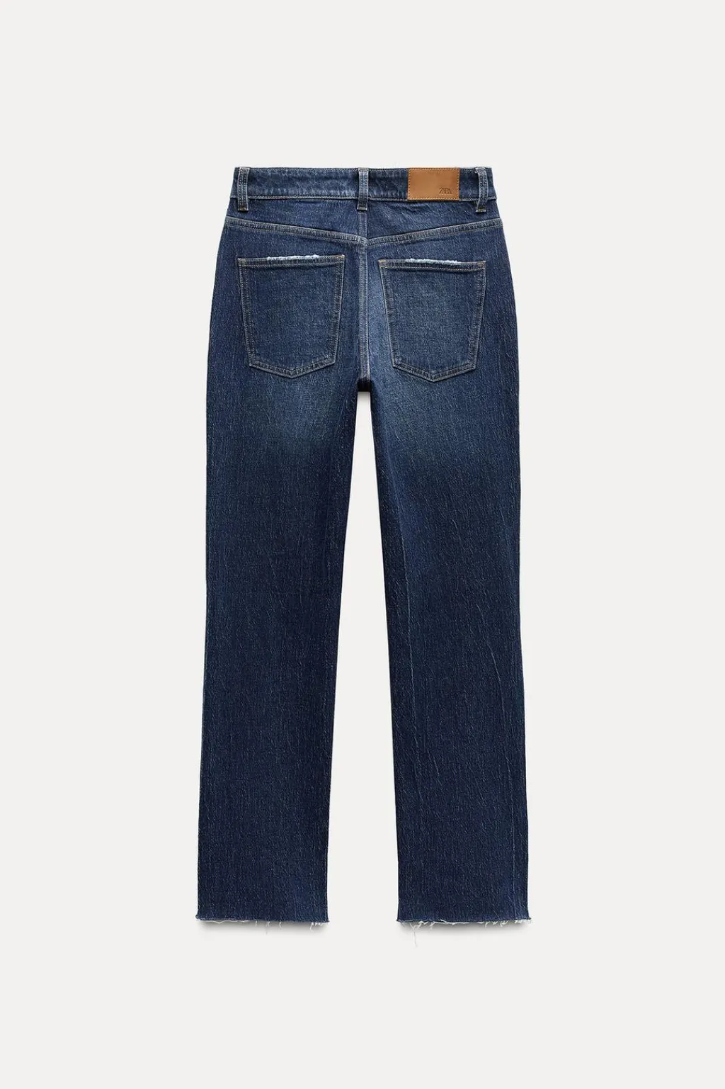 Jeans de tiro alto con cinco bolsillos. Efecto lavado. Pernera recta acabada sin costura. Cierre frontal con cremallera y botón.