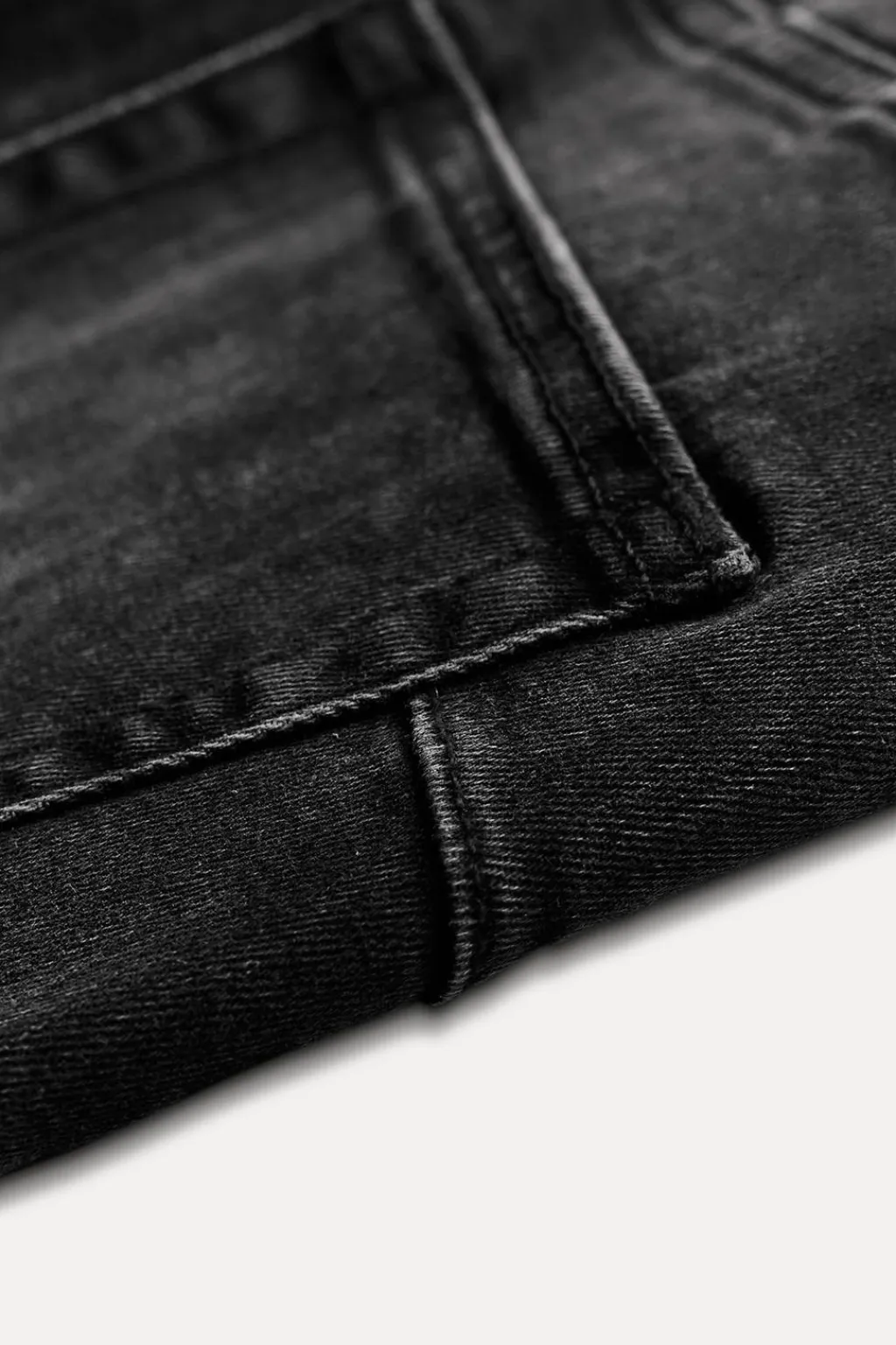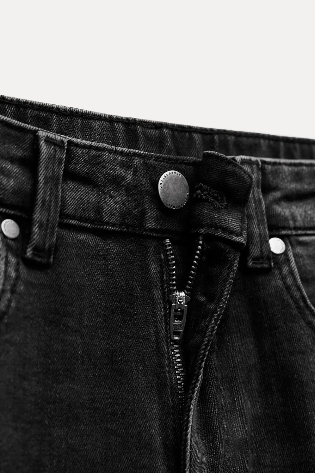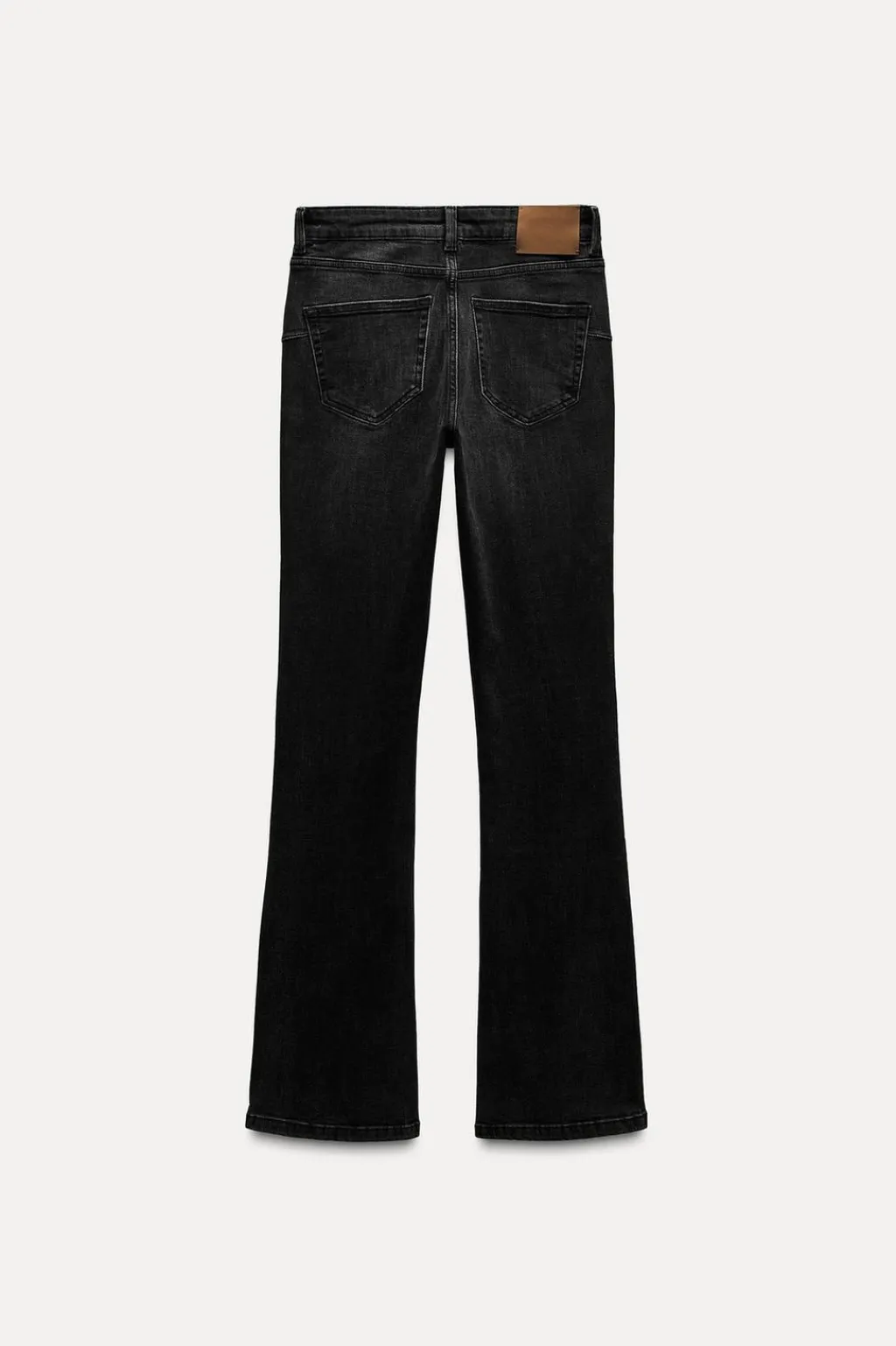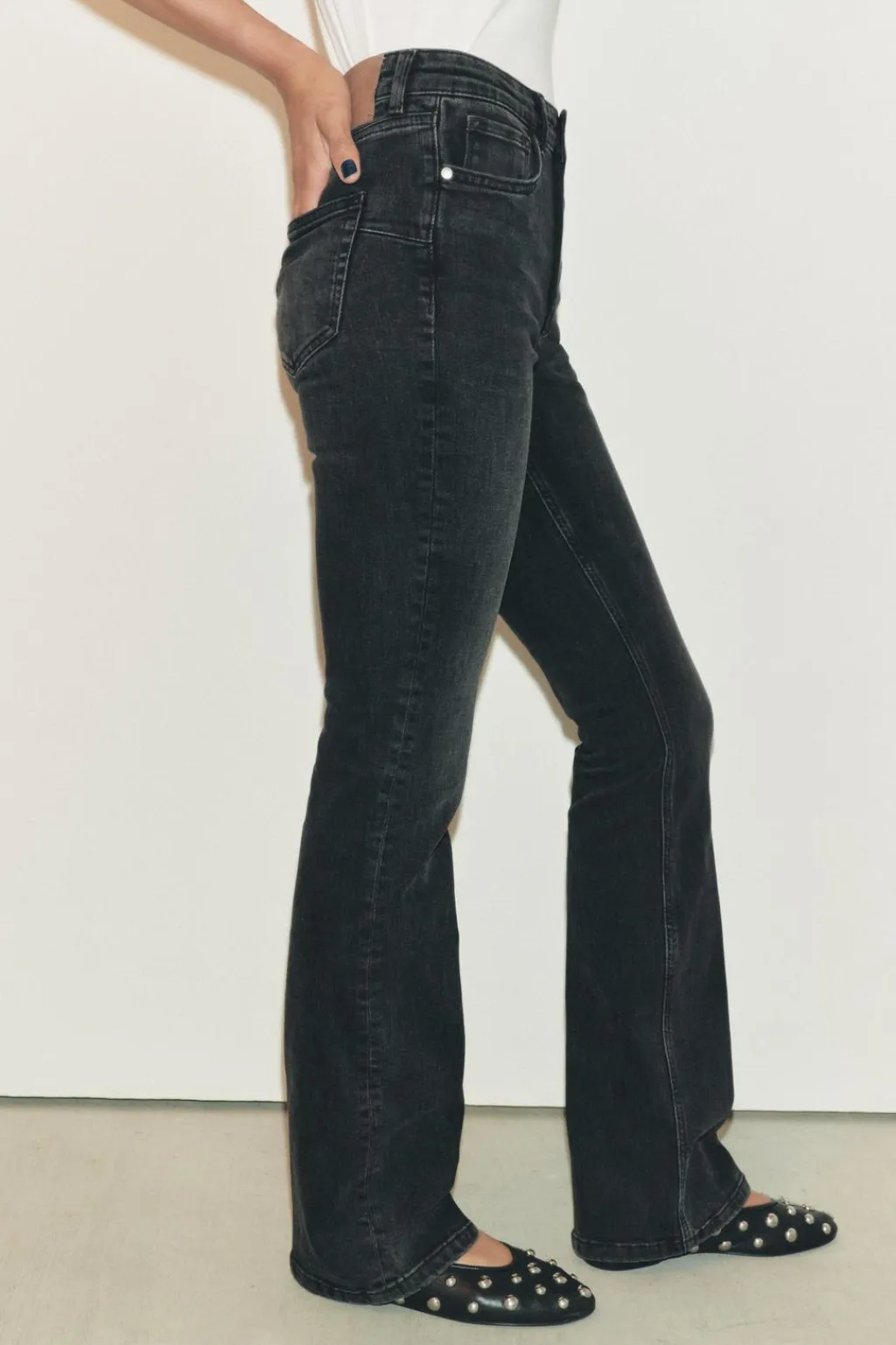 Jeans de tiro medio y cintura con trabillas. Cinco bolsillos. Bajo acabado en línea evasé. Cierre frontal con cremallera y botón.