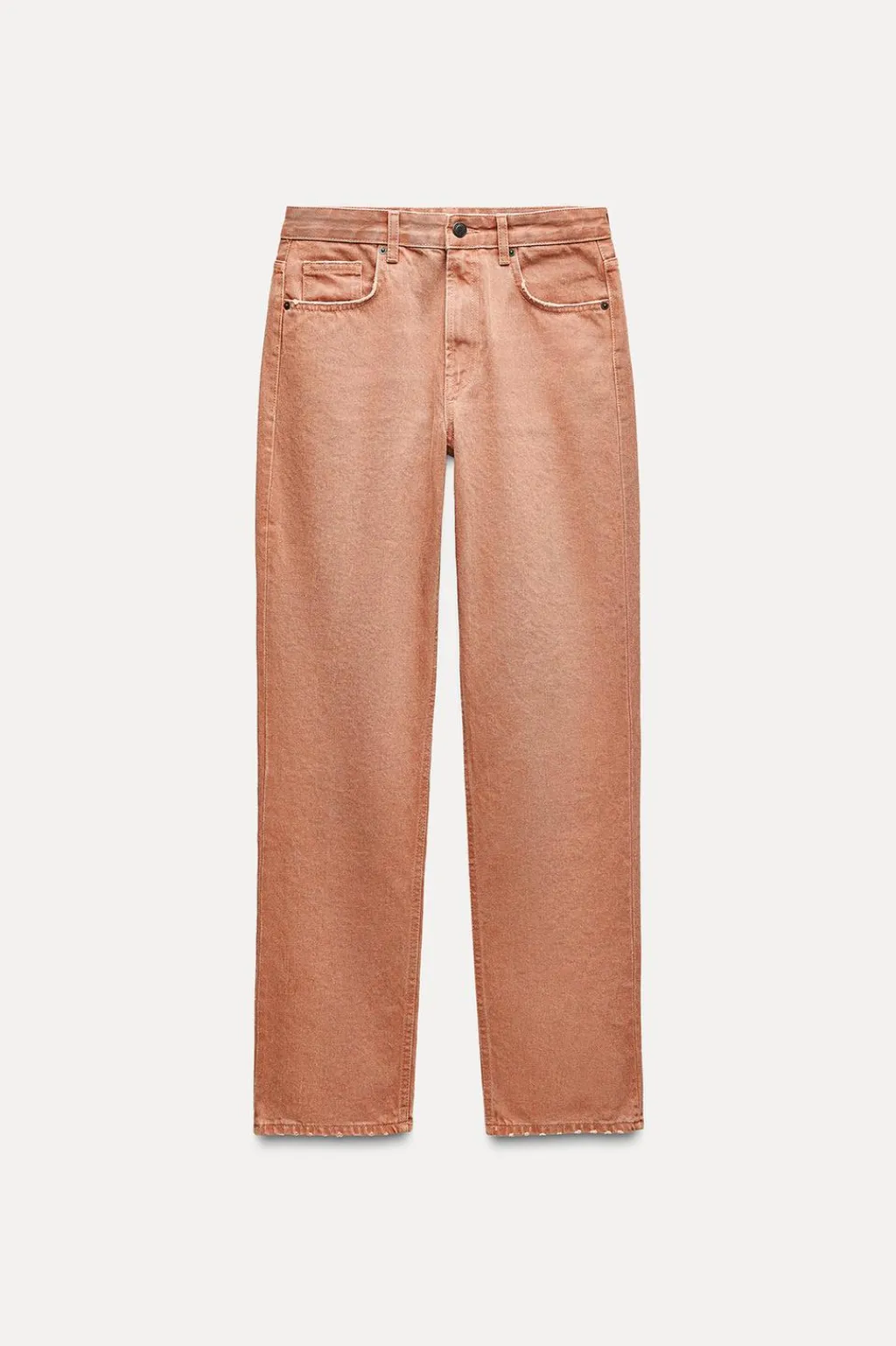 Jeans de tiro medio y cintura con trabillas. Cinco bolsillos. Pierna recta. Cierre frontal con cremallera y botón.