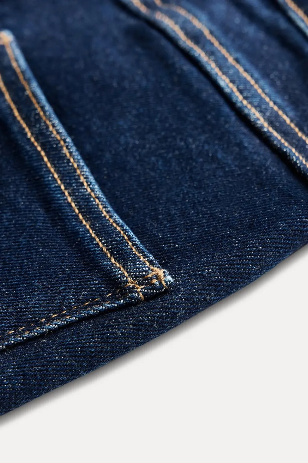 Jeans de tiro alto y cintura con trabillas. Cinco bolsillos. Detalle de pespuntes marcados a contraste. Cierre frontal con cremallera y botón metálico.