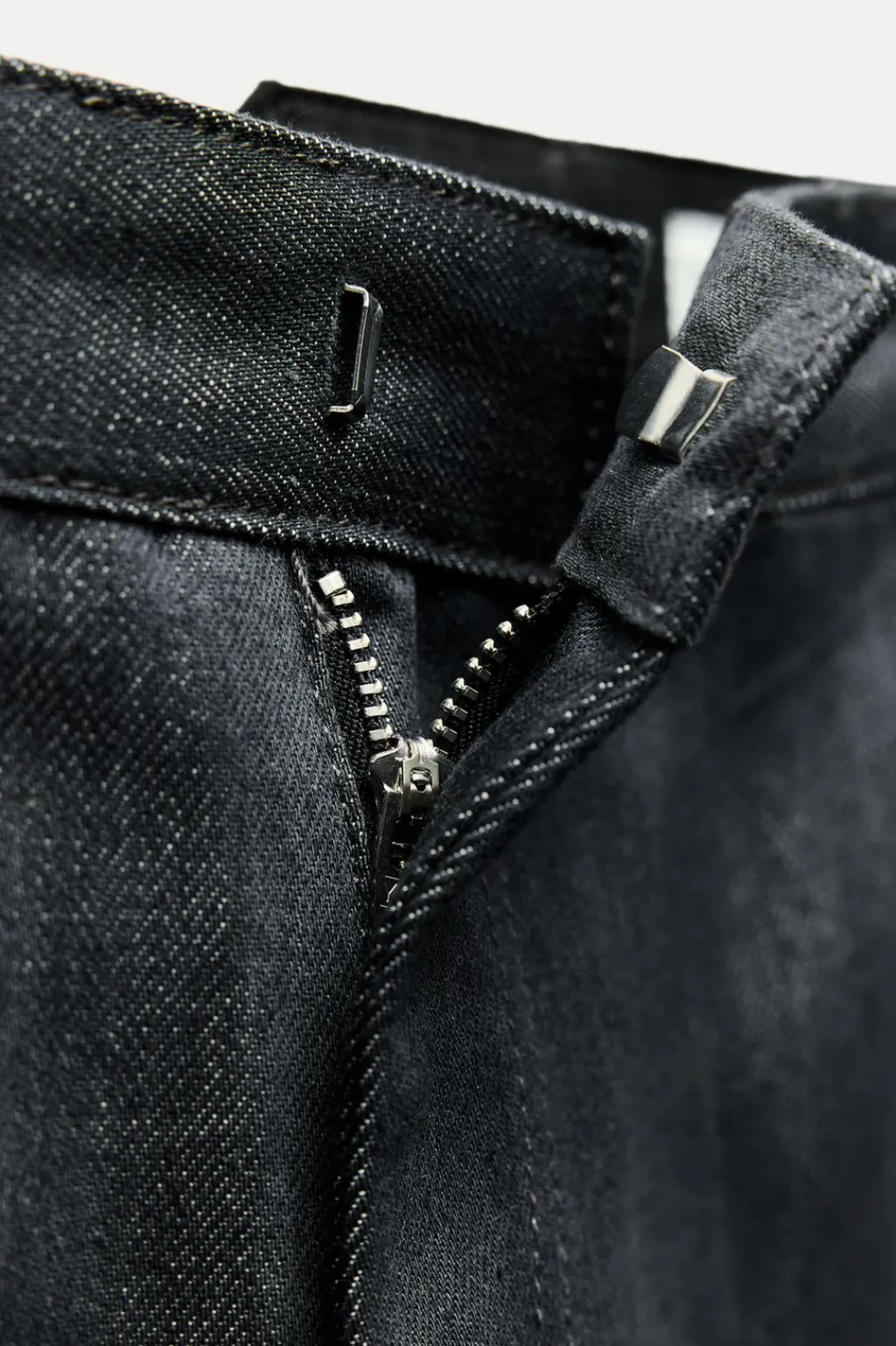 Jeans de tiro medio y cintura con trabillas. Bolsillos laterales ocultos en costura. Pierna ancha. Cierre frontal con cremallera, botón y gancho metálico.