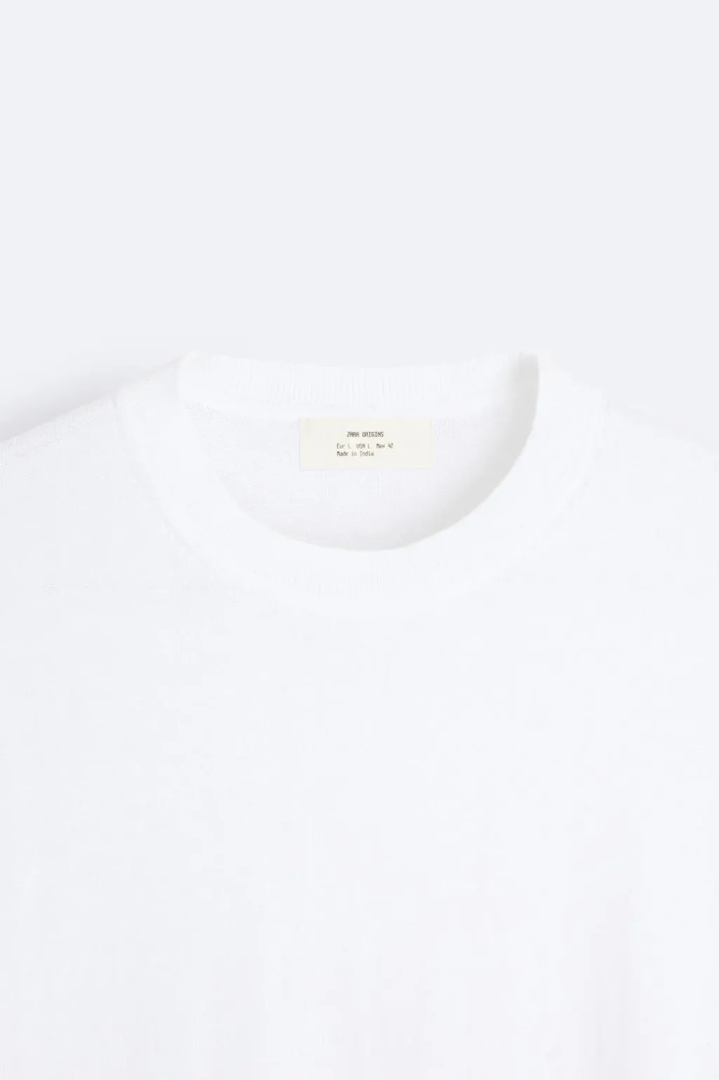 Jersey ligero tejido en hilatura con mezcla de algodón y 10% de cáñamo. Cuello redondo y manga larga. Acabados en rib.