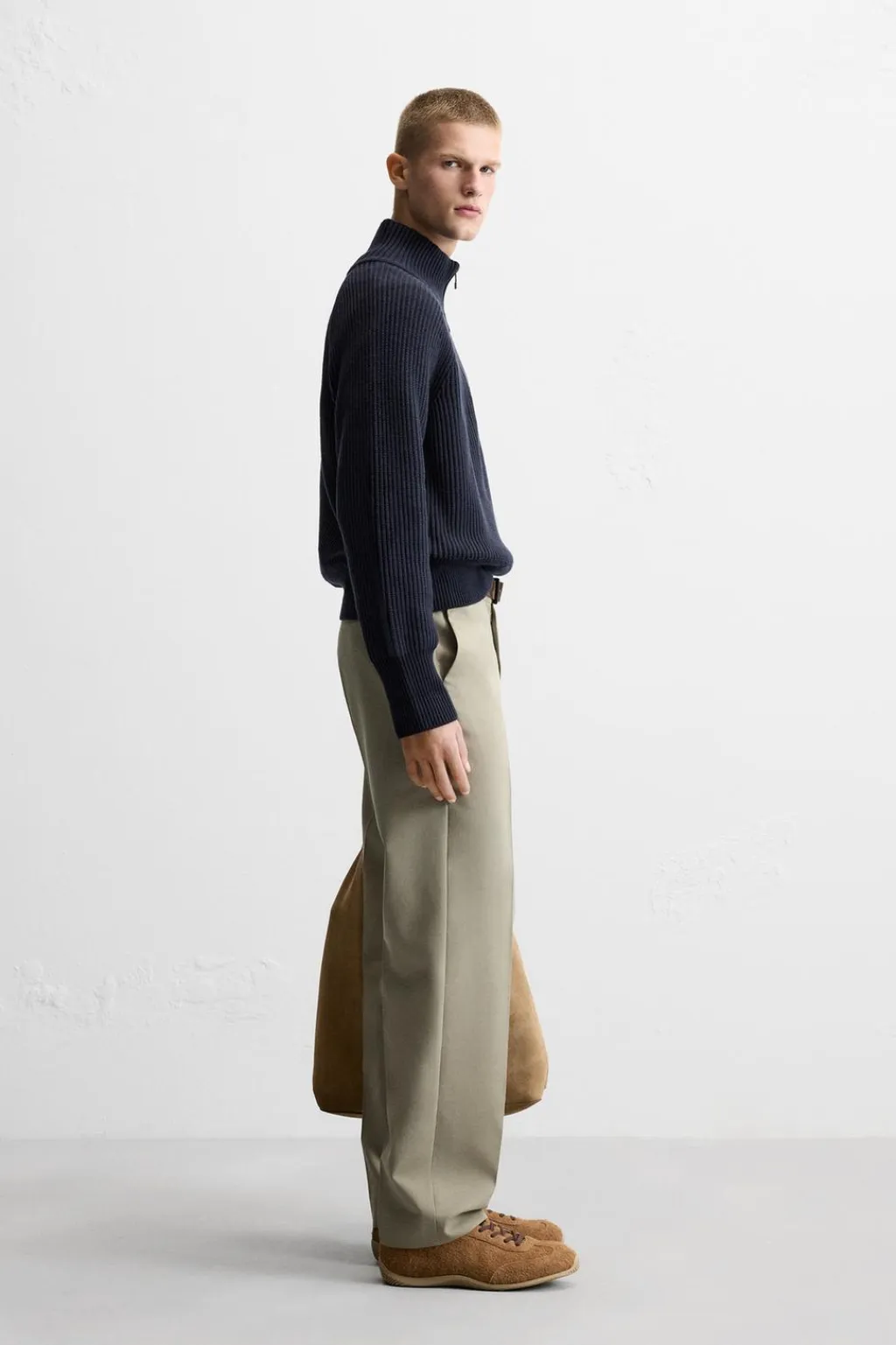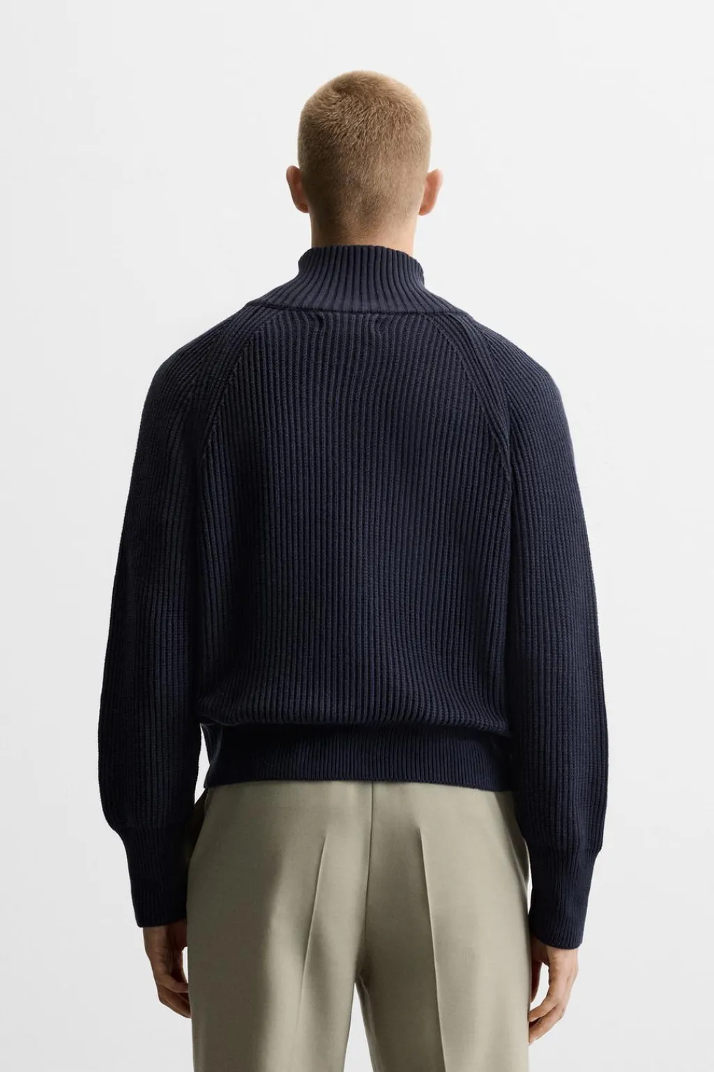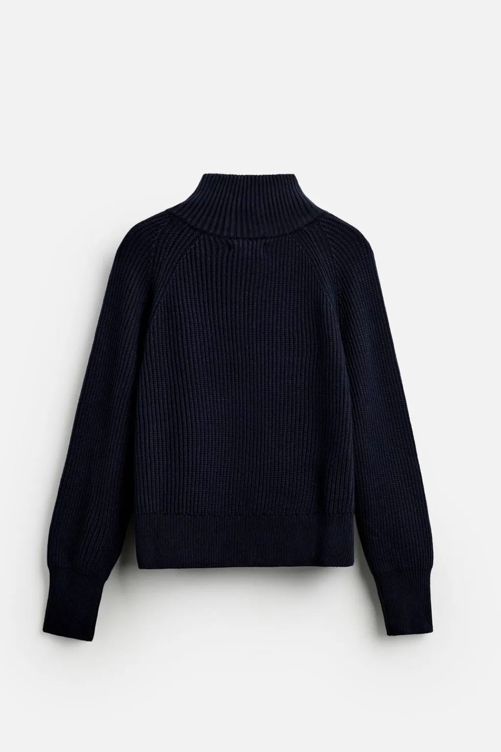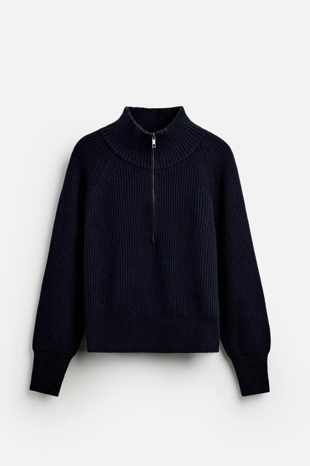 Jersey cropped fit tejido en hilatura de algodón. Cuello perkins con cierre frontal de cremallera. Manga larga. Acabados en rib.