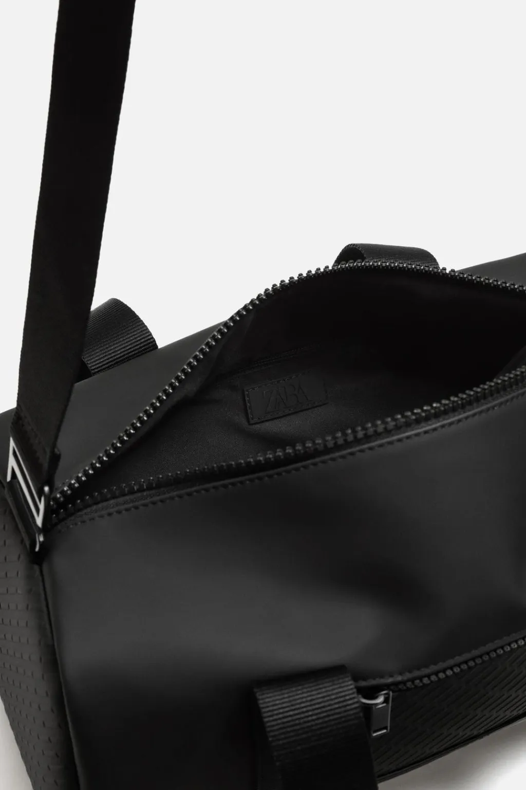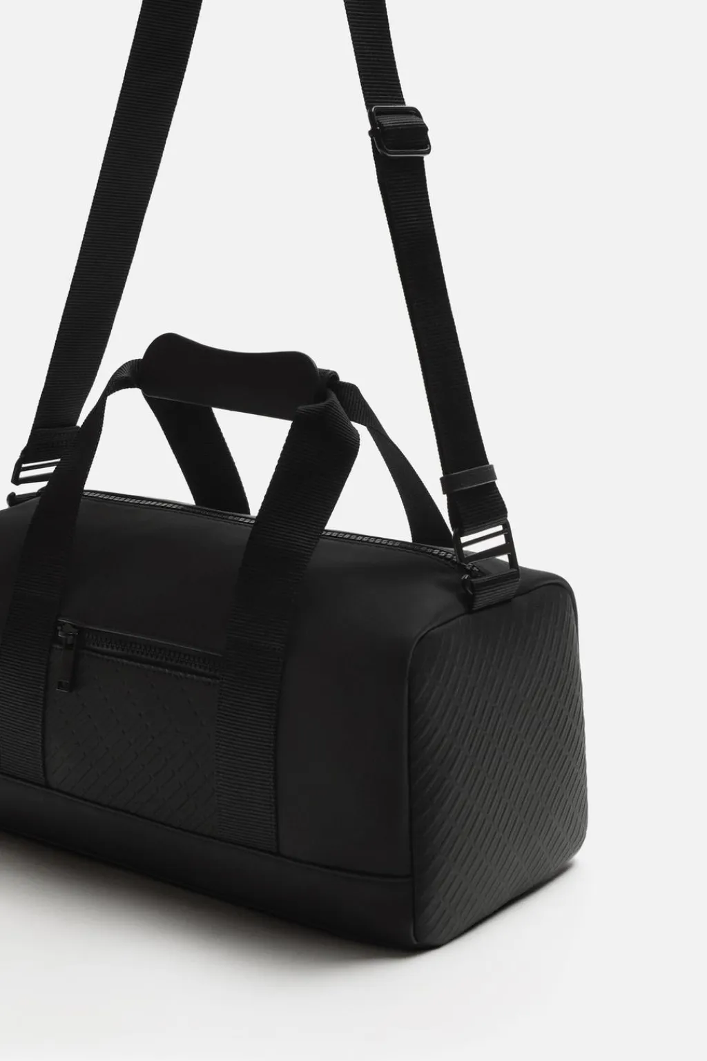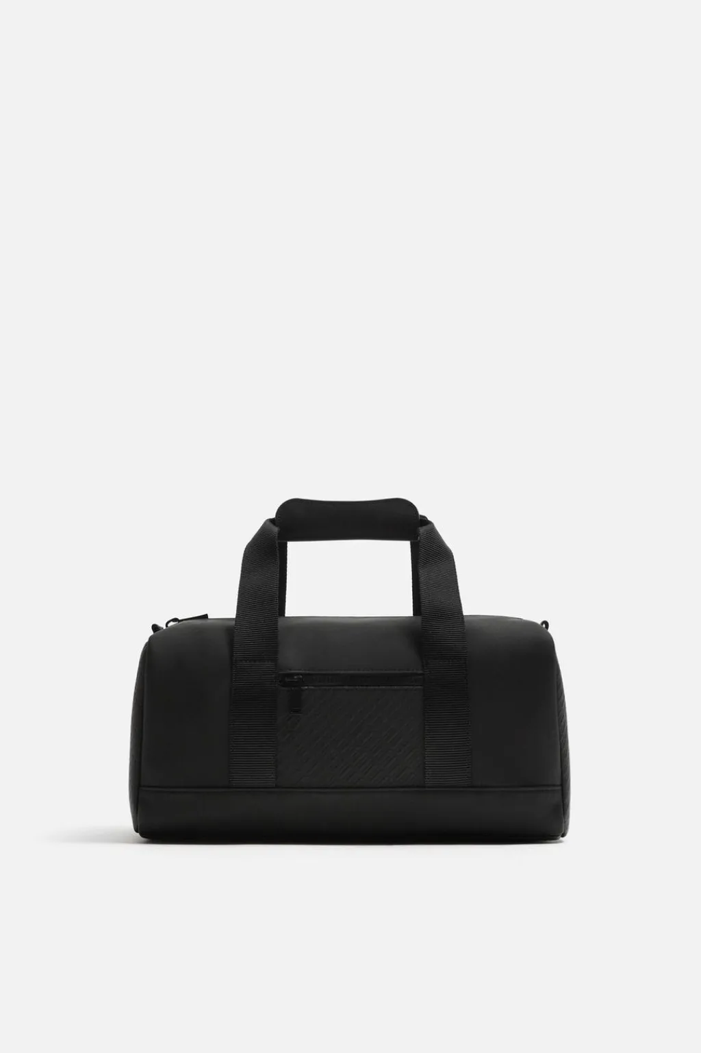 Bolso de viaje de acabado engomado. El compartimento principal se cierra mediante cremallera. En su interior cuenta con un bolsillo con cierre mediante cremallera. Parte frontal tiene un bolsillo con cierre mediante cremallera. Cuenta con dos asas de mano y un asa de hombro ajustable y extraíble.