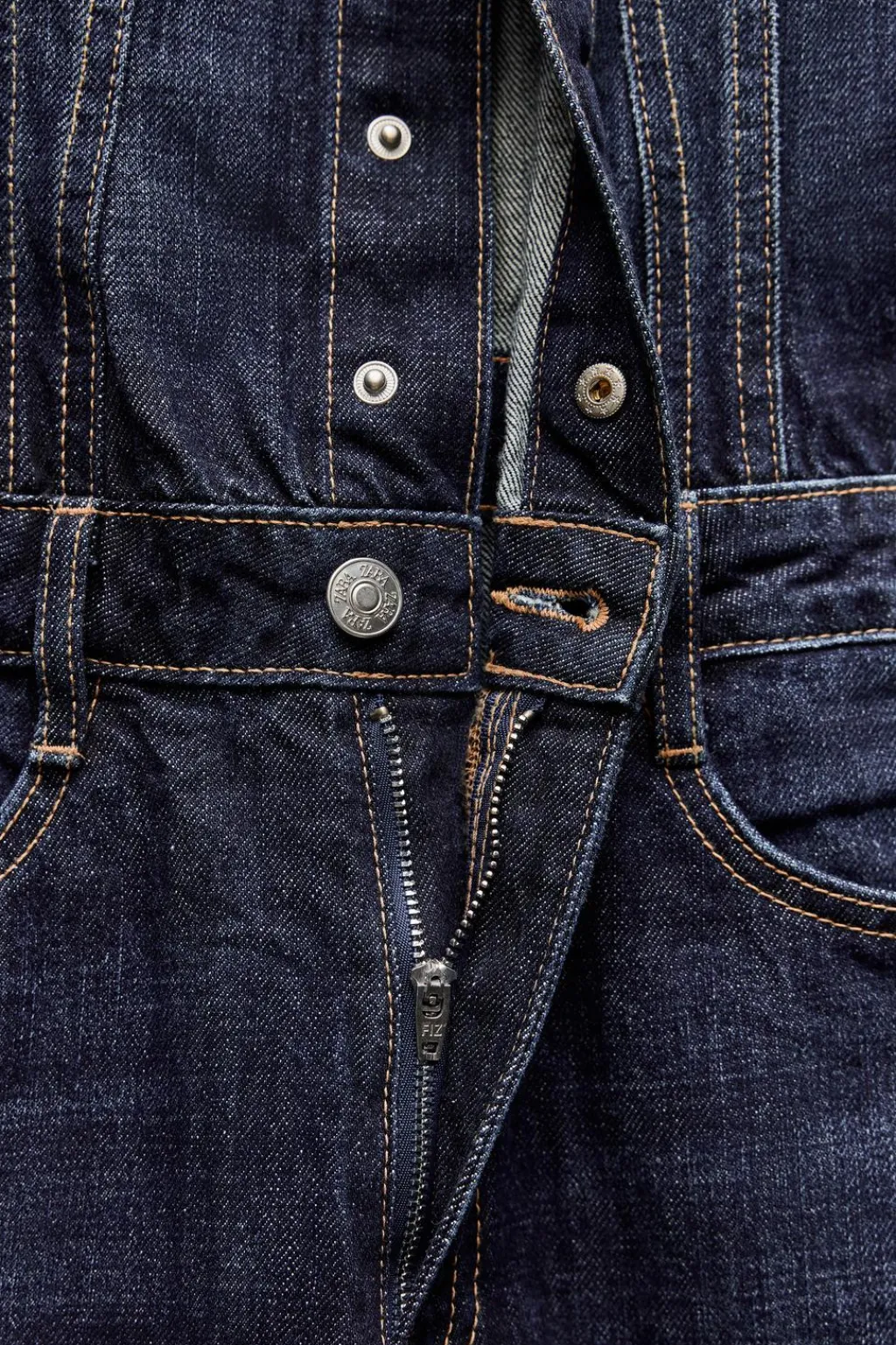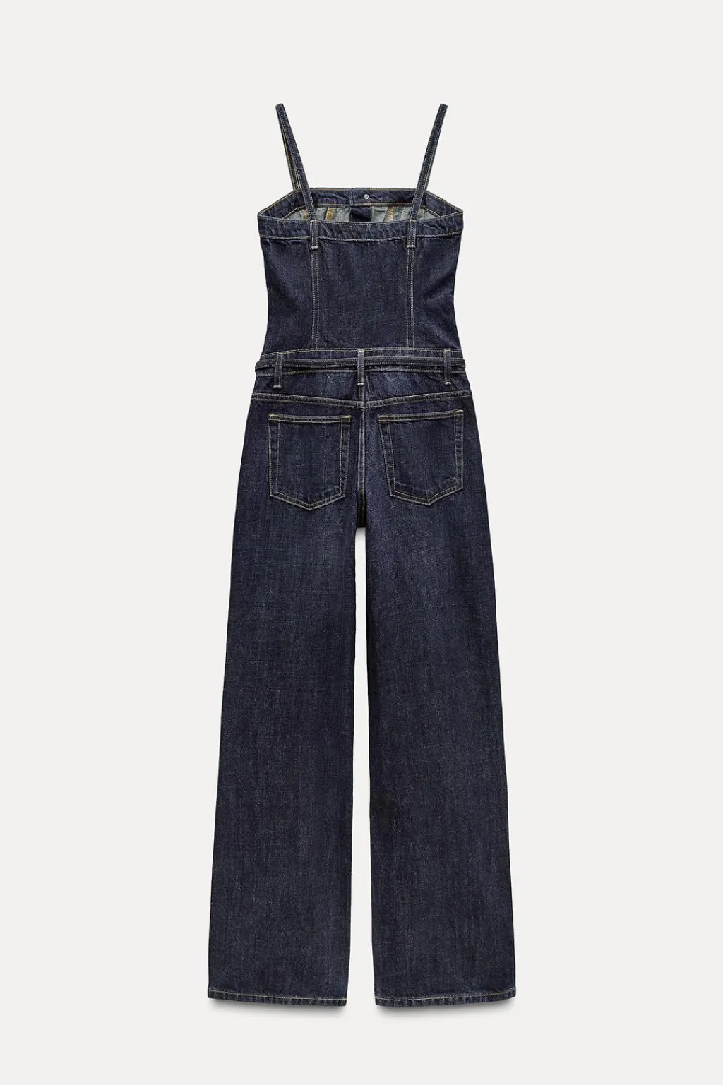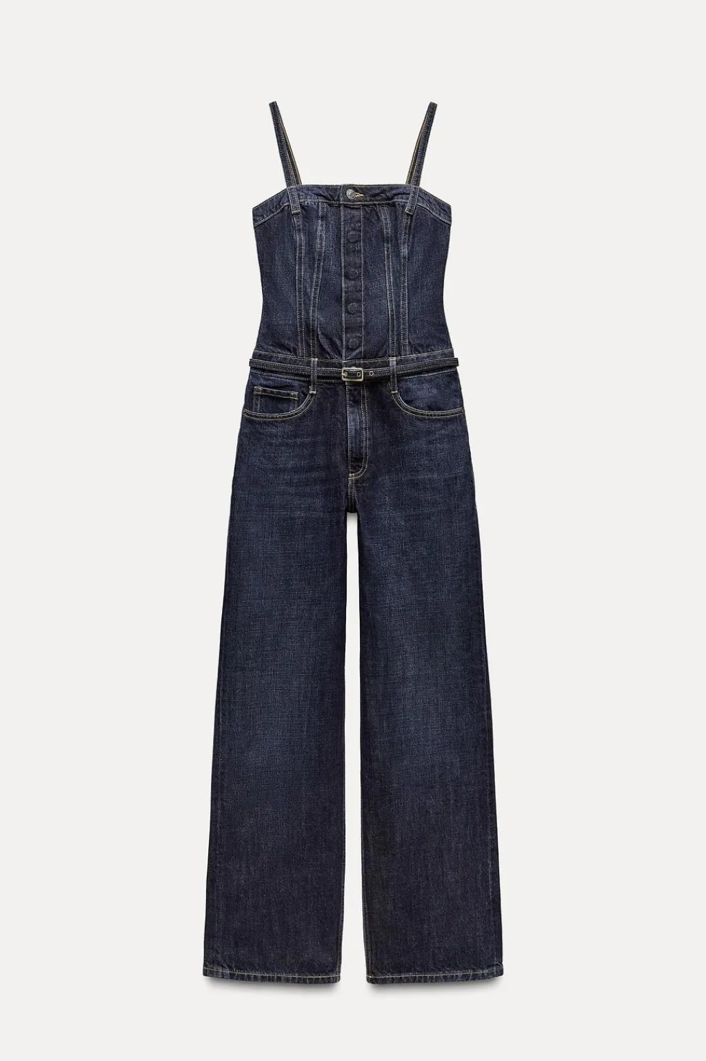 Mono largo de escote recto y tirantes finos con cinco bolsillos. Cinturón fino en mismo tejido con hebilla metálica. Cierre frontal con cremallera y botones.