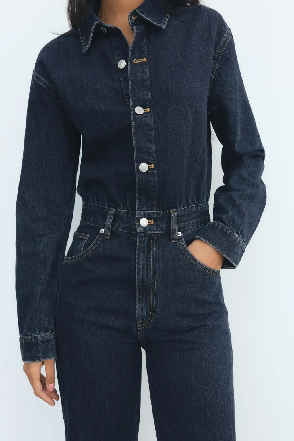 Mono de cuello solapa y manga larga acabada en puño. Bolsillos en delantero y espalda. Cierre frontal con botones metálicos.