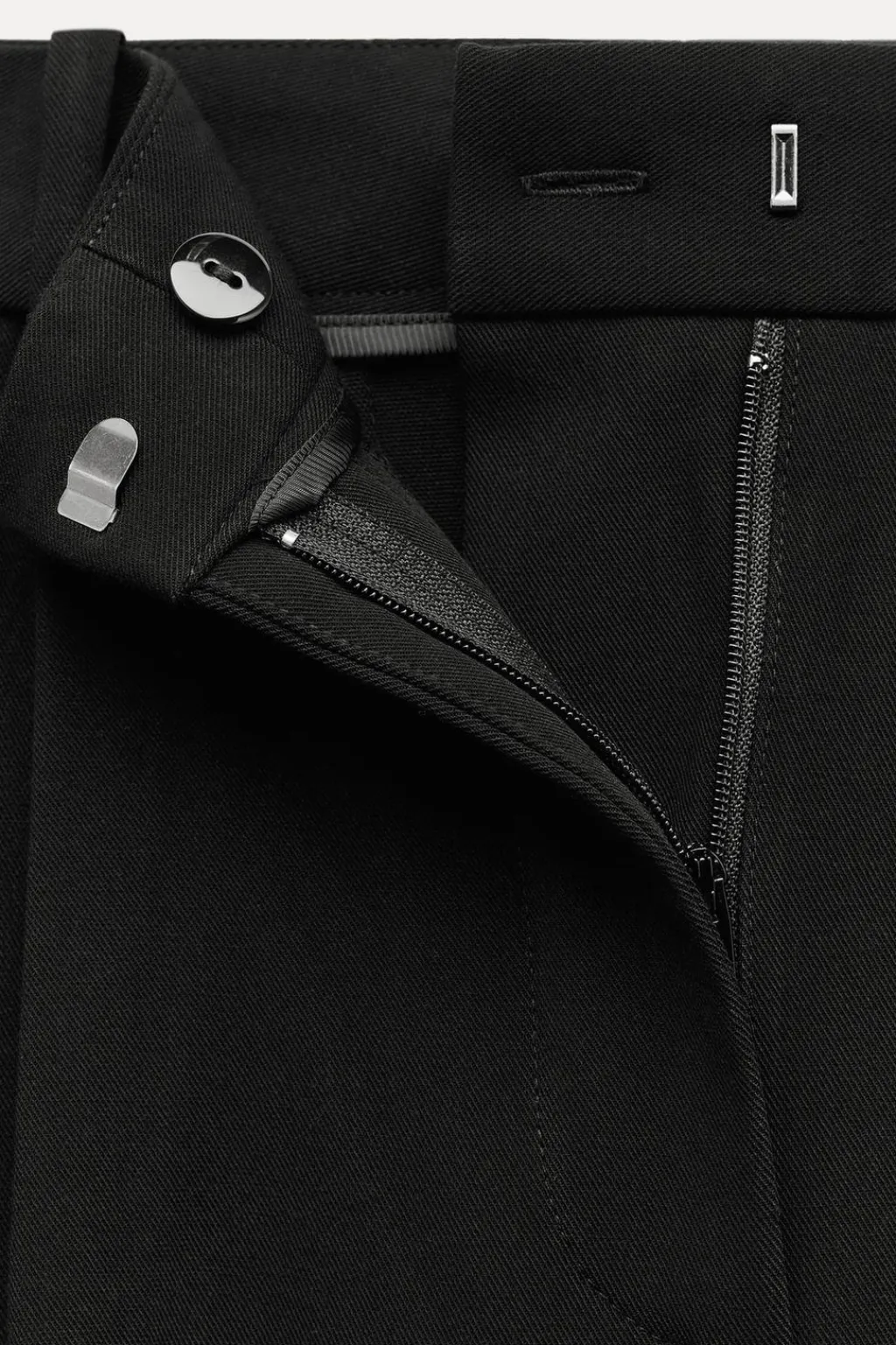 Pantalón de tiro alto con pinzas delanteras y cinturón. Bolsillos frontales y falsos bolsillos de doble vivo en espalda. Pernera ancha. Cierre delantero con cremallera, botón interior y gancho.