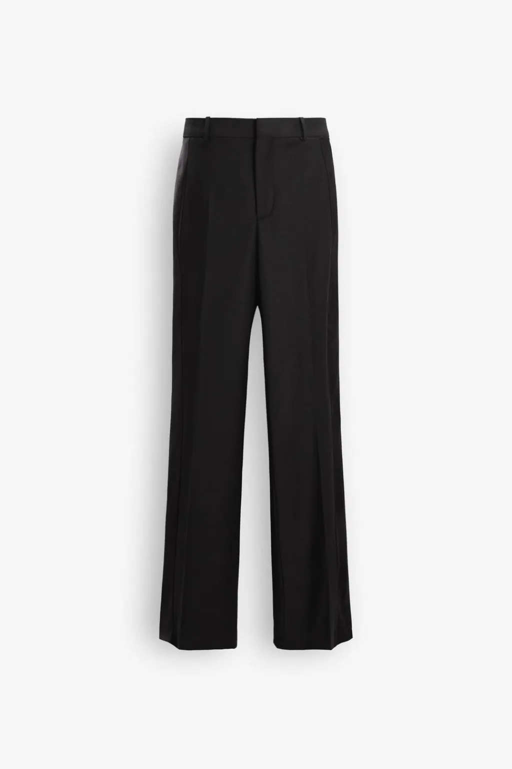 Pantalón confeccionado en hilatura con lana. Tiro medio y cintura con trabillas. Detalle de banda lateral en tejido satinado combinado a tono. Raya planchada en delantero. Cierre frontal con cremallera, botón y ganchos metálicos.