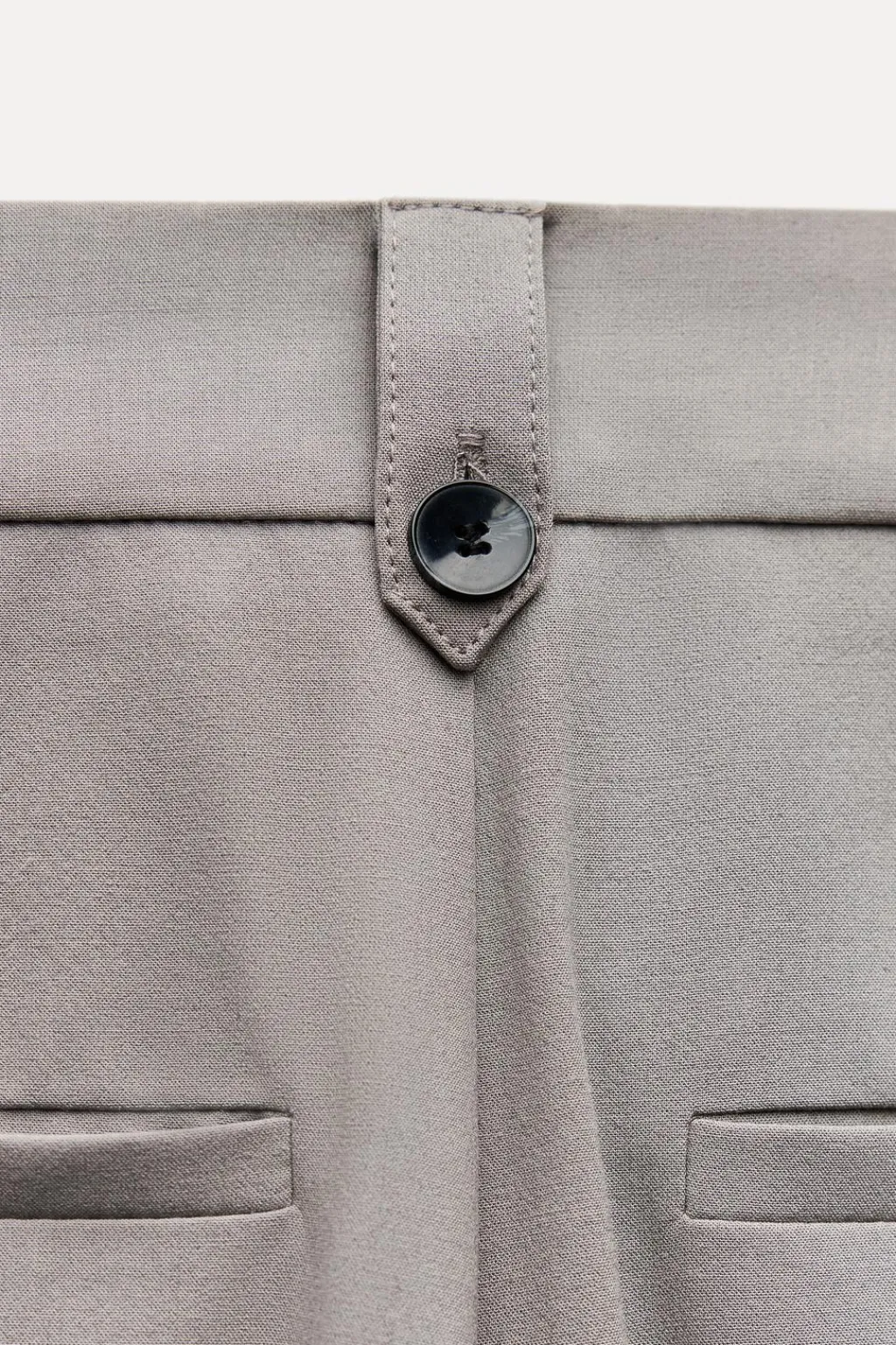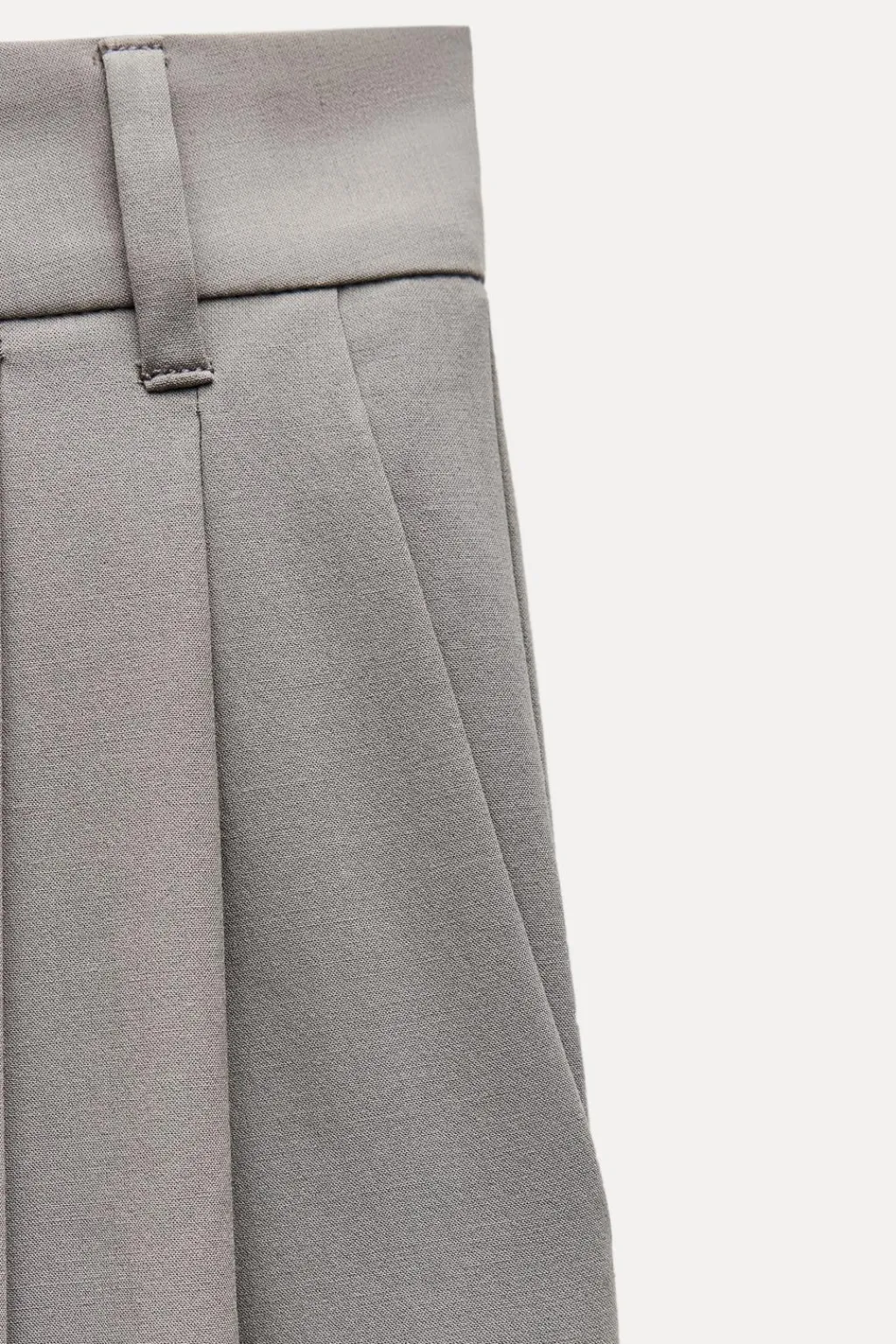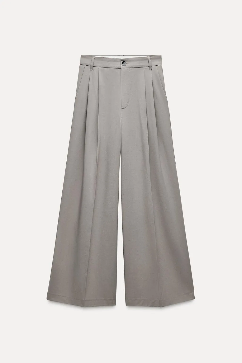 Pantalón de tiro alto con trabillas. Detalle de doble pliegue. Bolsillos laterales y falsos bolsillos de vivo en espalda. Cierre frontal con cremallera y botón.