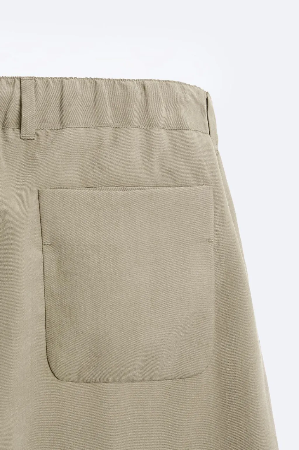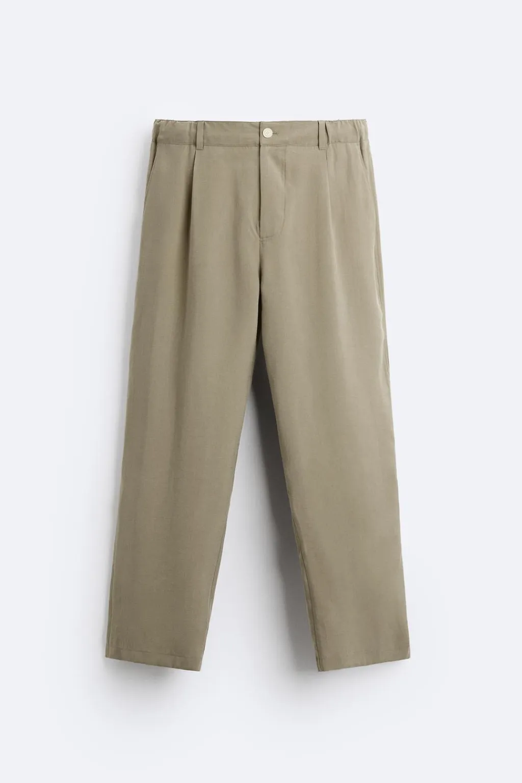 Pantalón relaxed fit confeccionada en tejido con mezcla de lyocell. Cintura con pliegues frontales y detalle de bolsillos traseros. Cierre frontal con creamllera y botón.