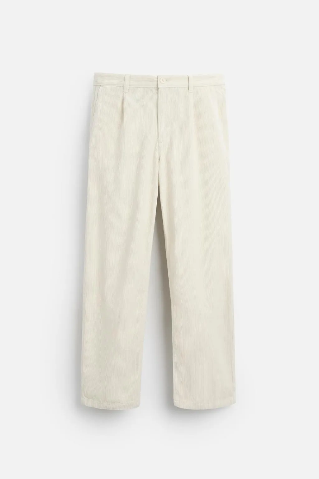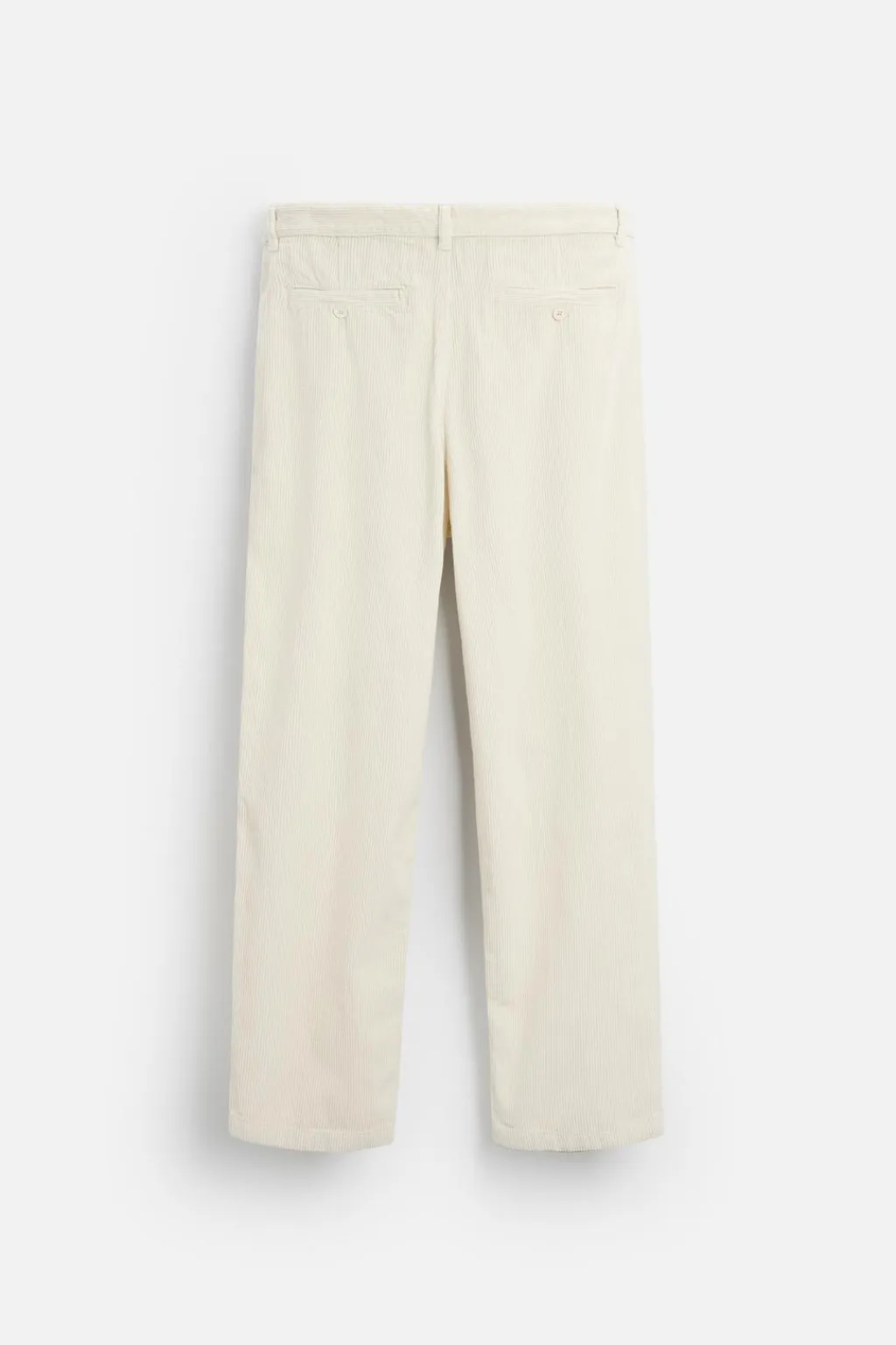 Pantalón relaxed fit confeccionado en pana de algodón. Cintura con detalle de pliegues en delantero. Bolsillos frontales y detalle de bolsillos traseros de vivo con botón. Cierre frontal con cremallera.