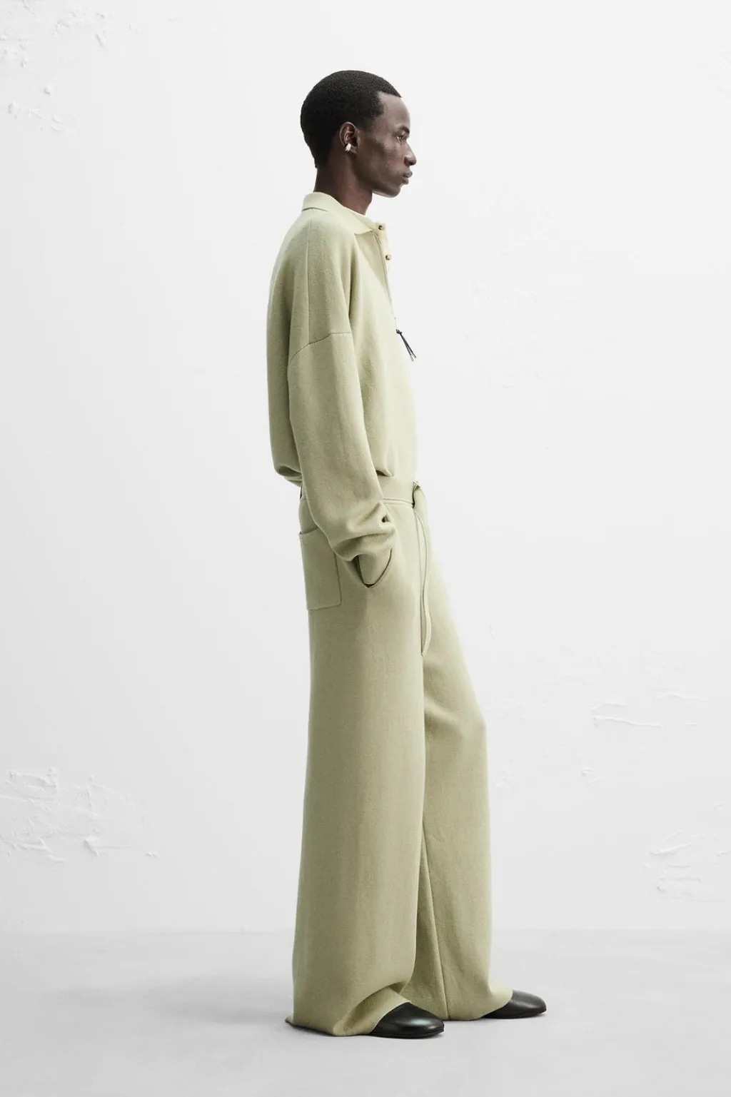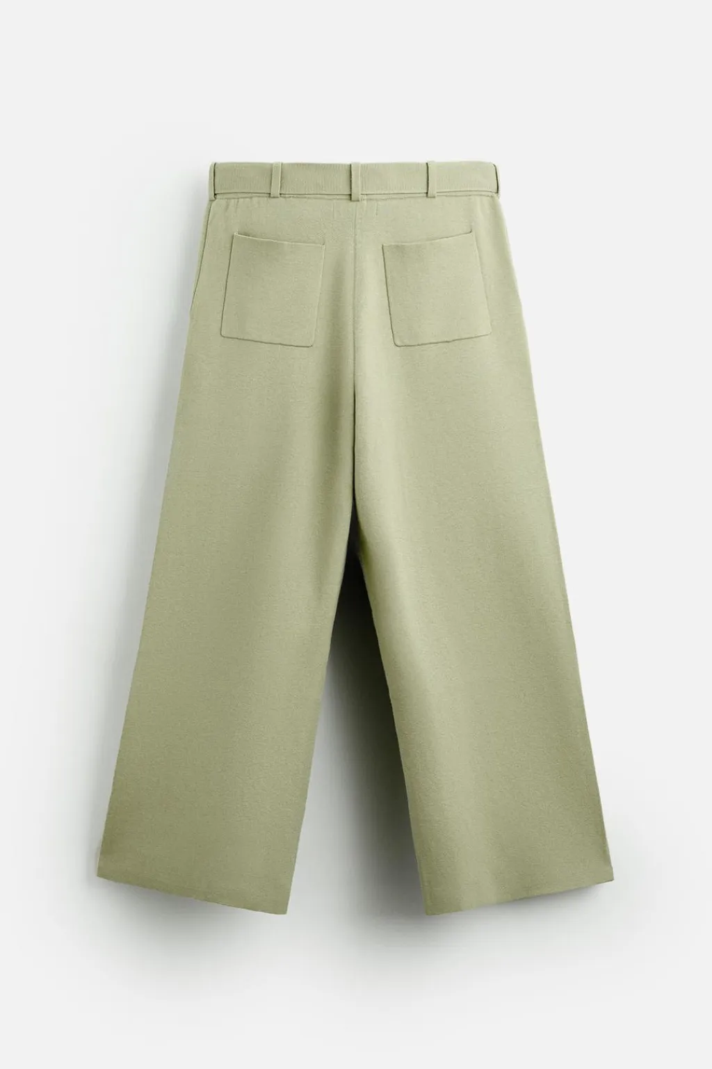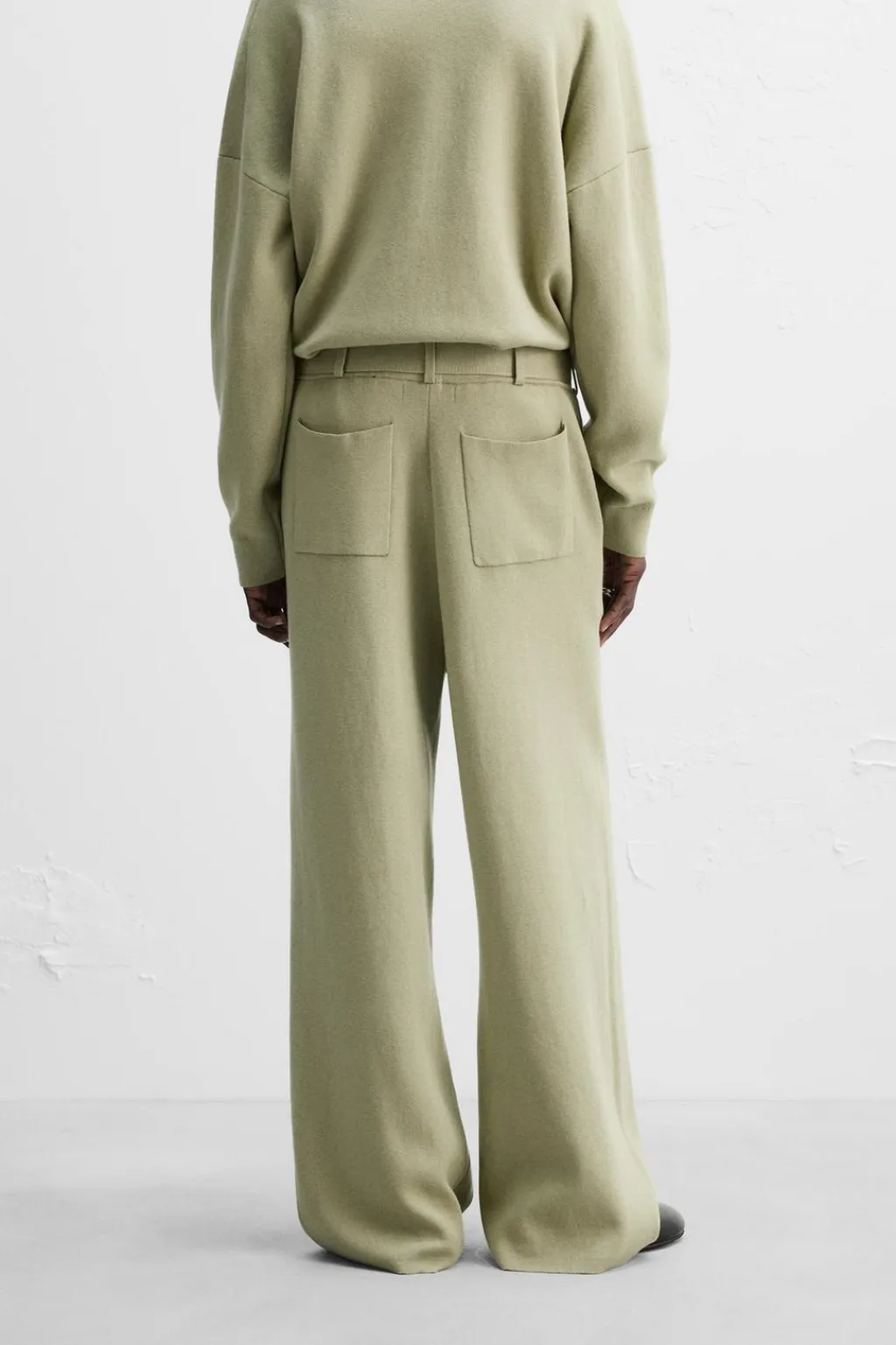 Pantalón relaxed fit de punto tejido en hilatura con mezcla de algodón y lana. Cintura elástica ajustable con cinturón. Bolsillos frontales y detalle de bolsillos traseros de plastrón.