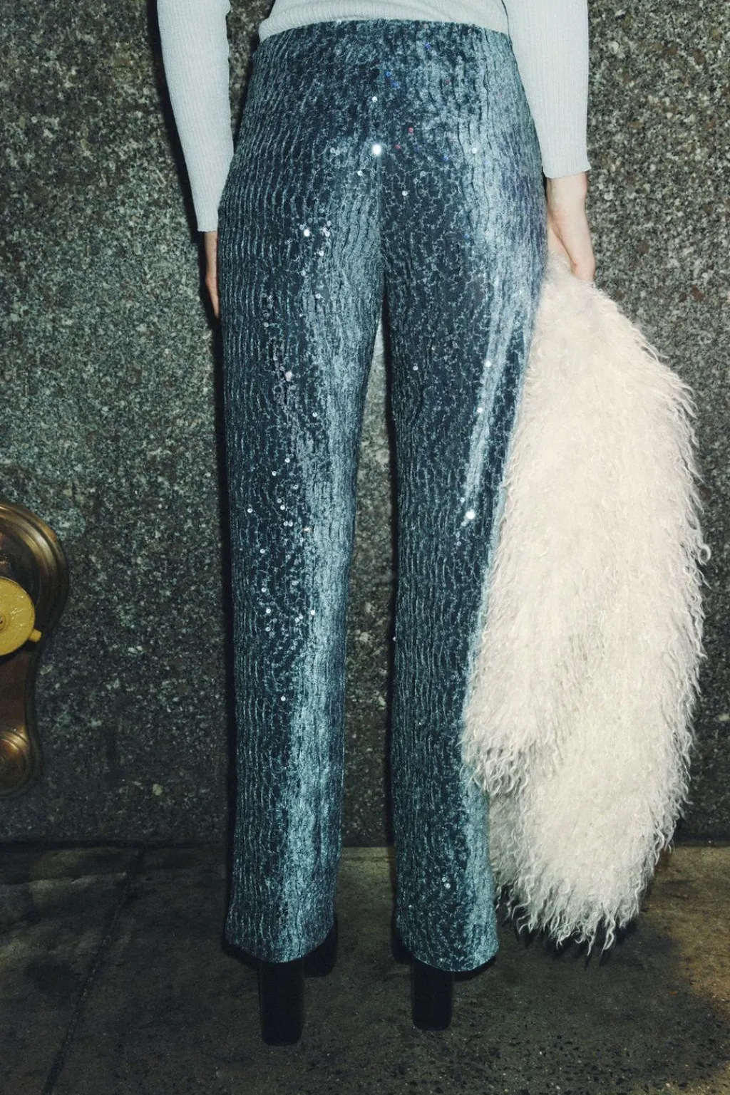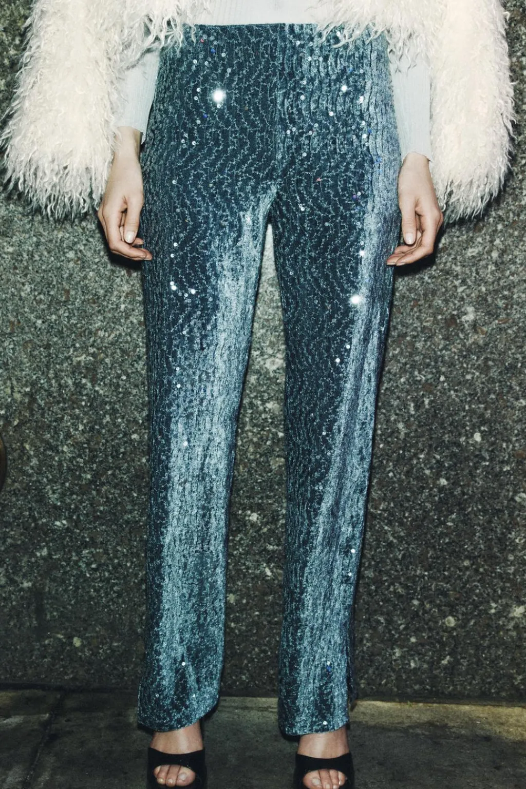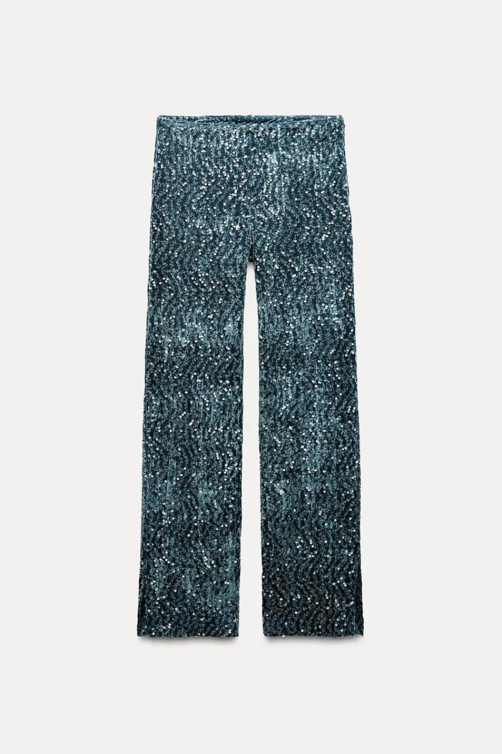 Pantalón de terciopelo con lentejuelas. Tiro alto y pernera recta con aberturas laterales. Cierre lateral con cremallera oculta en costura.
