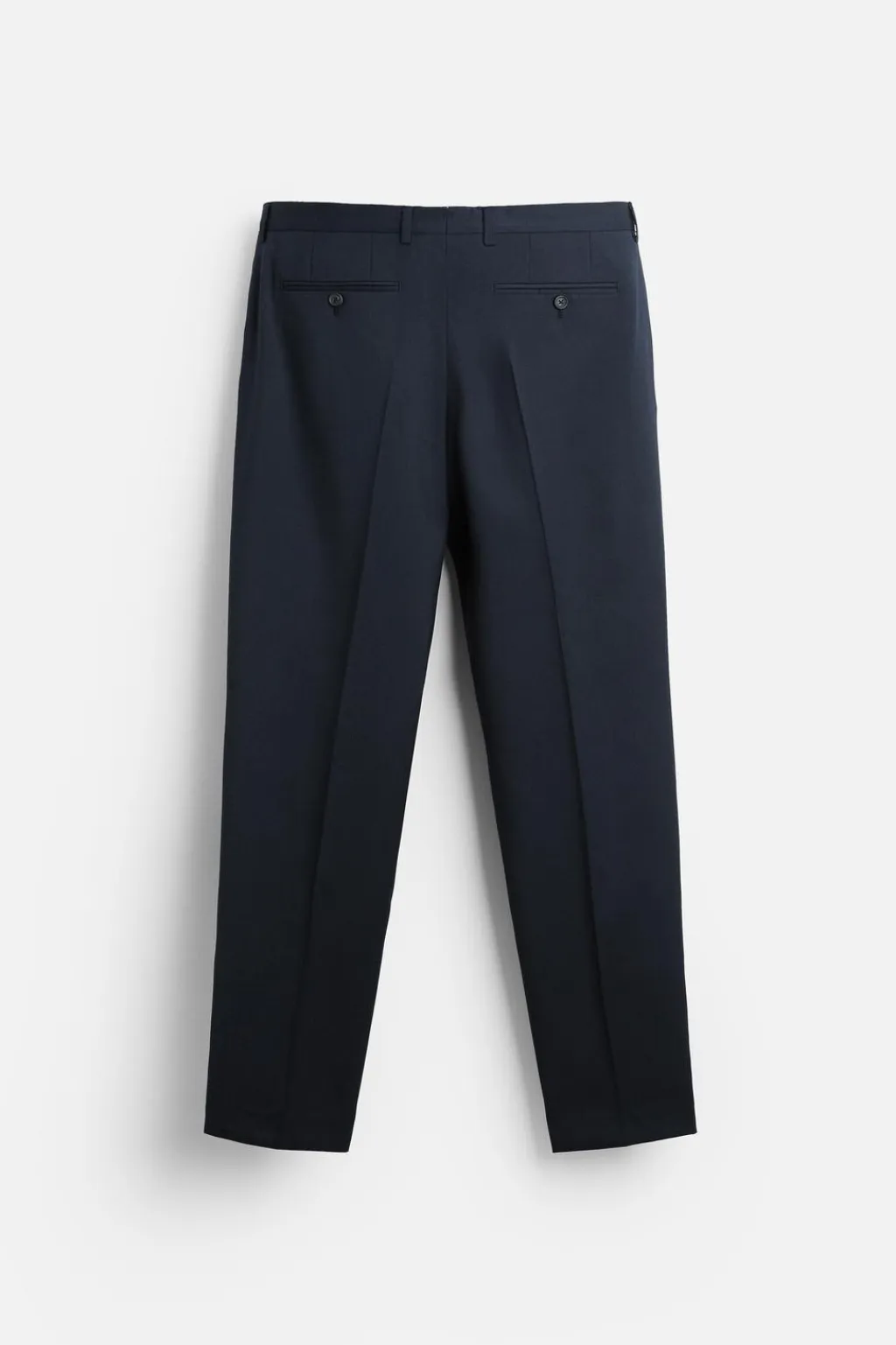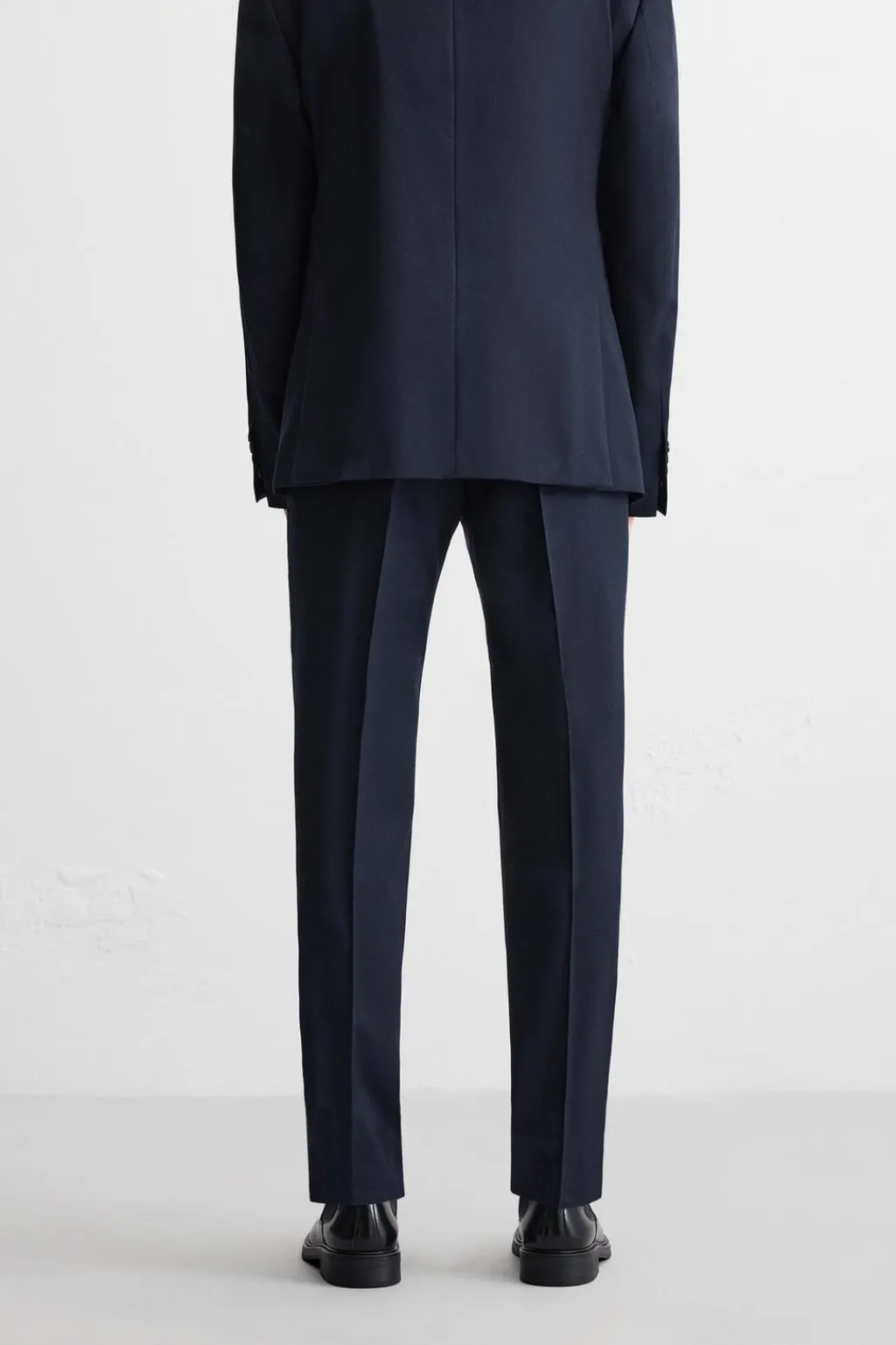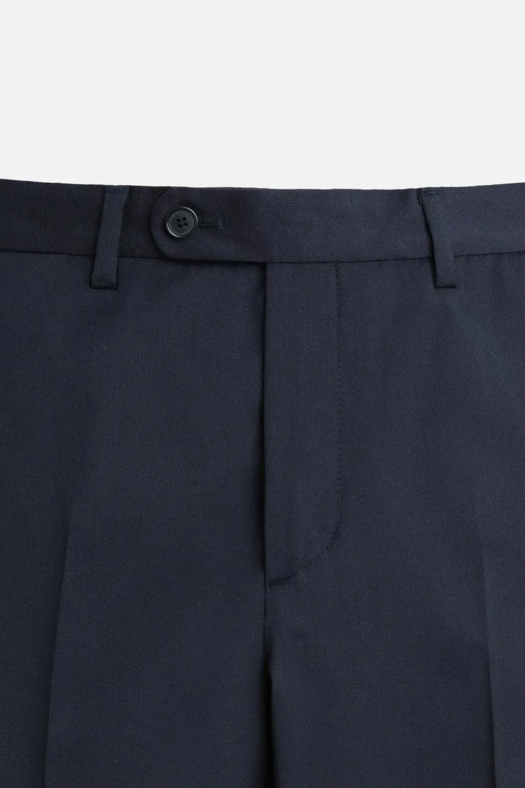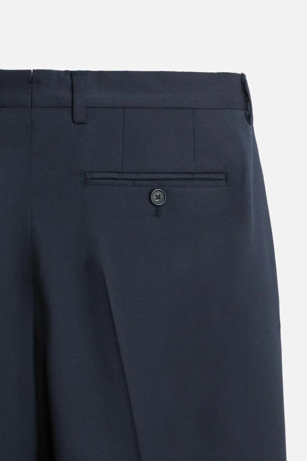 Pantalón slim fit confeccionado en tejido de lana italiana. Bolsillos frontales y detalle de bolsillos traseros de doble vivo con botón. Cierre frontal con cremallera y botón cruzado.