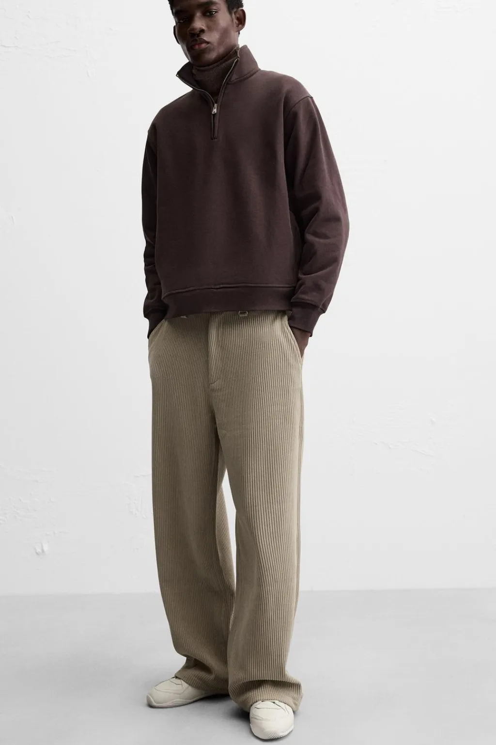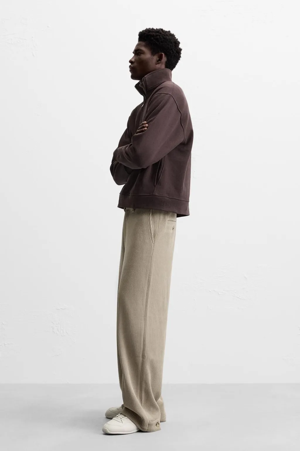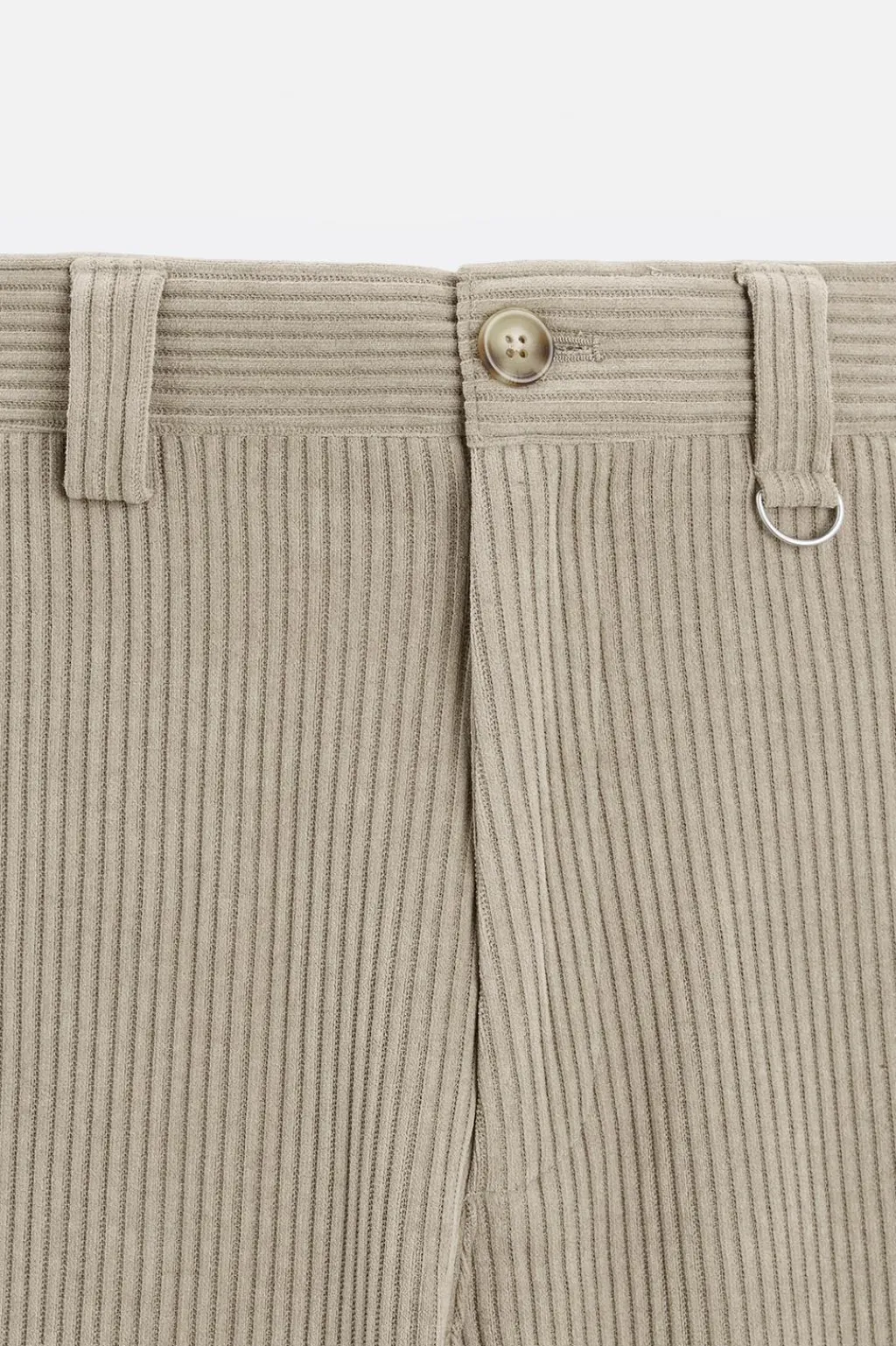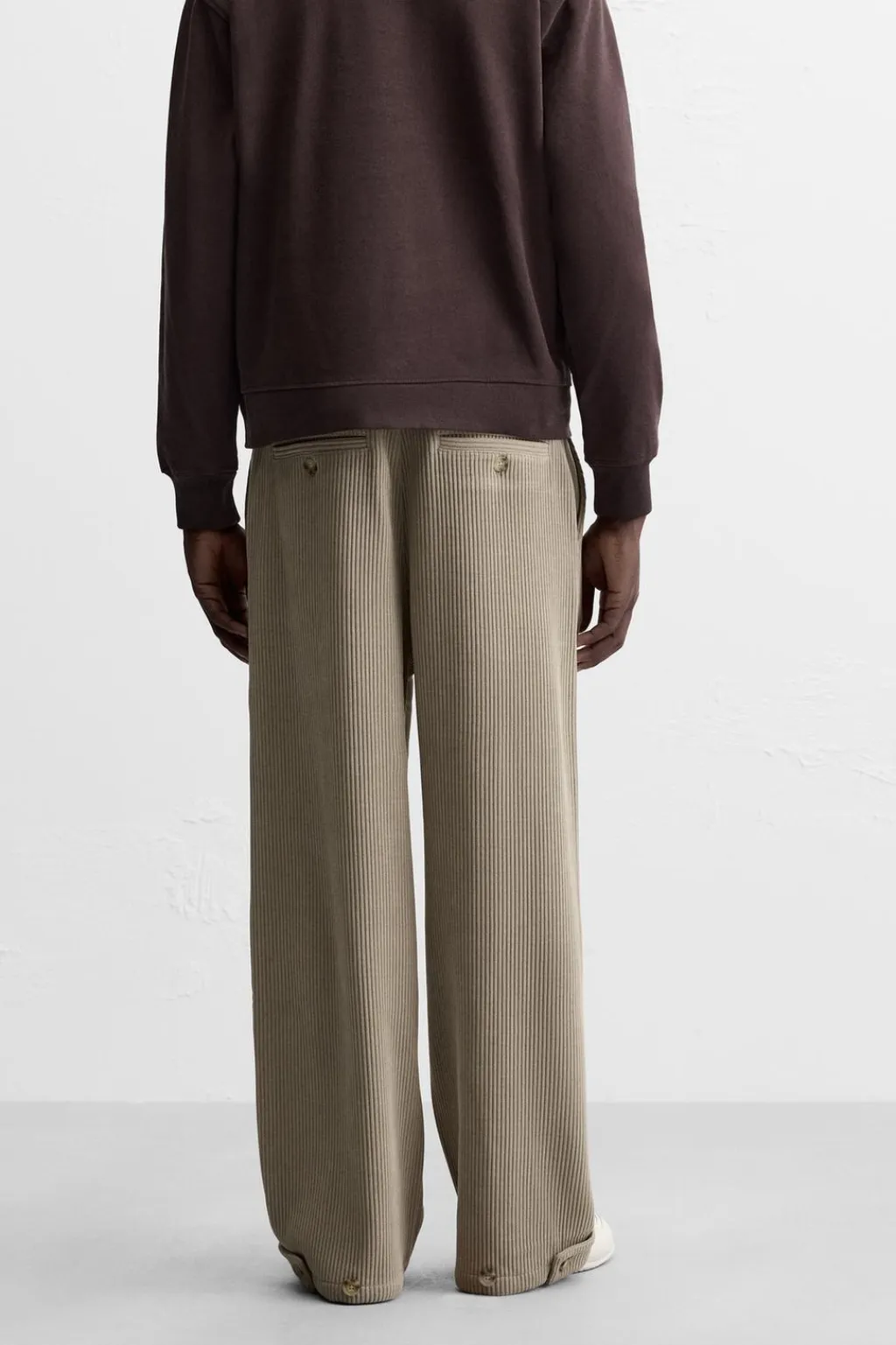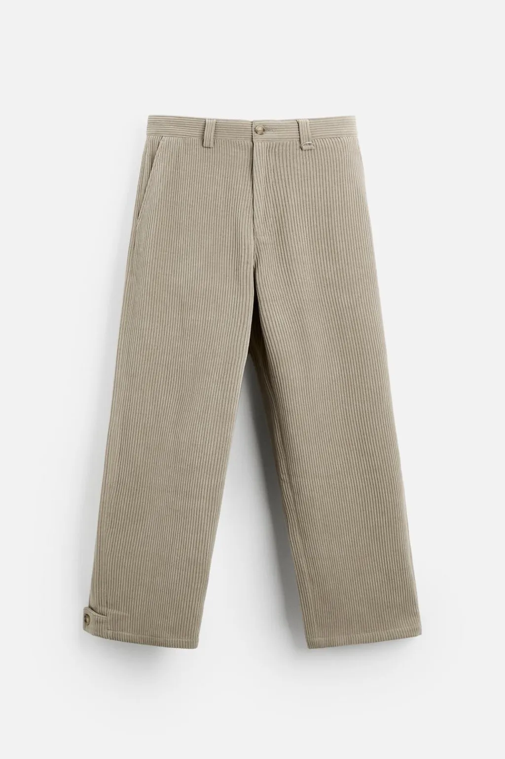 Pantalón wide fit confeccionado en tejido de pana. Bolsillos delanteros y detalle de bolsillos traseros de vivo. Bajo ajustable mediante botones. Cierre frontal de cremallera y botón.