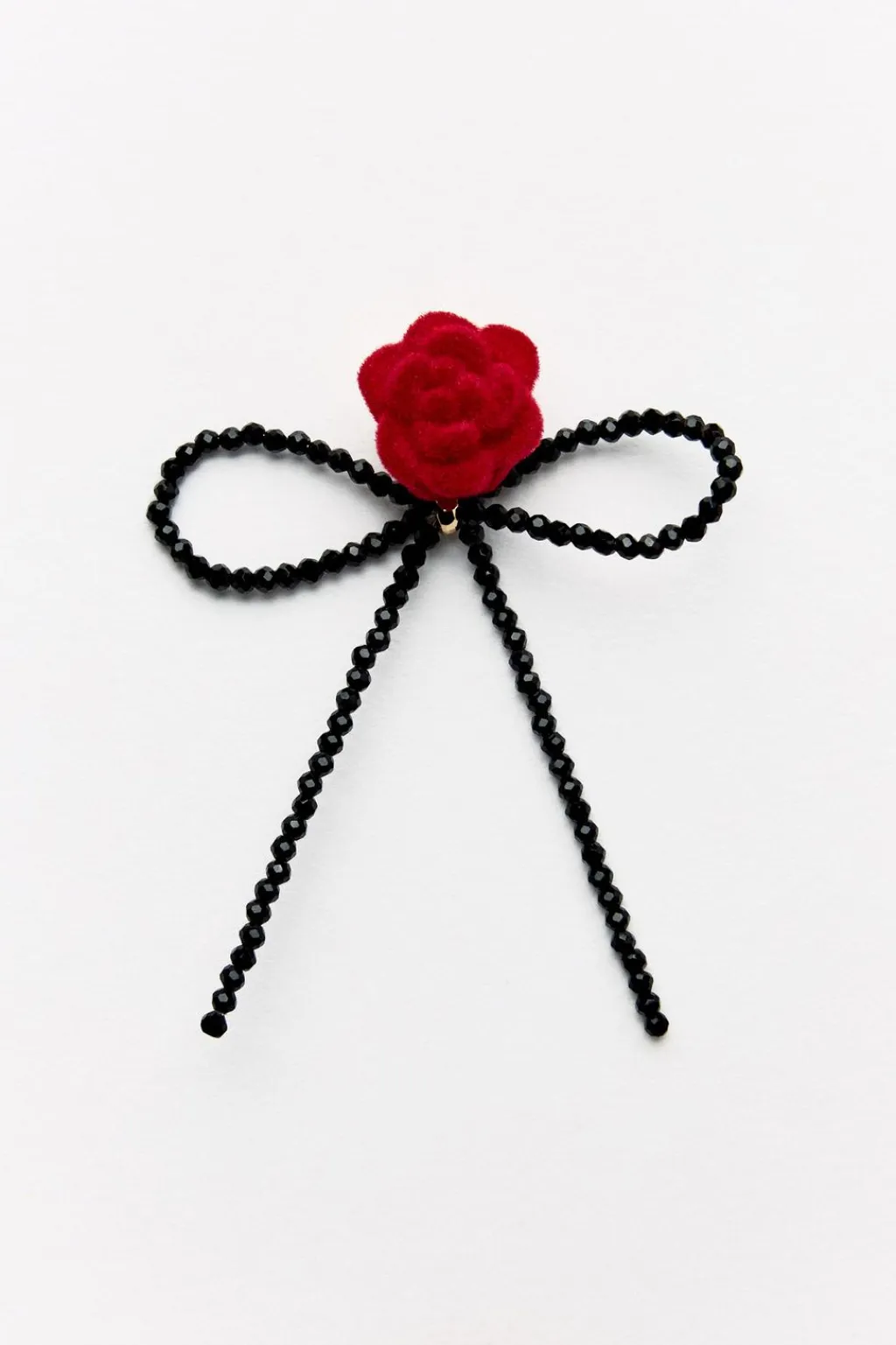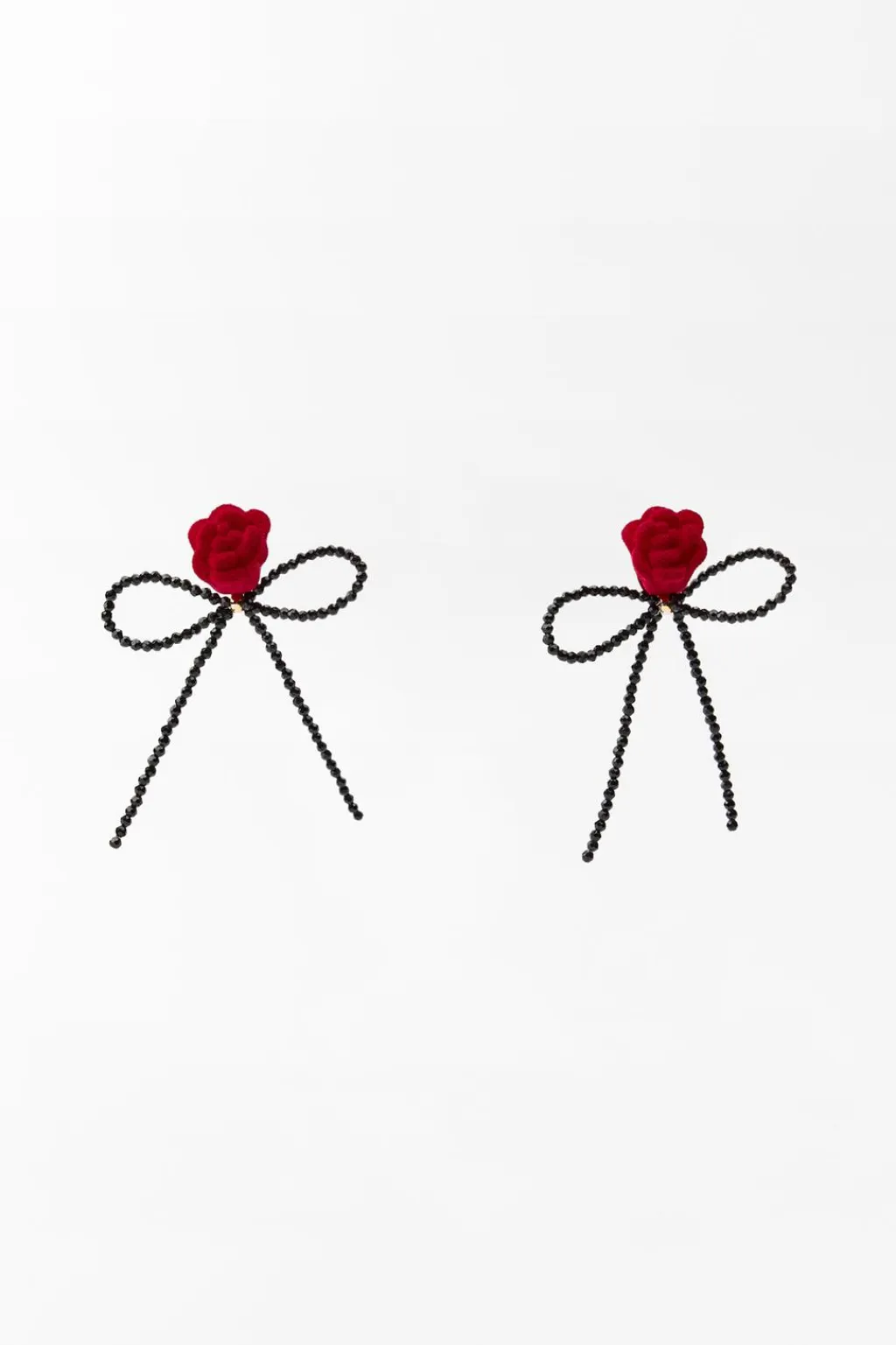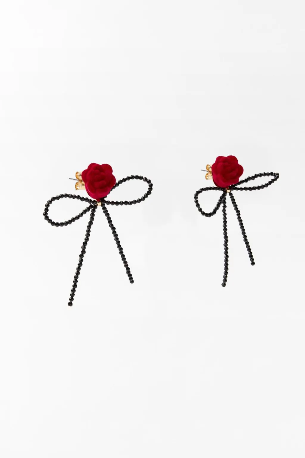 Pendientes metálicos colgantes en forma de lazo con abalorios y aplicación de flor a color forrada combinada a contraste. Cierre con tuerca.