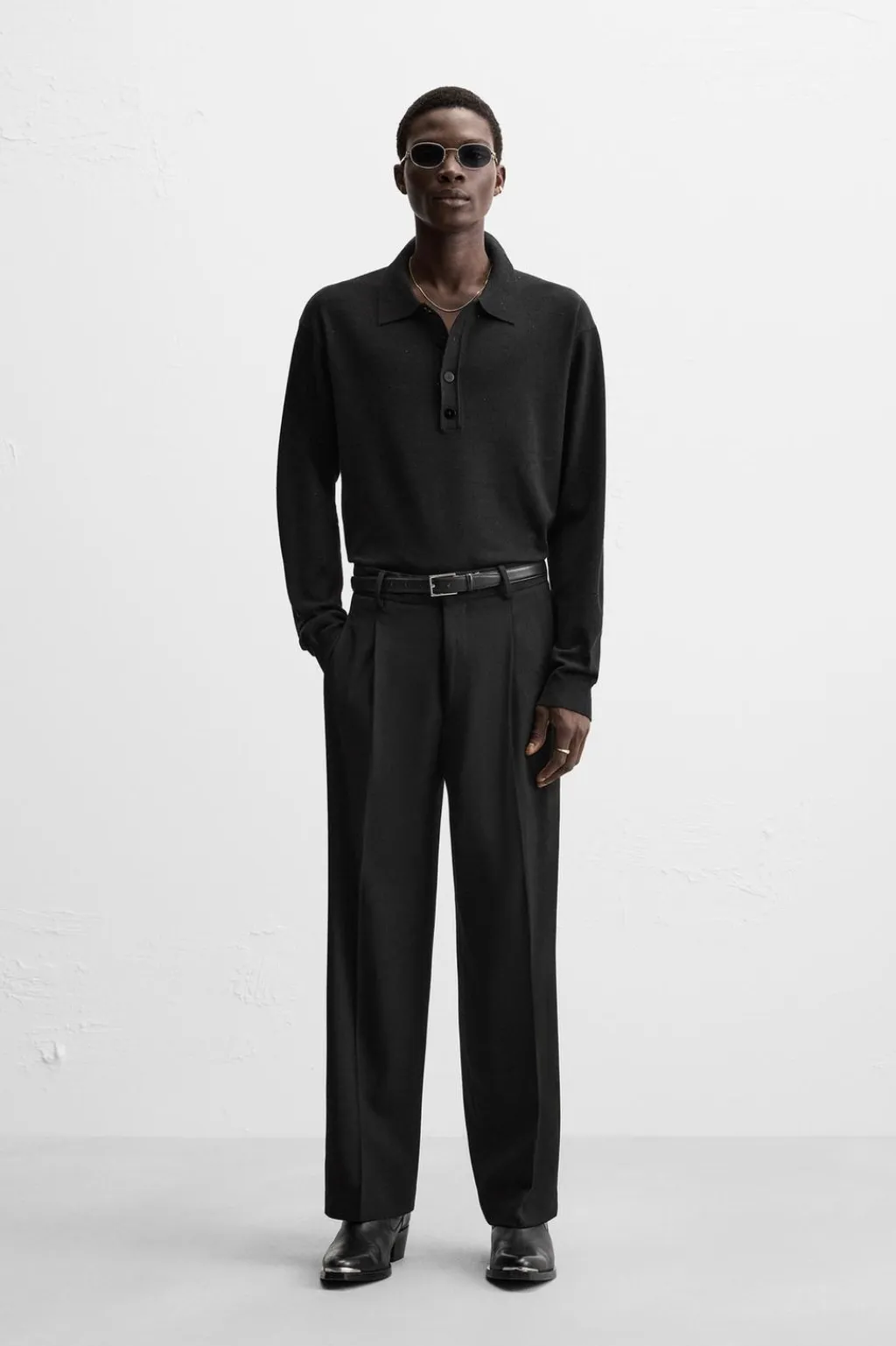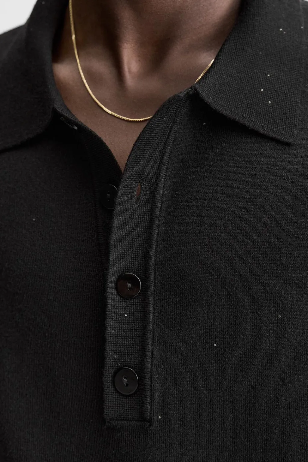 Polo de punto relaxed fit tejido en hilatura con lentejuelas. Cuello solapa con cierre frontal de botonadura. Manga larga. Acabados en rib.