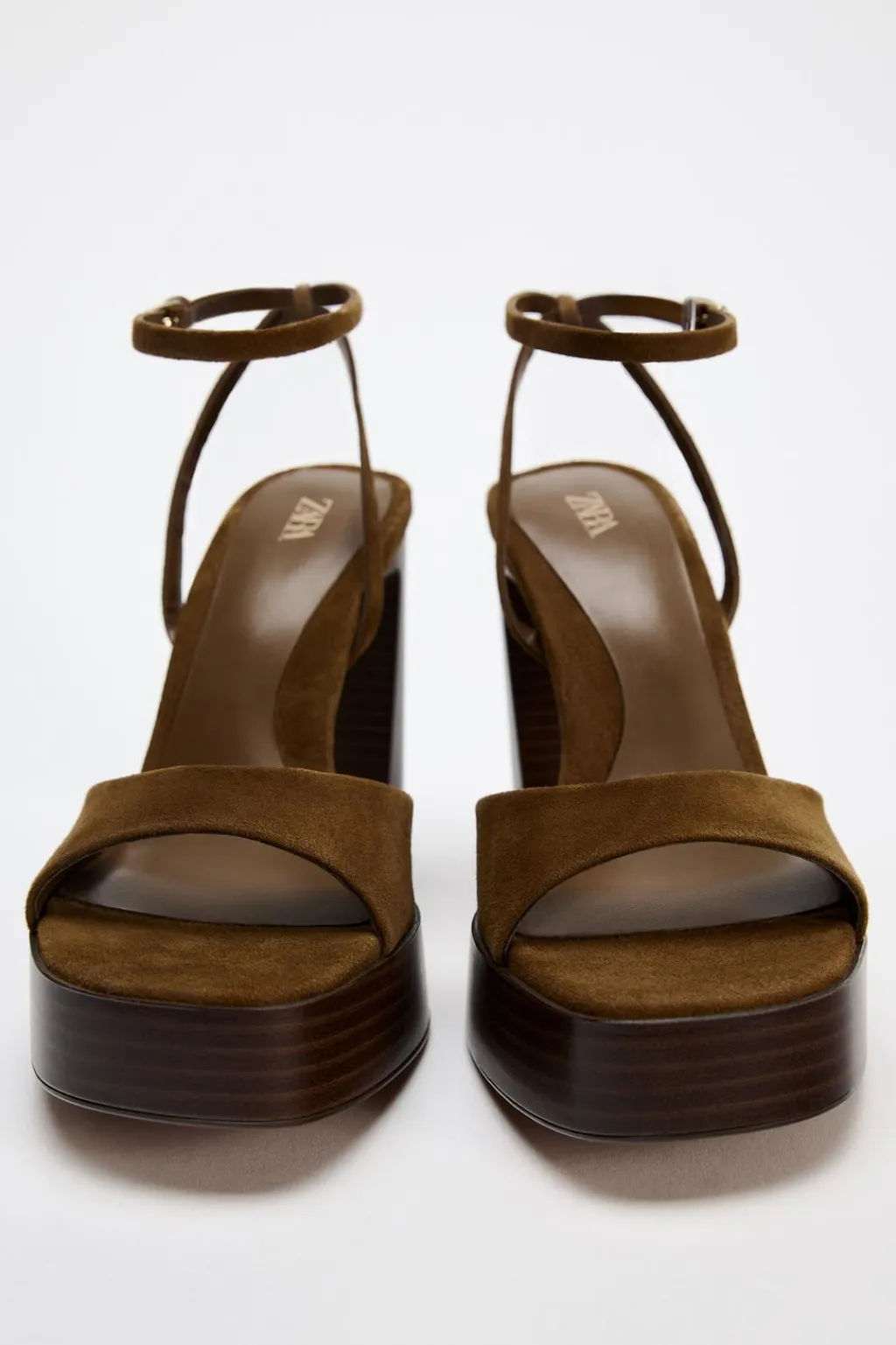 Zapato tipo sandalia de tacón con plataforma. Tira en la parte delantera. Cierre mediante hebilla en la pulsera al tobillo.