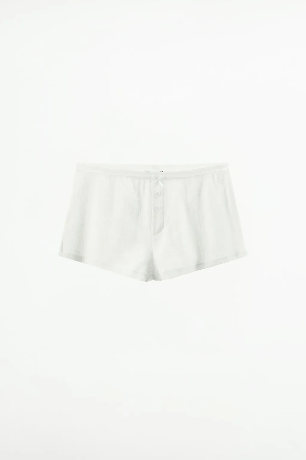 Shorts confeccionado en hilatura de algodón 100%. Tiro medio y cintura elástica. Detalle aplicación de lazo y botones en delantero combinado a tono.