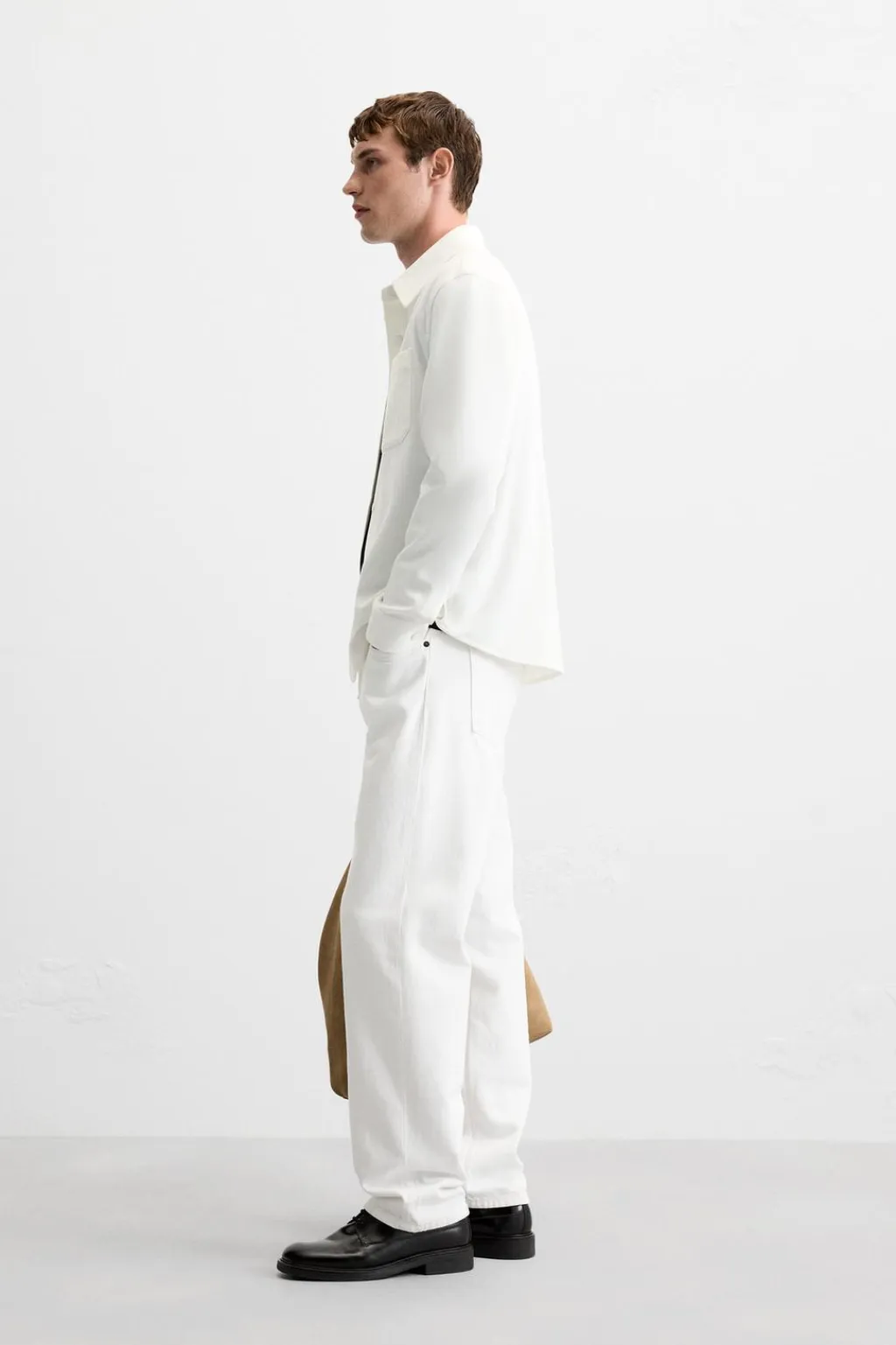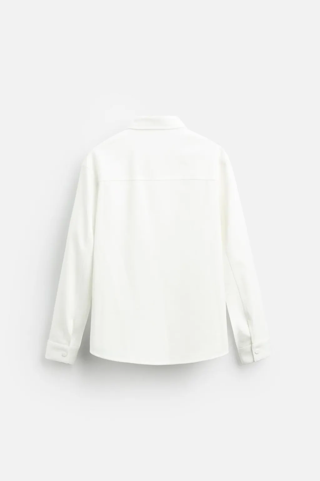 Sobrecamisa confeccionada en tejido con elasticidad. Cuello solapa y manga larga acabada en puño con botón a presión. Bolsillos de plastrón en pecho. Cierre frontal con botones a presión.