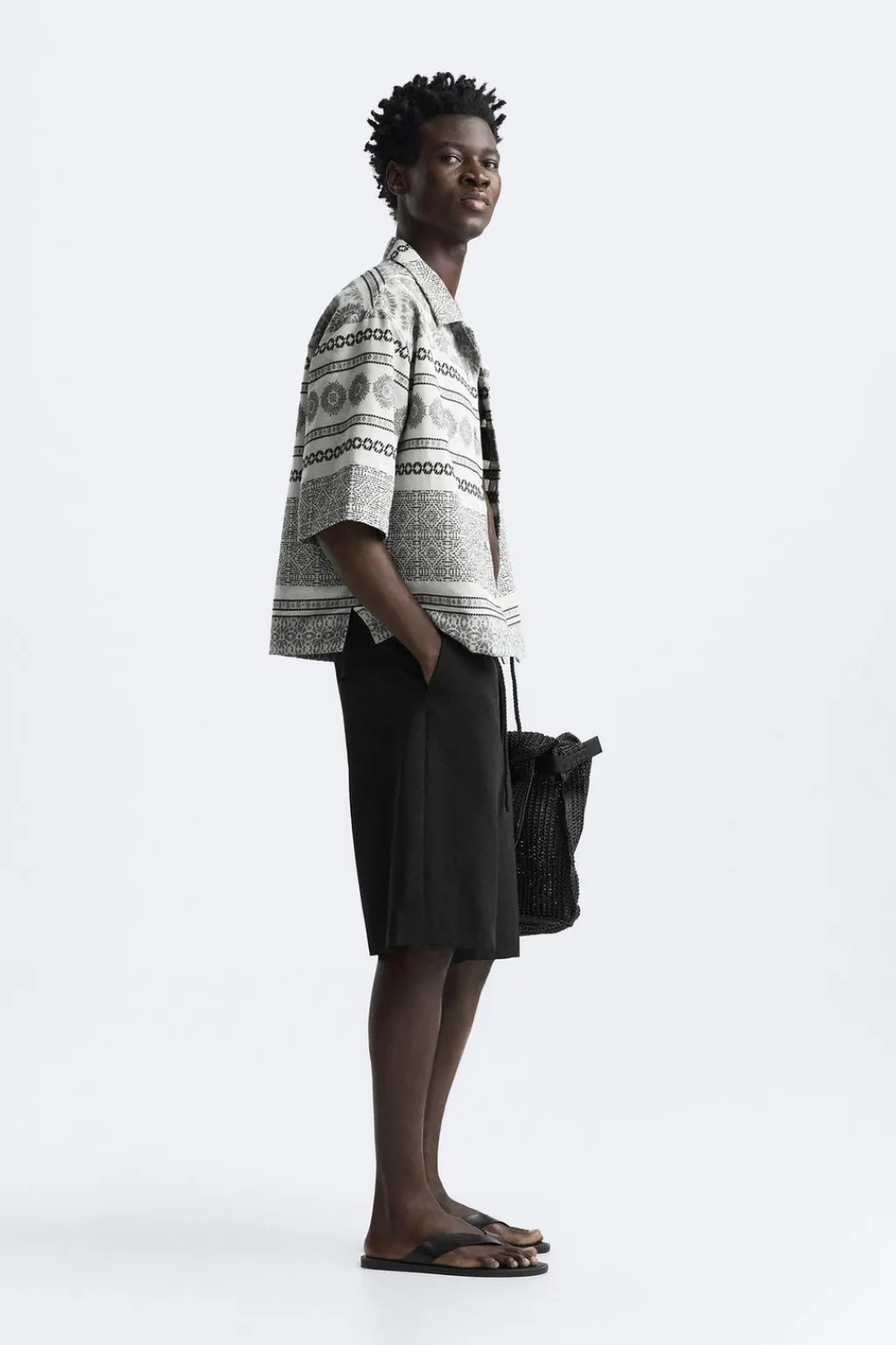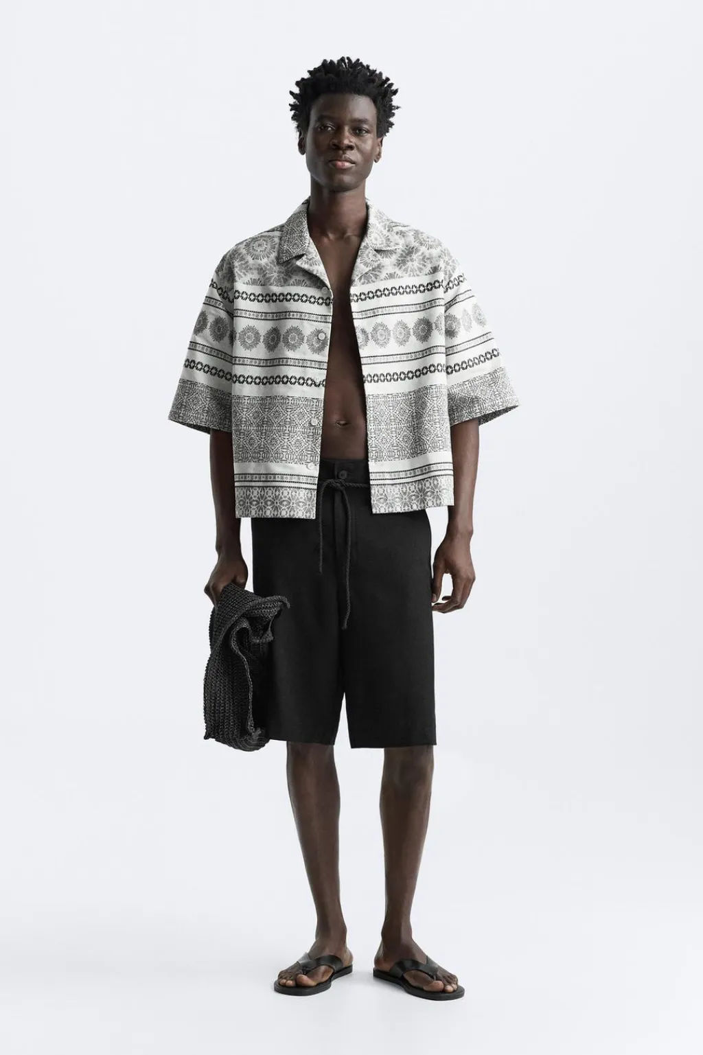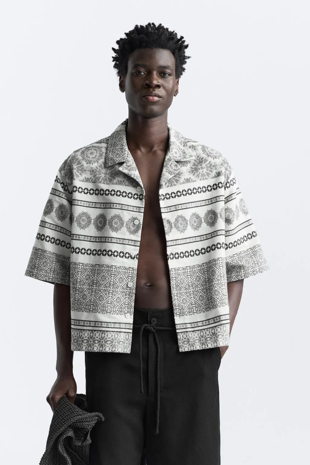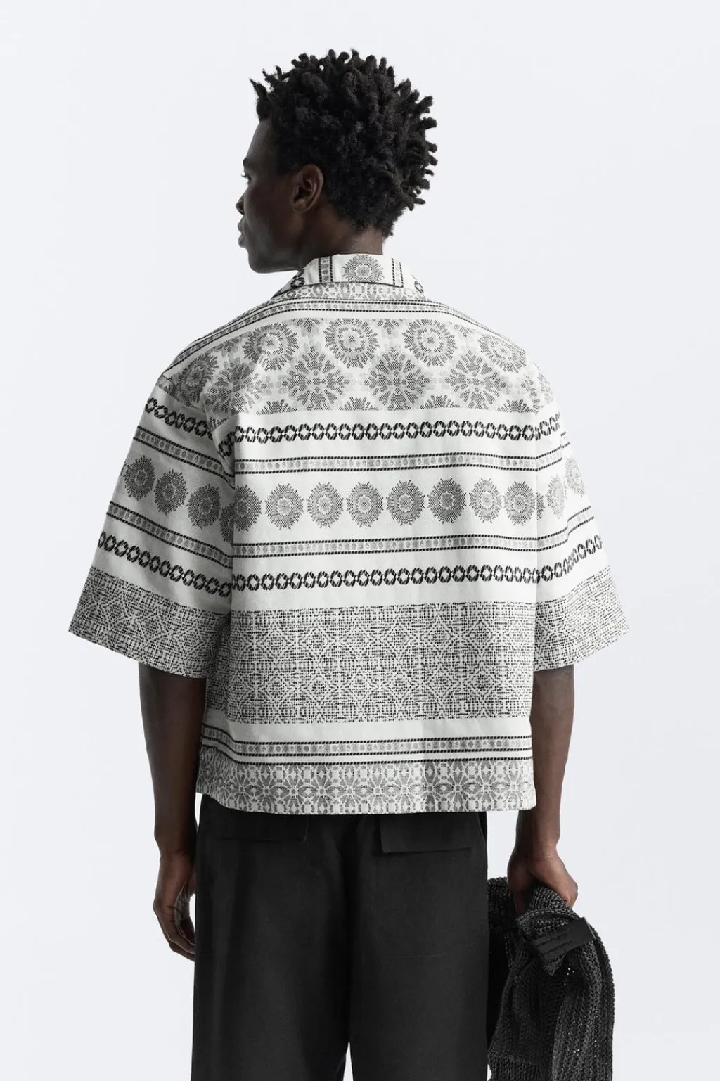 Sobrecamisa boxy fit. Cuello bowling y manga corta. Bajo con aberturas laterales. Cierre frontal de botonadura.