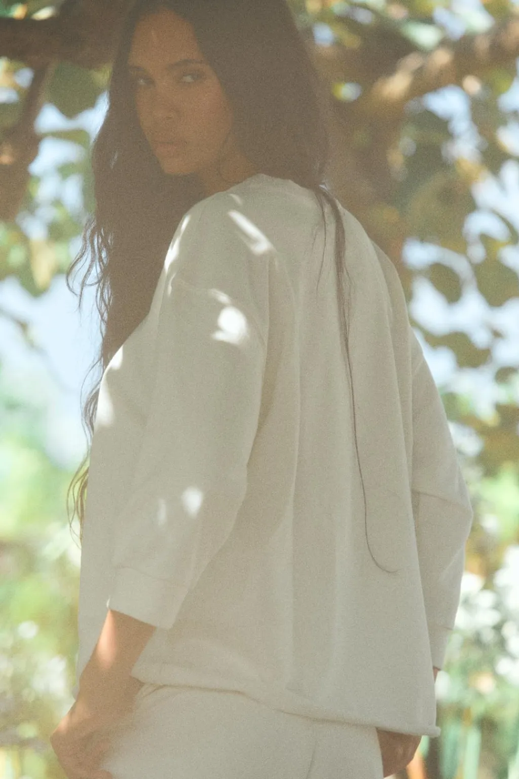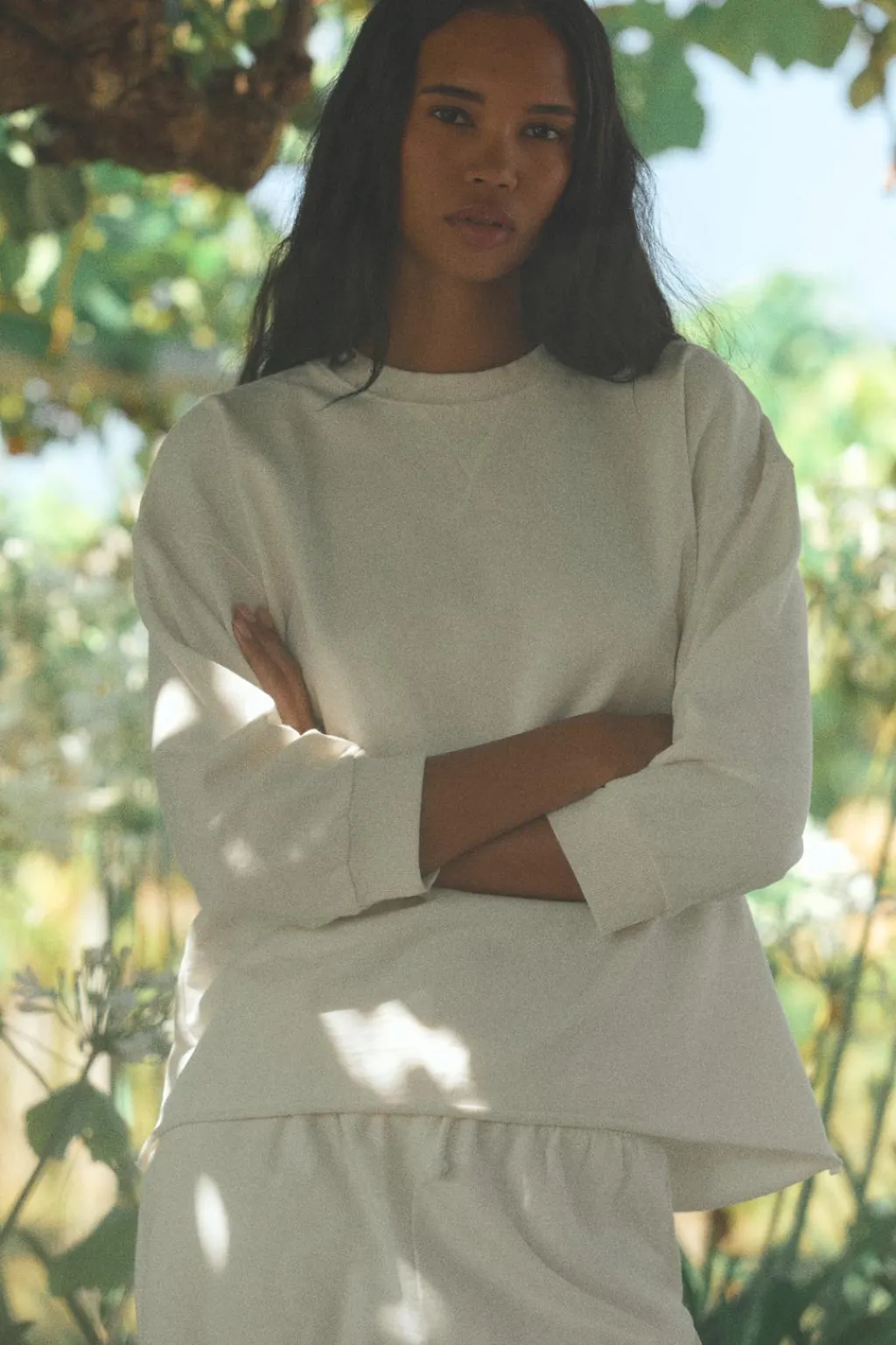 Sudadera de cuello redondo y manga por debajo del codo con hombro caído. Tejido efecto lavado. Acabados en rib.