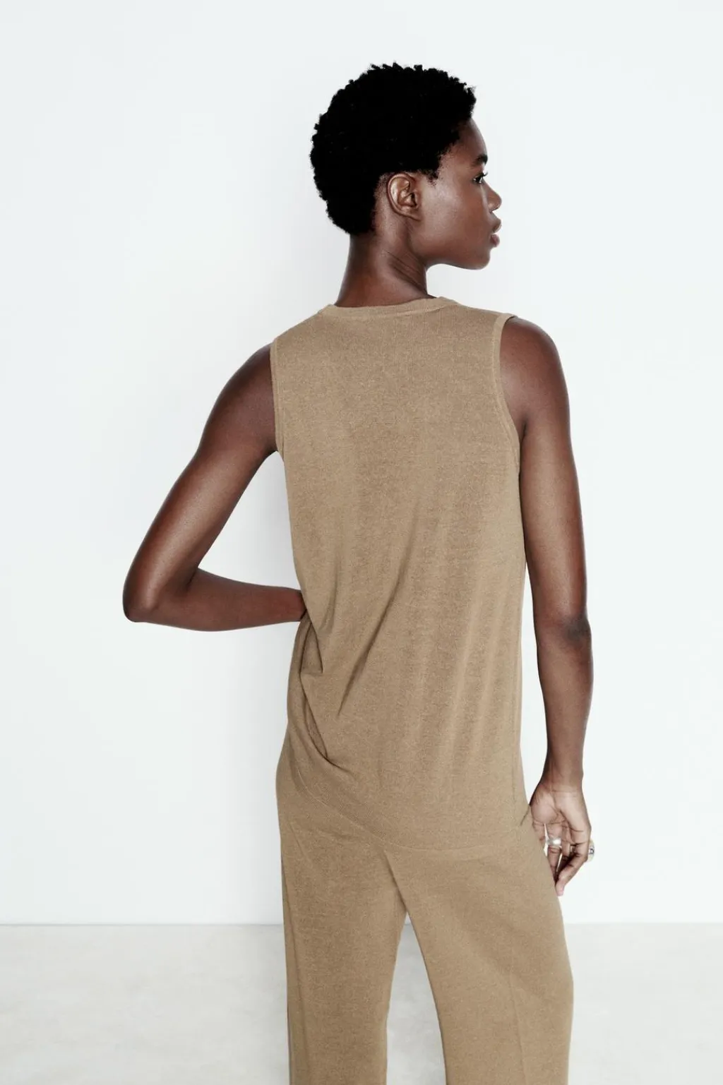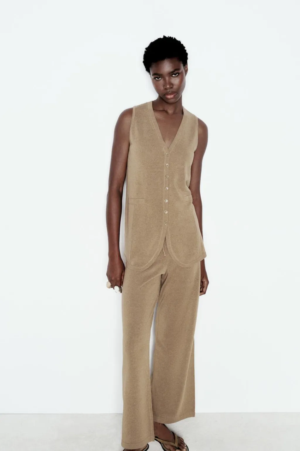 Top chaleco de escote pico y manga sisa. Falsos bolsillos de vivo delanteros. Cierre frontal con botones.
